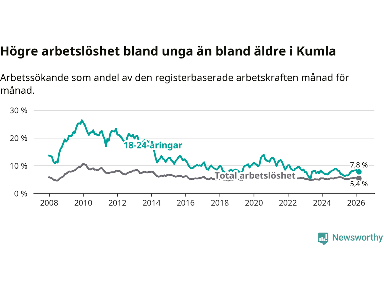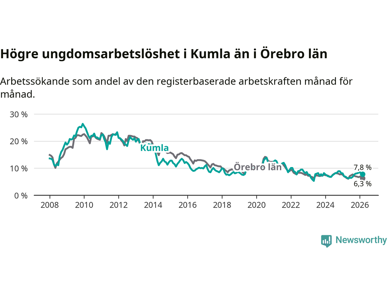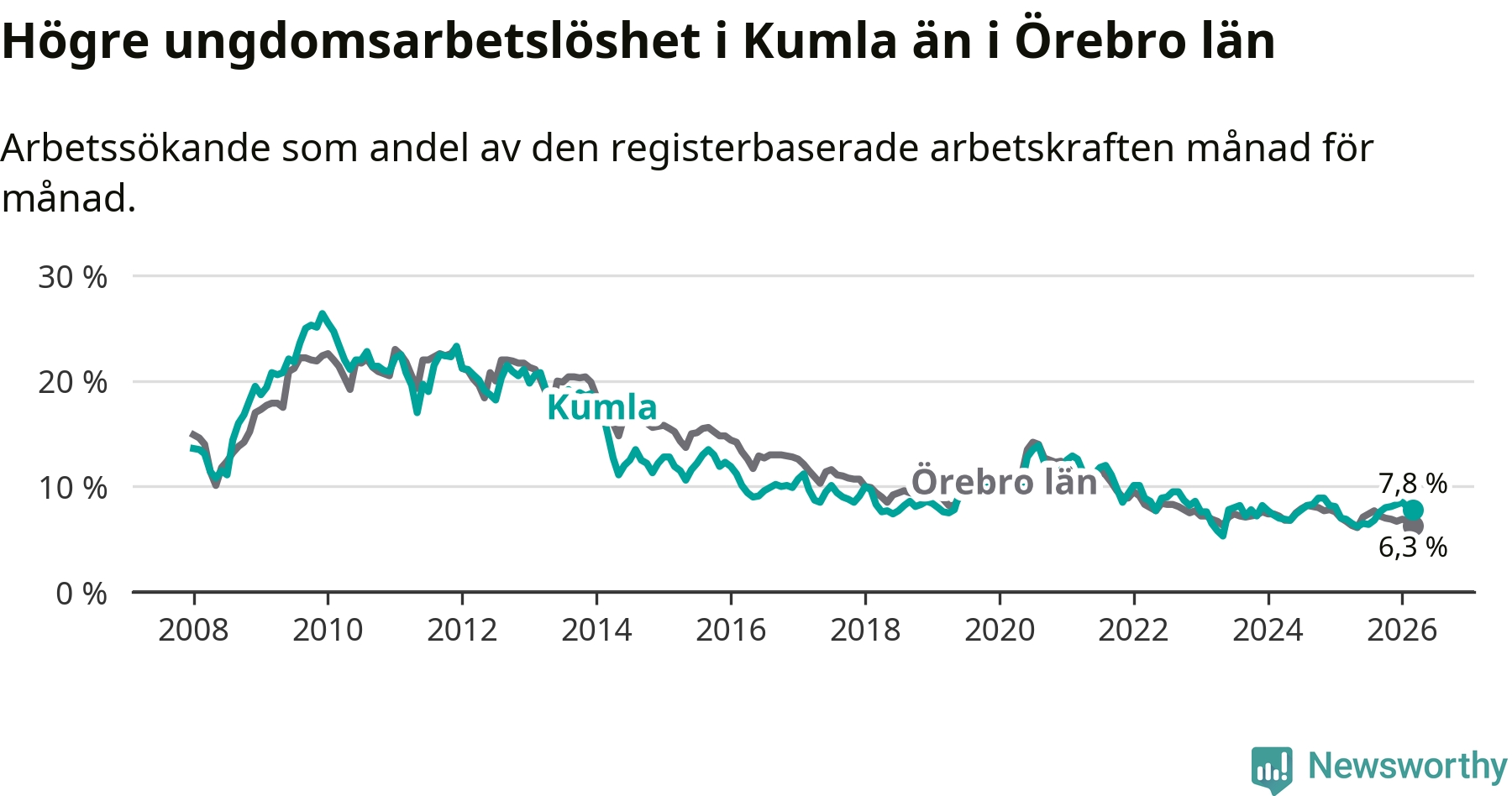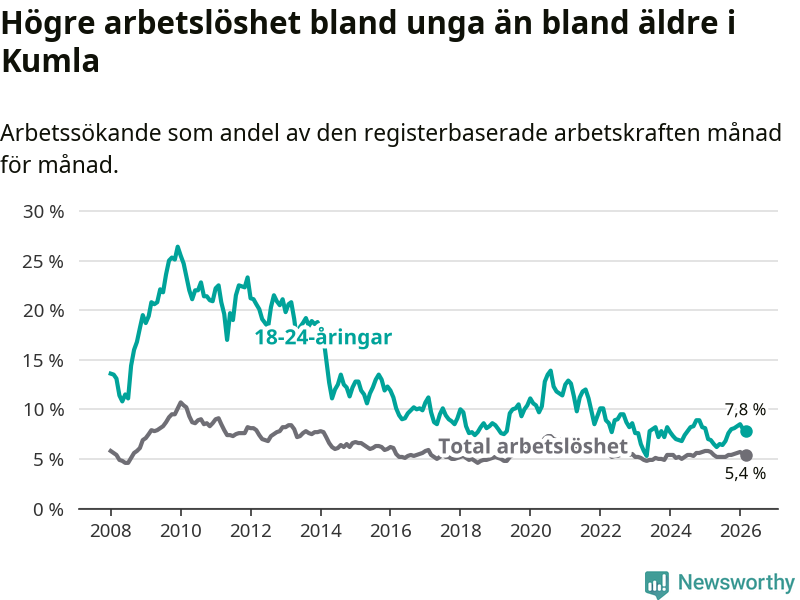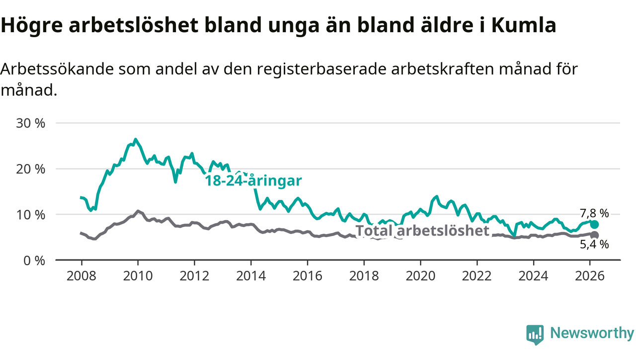 Medan Kumla har lägre total arbetslöshet än Örebro, ligger ungdomsarbetslösheten 1,5 procentenheter högre i Kumla.