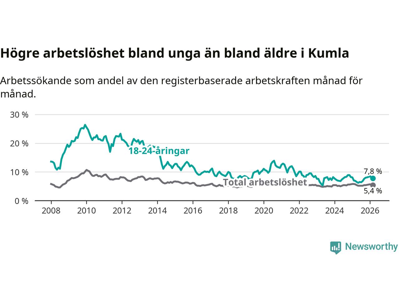 Till skillnad från den totala arbetslösheten stiger arbetslösheten bland unga (+0,9 procentenheter). I mars var 7,8 procent av 18–24-åringarna inskrivna som arbetssökande (motsvarande 81 personer). Mäter vi antalet inskrivna ser vi en ökning med fem personer på ett års sikt.