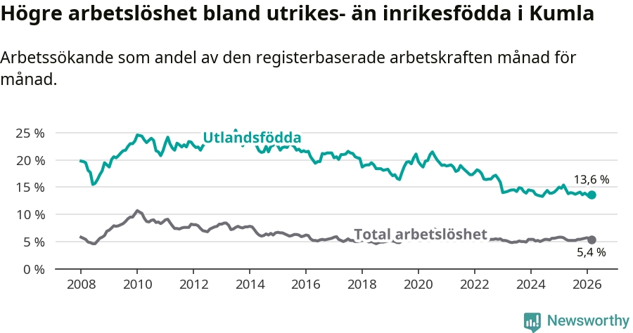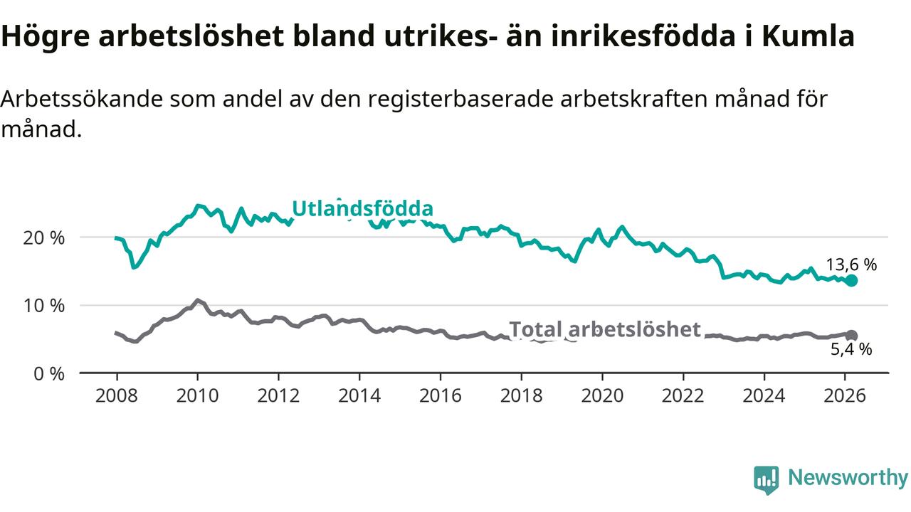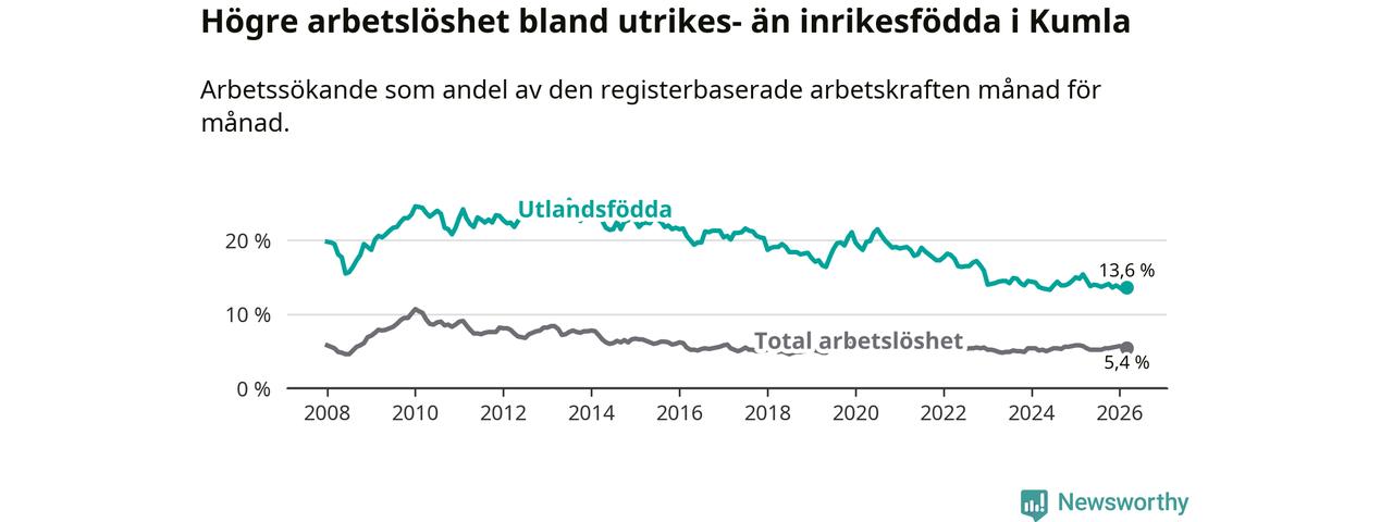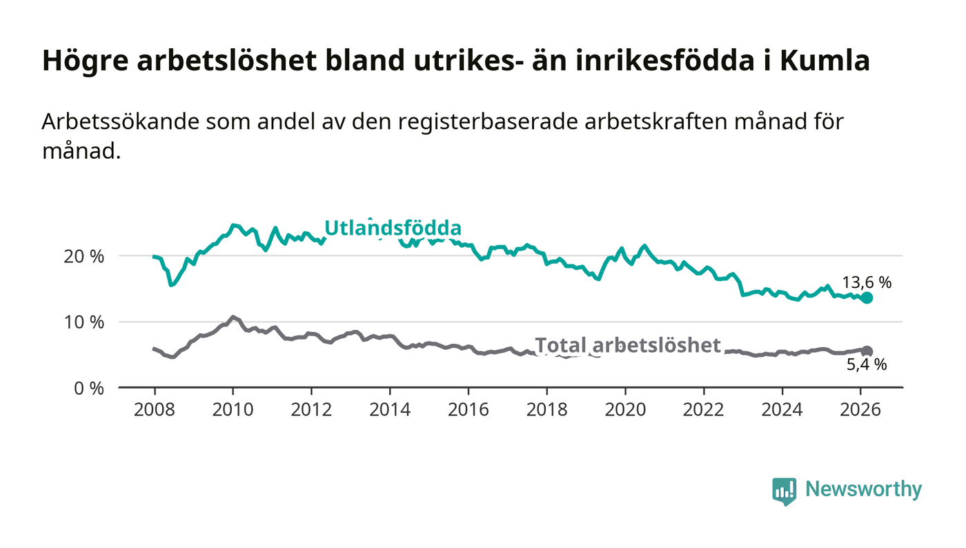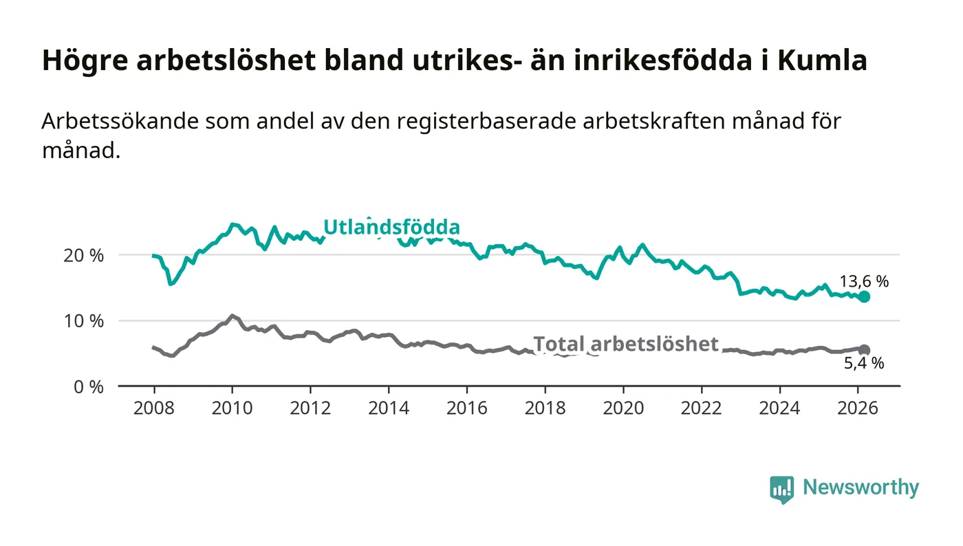 Arbetslösheten bland utlandsfödda var 13,6 procent i Kumla under mars månad, motsvarande 280 av 2 059 personer. Det är 1,8 procentenheter färre än vid samma tidpunkt i fjol (−26 om man räknar personer).