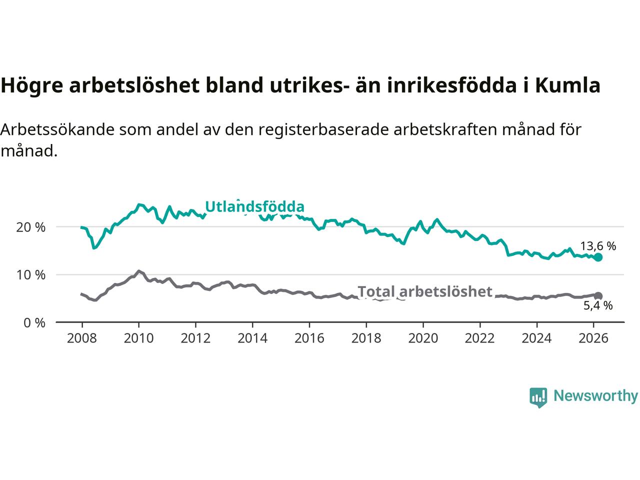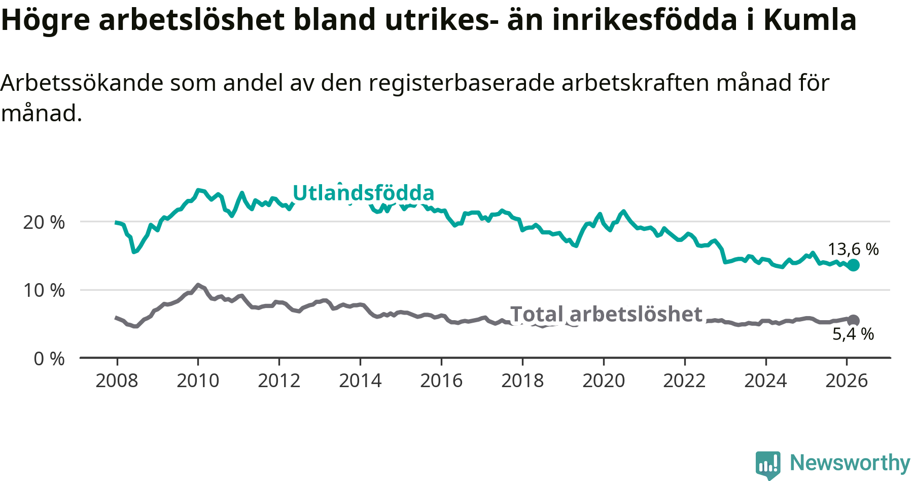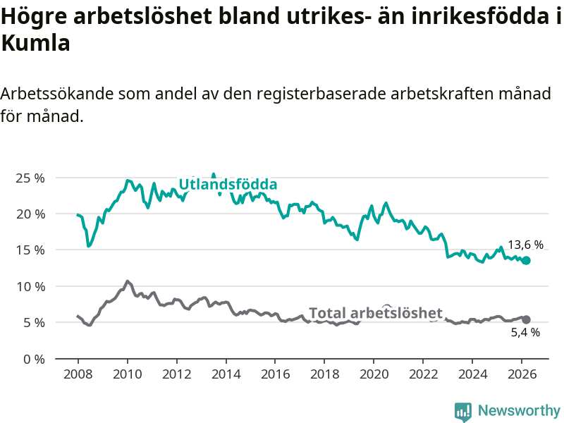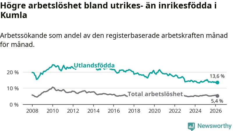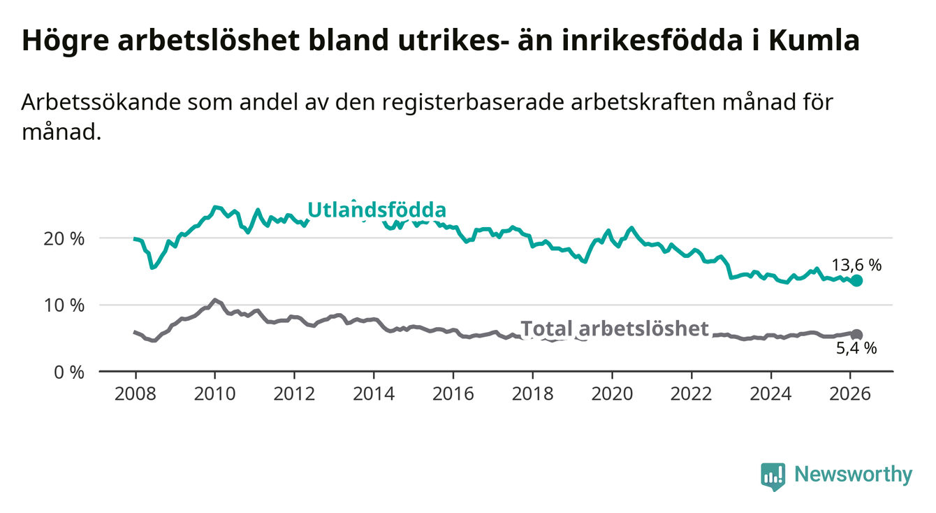 Arbetslösheten bland utlandsfödda var 13,6 procent i Kumla under mars månad, motsvarande 280 av 2 059 personer. Det är 1,8 procentenheter färre än vid samma tidpunkt i fjol (−26 om man räknar personer).