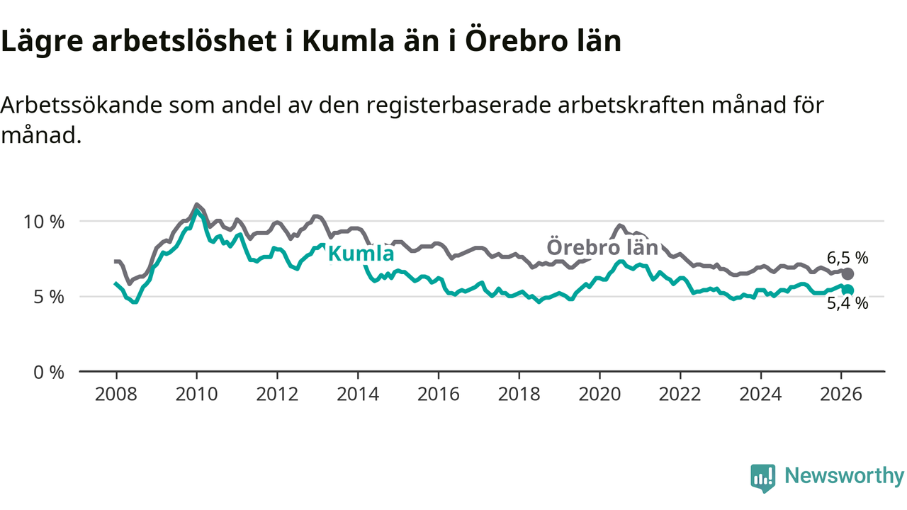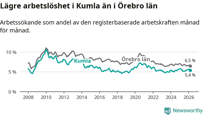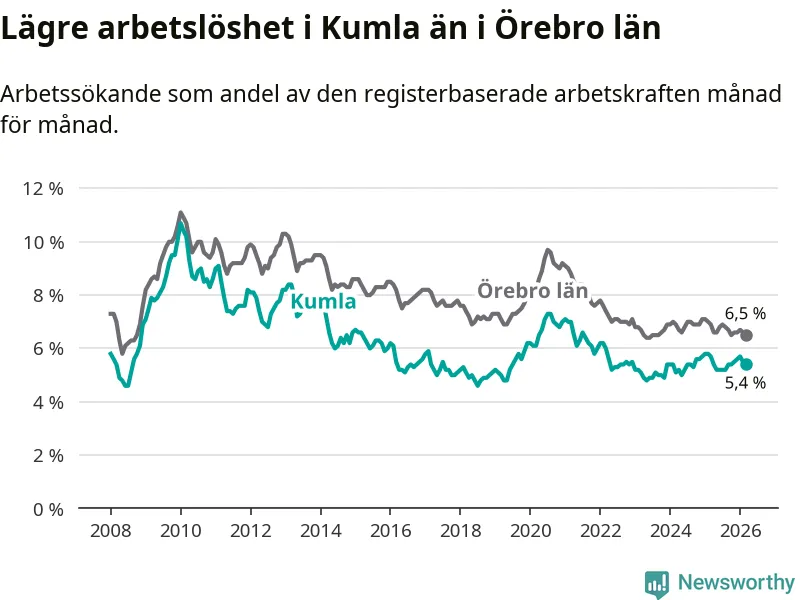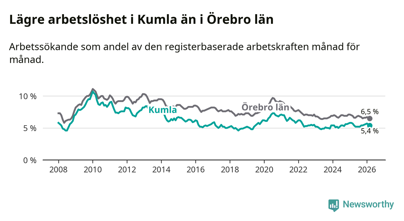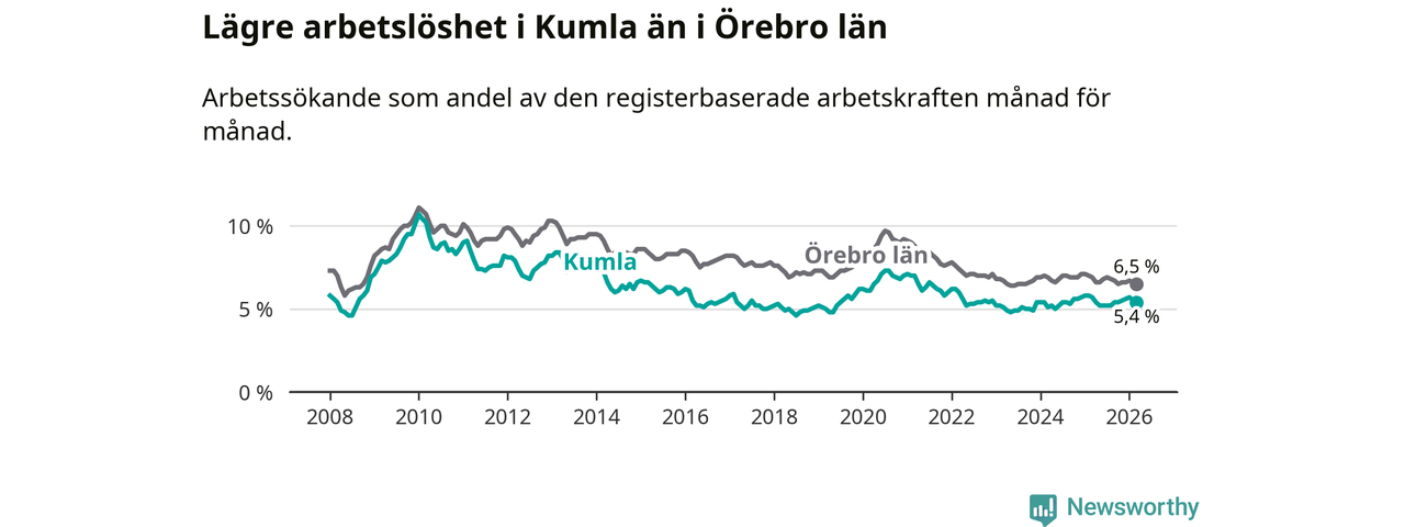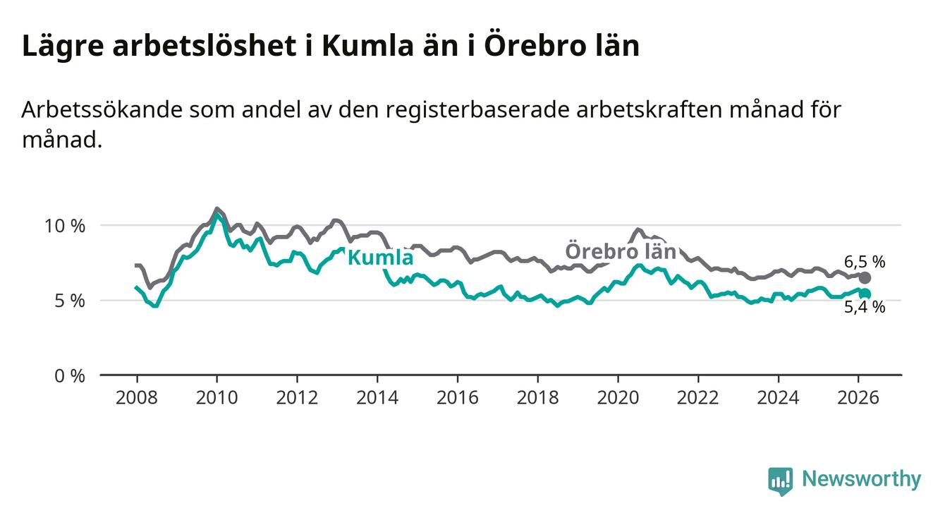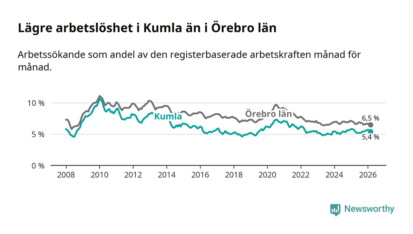 Kumla hade redan tidigare lägre arbetslöshet än snittet i hela Örebro län och nu växer klyftan (5,4 procent i kommunen, jämfört med 6,5 procent i hela länet). Askersund och Lekeberg har den lägsta arbetslösheten i länet (4,0 procent), medan Ljusnarsberg har den högsta (7,6 procent). För att Kumla skulle komma ner i samma arbetslöshetsnivå som Askersund och Lekeberg skulle 159 personer behöva sysselsättas.