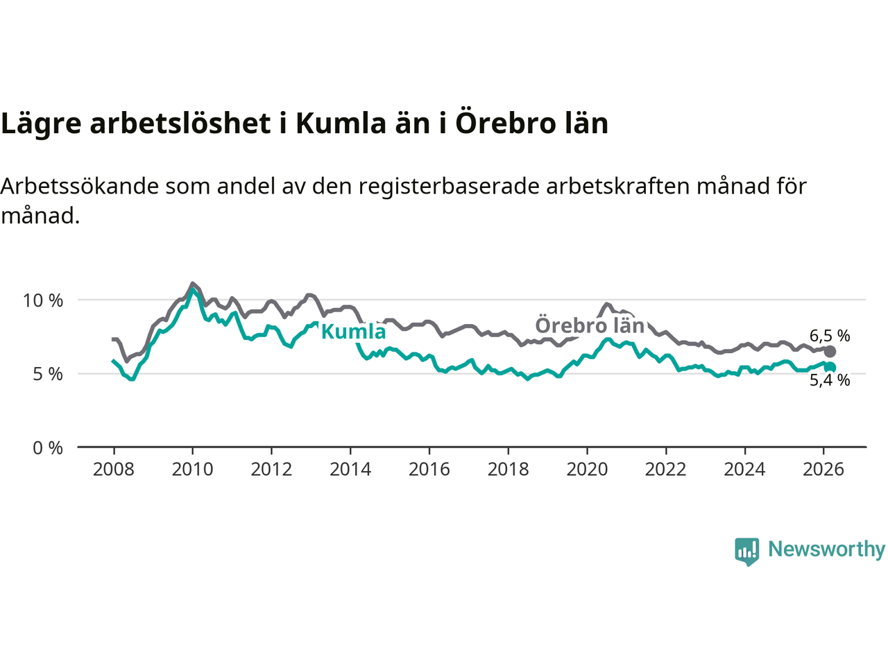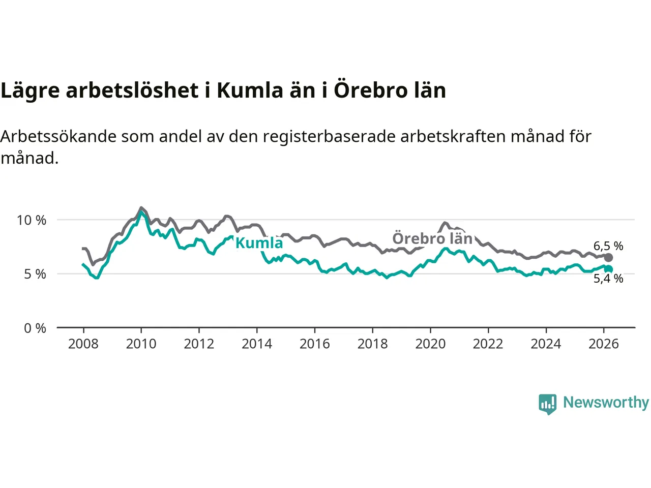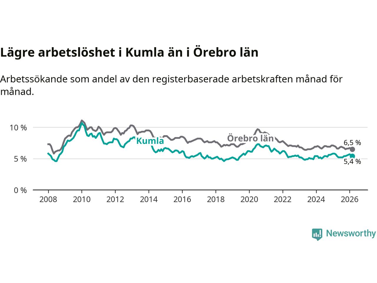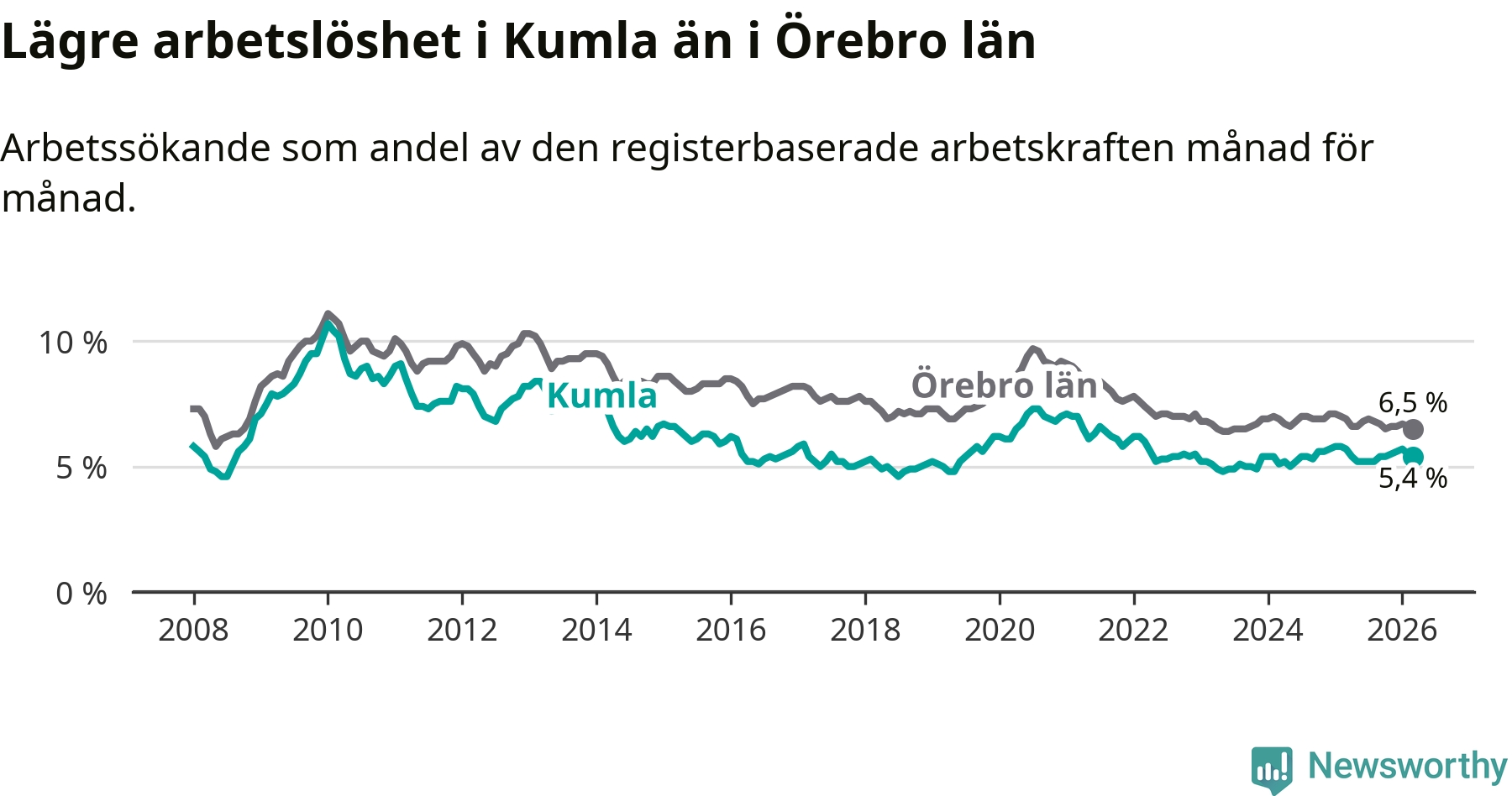 Kumla hade redan tidigare lägre arbetslöshet än snittet i hela Örebro län och nu växer klyftan (5,4 procent i kommunen, jämfört med 6,5 procent i hela länet). Askersund och Lekeberg har den lägsta arbetslösheten i länet (4,0 procent), medan Ljusnarsberg har den högsta (7,6 procent). För att Kumla skulle komma ner i samma arbetslöshetsnivå som Askersund och Lekeberg skulle 159 personer behöva sysselsättas.