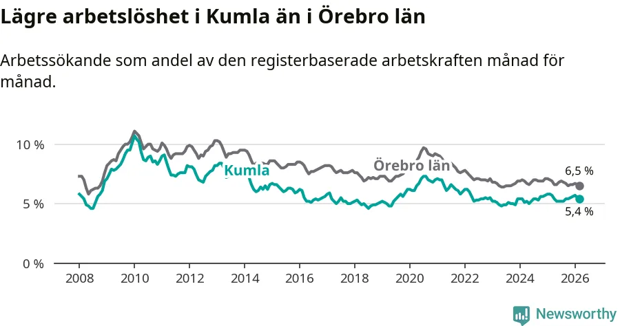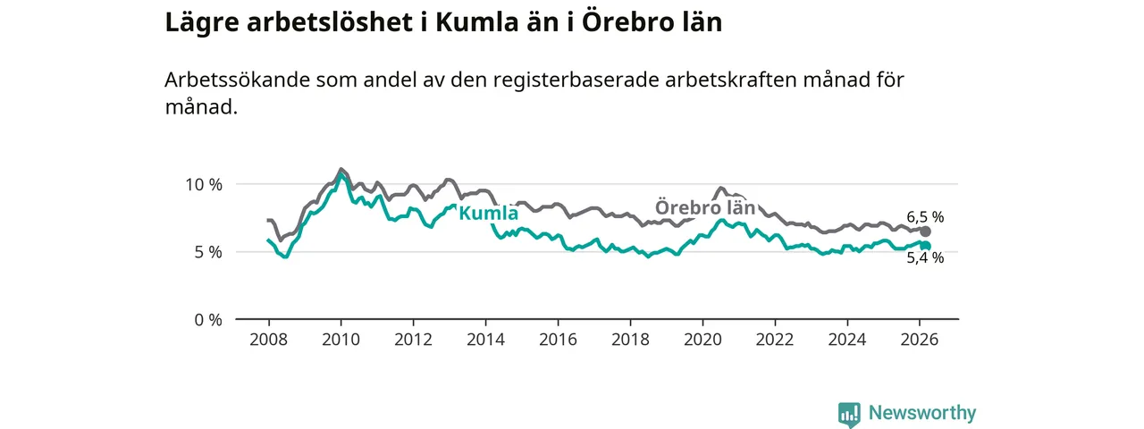 Under mars månad rapporterade Kumla kommun en total arbetslöshet på 5,4 procent. Det är en minskning jämfört med samma tidpunkt i fjol (−0,3 procentenheter). Även i Örebro län sjunker arbetslösheten .