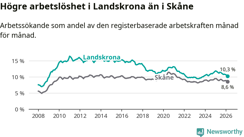 Perstorp är den kommun som har högst arbetslöshet just nu (13,1 procent) i landet som helhet, medan Gällivare har den lägsta (2,1 procent). Landskronas arbetslöshet sticker ut som den åttonde högsta i hela landet.