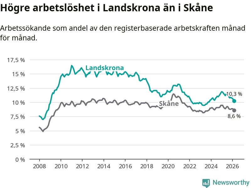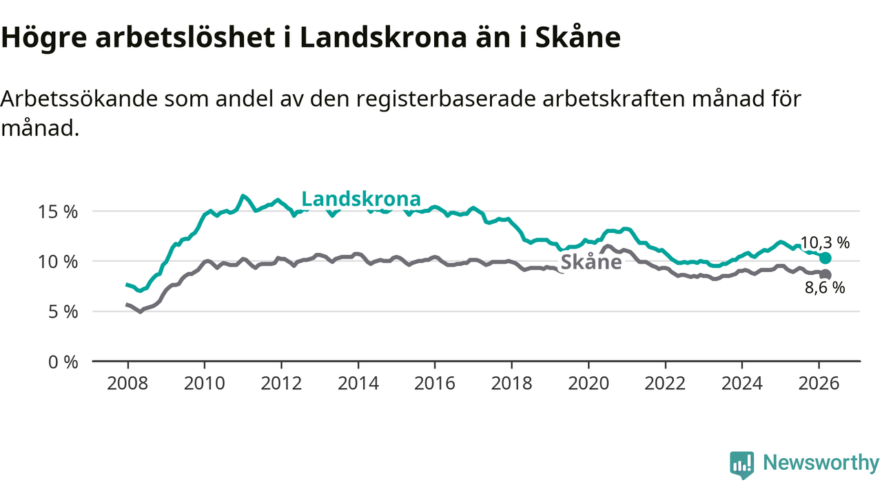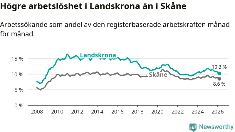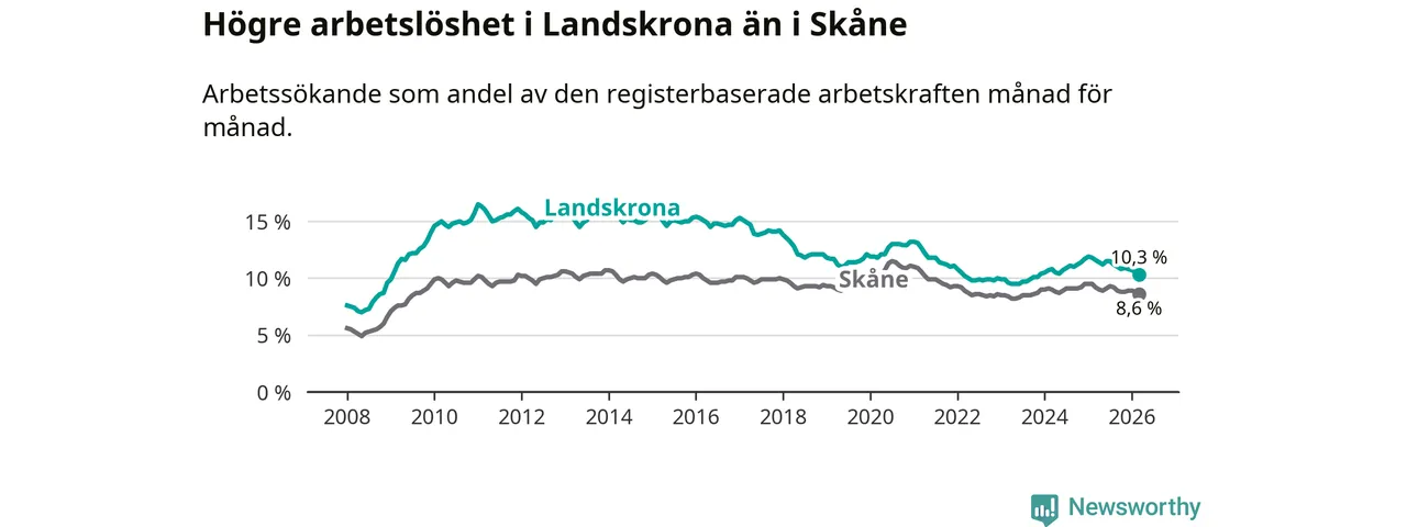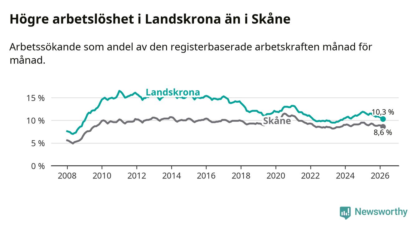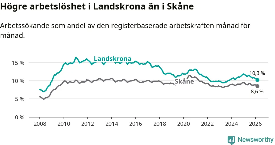 Under mars månad rapporterade Landskrona kommun en total arbetslöshet på 10,3 procent. Det är en minskning jämfört med samma tidpunkt i fjol (−1,3 procentenheter). Även i Skåne län sjunker arbetslösheten .