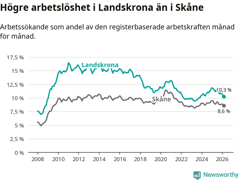 Även om arbetslösheten i Landskrona alltså minskar, så ligger den fortfarande över snittet i hela Skåne län (10,3 procent i kommunen, jämfört med 8,6 procent i hela länet). Lomma har den lägsta arbetslösheten i länet (3,9 procent), medan Perstorp har den högsta (13,1 procent). För att Landskrona skulle komma ner i samma arbetslöshetsnivå som Lomma skulle 1 460 personer behöva sysselsättas.