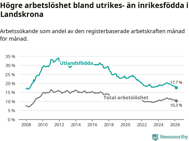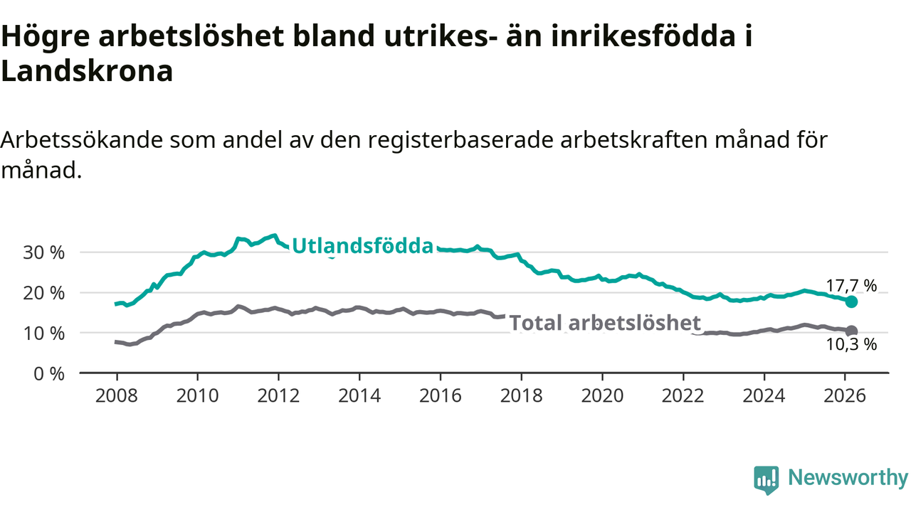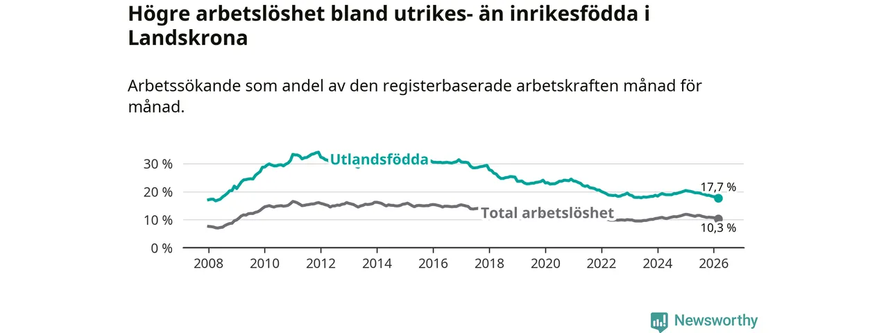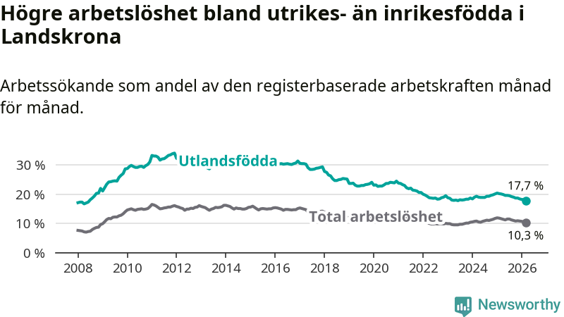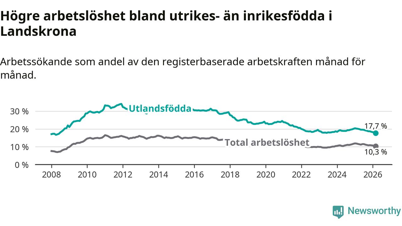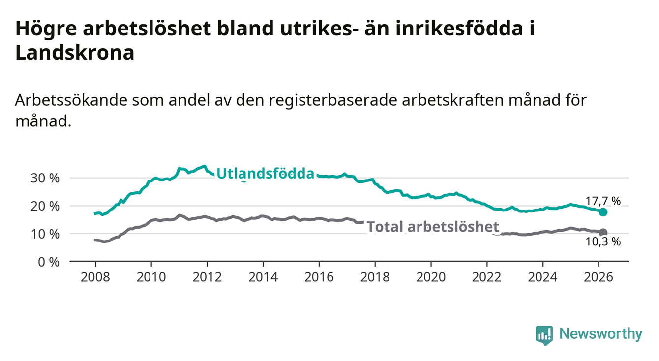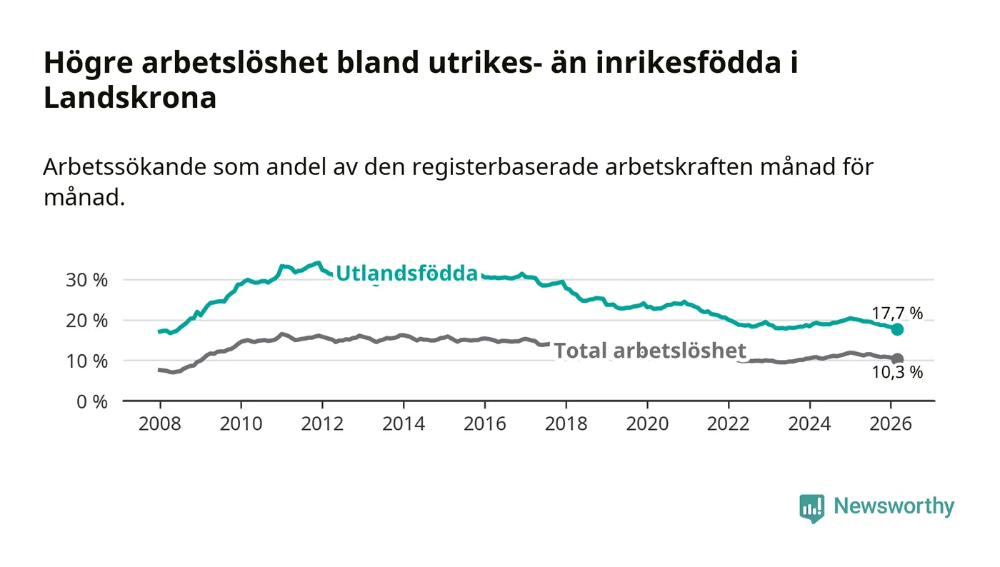Arbetslösheten bland utlandsfödda var 17,7 procent i Landskrona under mars månad, motsvarande 1 353 av 7 644 personer. Det är 2,4 procentenheter färre än vid samma tidpunkt i fjol (−156 om man räknar personer). Därmed är de utlandsföddas arbetslöshet lägre än vid samma tidpunkt i fjol för åttonde månaden i följd. Sedan juli 2025 har arbetslösheten bland utlandsfödda minskat från 19,5 till 17,7 procent. Den nuvarande arbetslöshetsnivån är den lägsta sedan juni 2008.