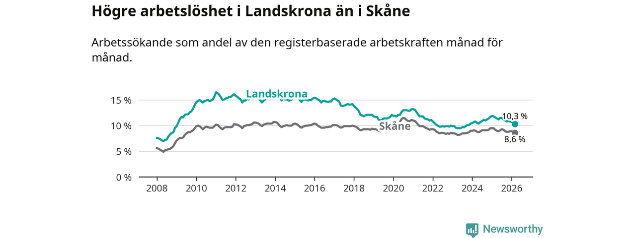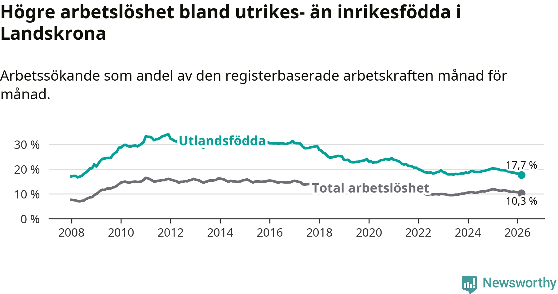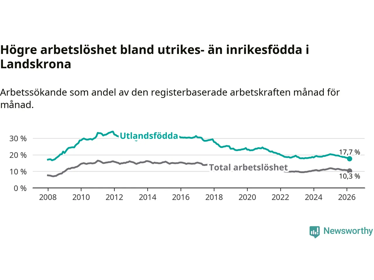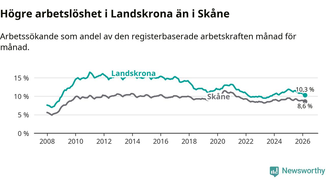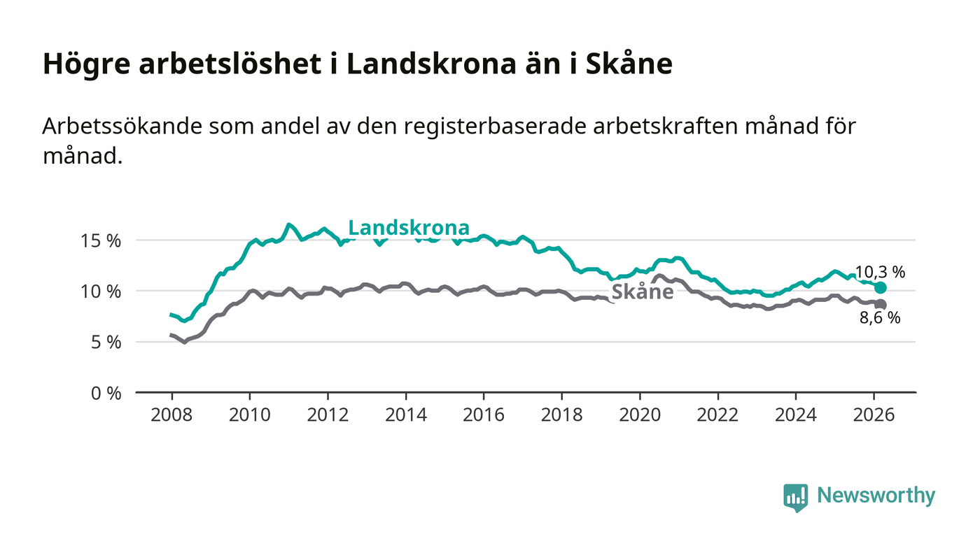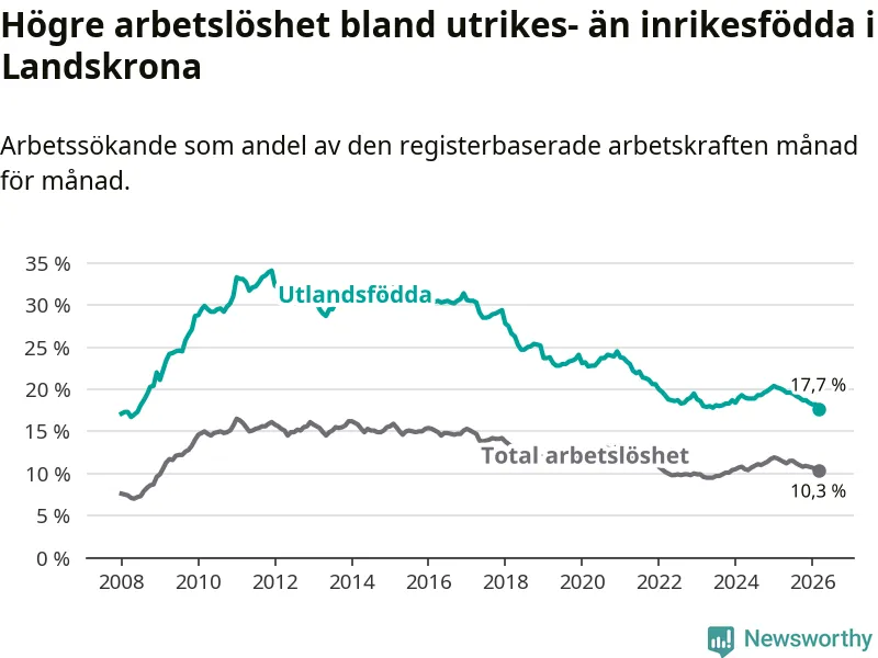 Arbetslösheten bland utlandsfödda var 17,7 procent i Landskrona under mars månad, motsvarande 1 353 av 7 644 personer. Det är 2,4 procentenheter färre än vid samma tidpunkt i fjol (−156 om man räknar personer). Därmed är de utlandsföddas arbetslöshet lägre än vid samma tidpunkt i fjol för åttonde månaden i följd. Sedan juli 2025 har arbetslösheten bland utlandsfödda minskat från 19,5 till 17,7 procent. Den nuvarande arbetslöshetsnivån är den lägsta sedan juni 2008.