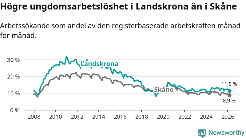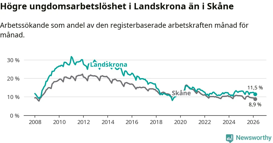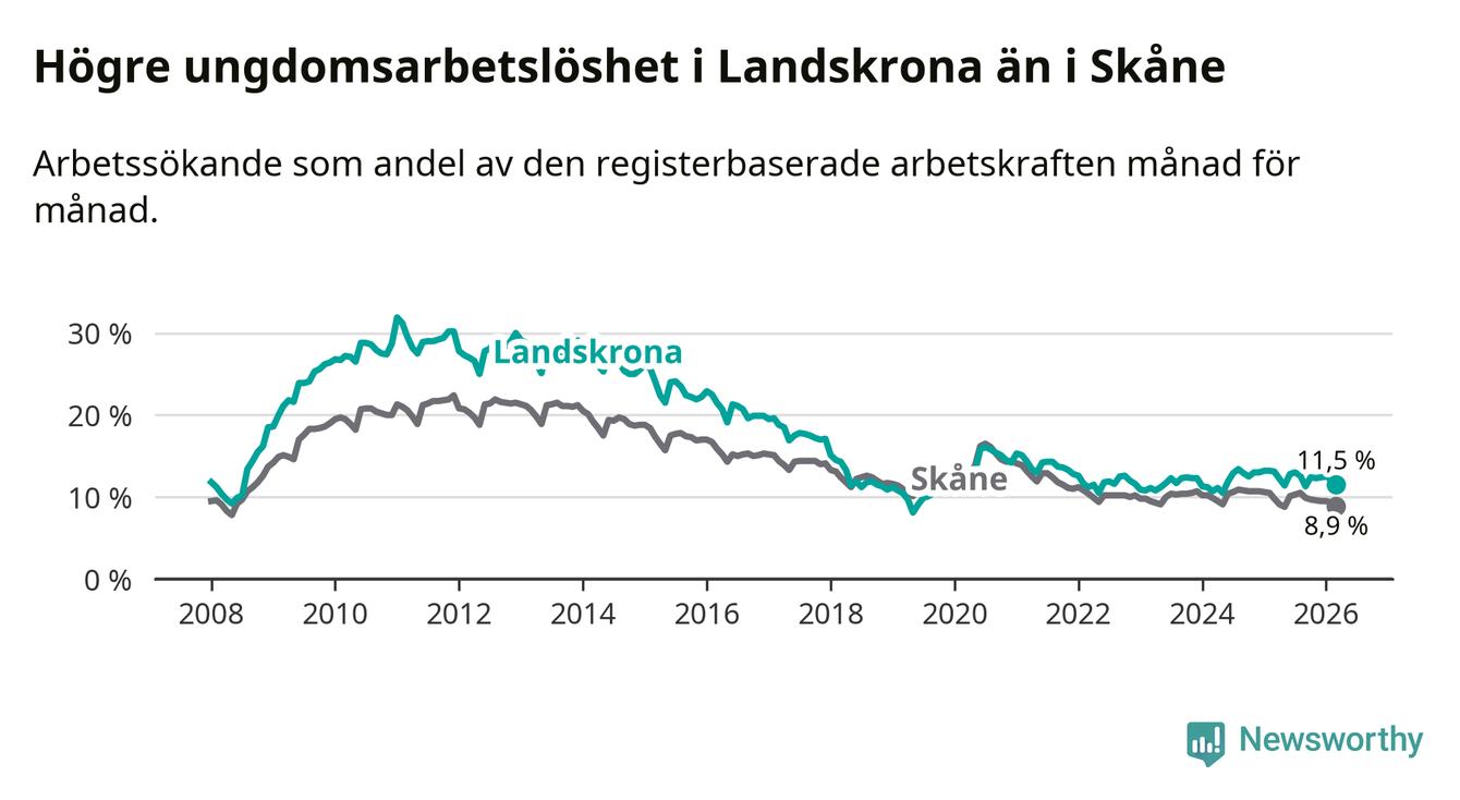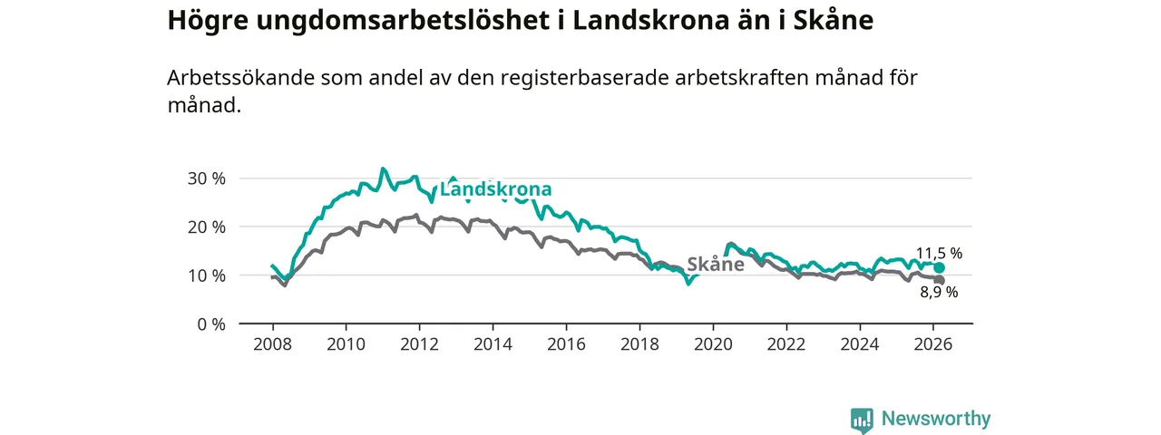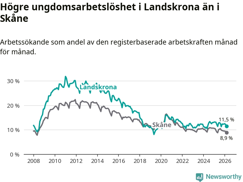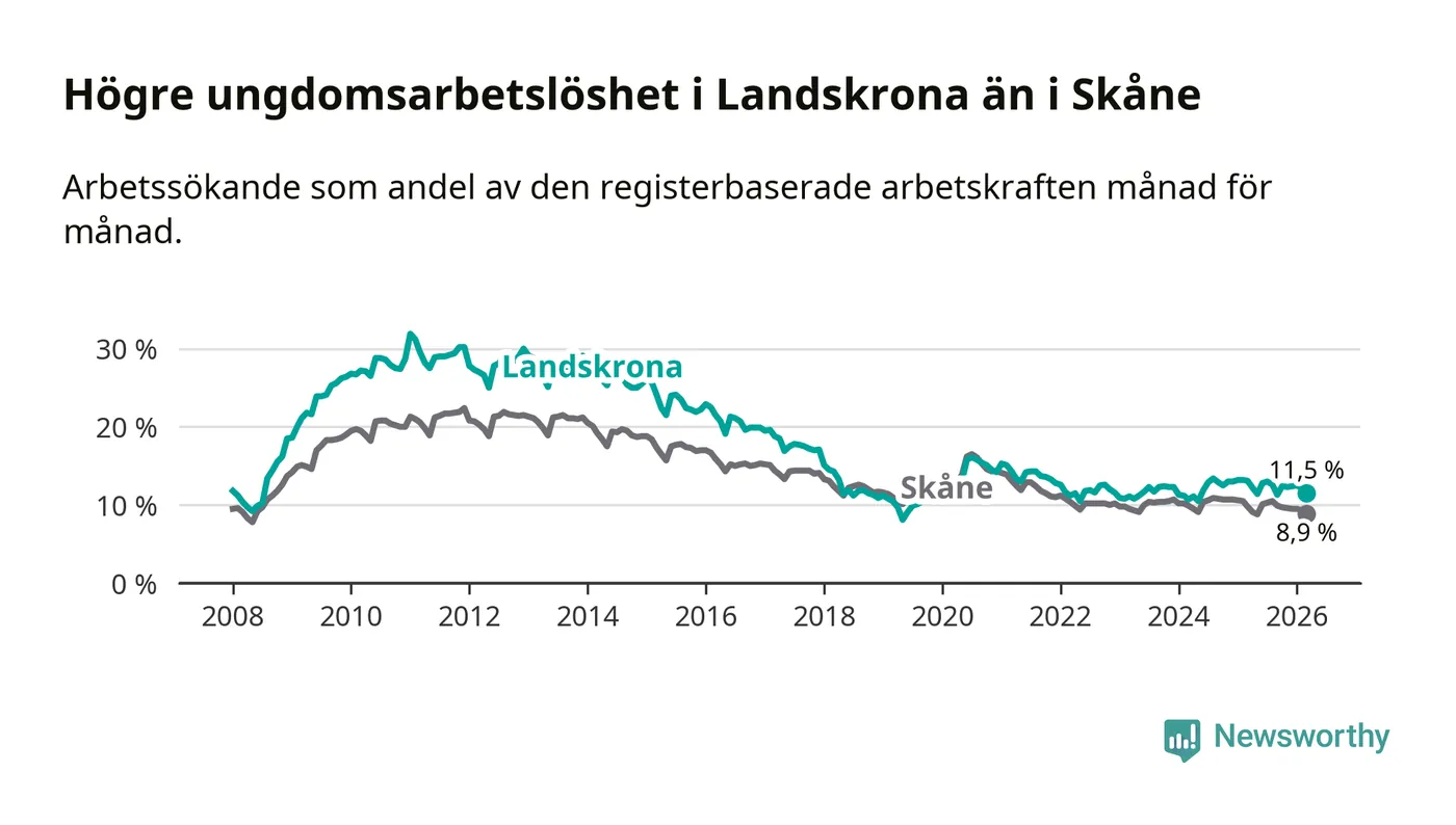 Precis som den totala arbetslösheten ligger ungdomsarbetslösheten i Landskrona högre än i Skåne som helhet. Skillnaden mellan kommunen och länet är 2,6 procentenheter.
