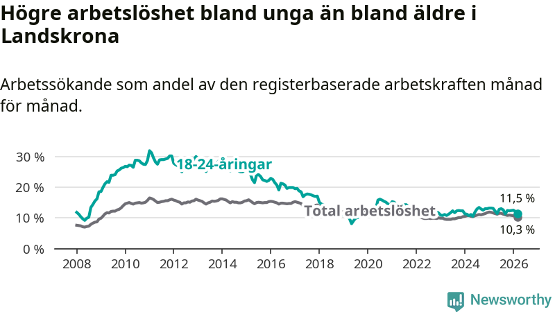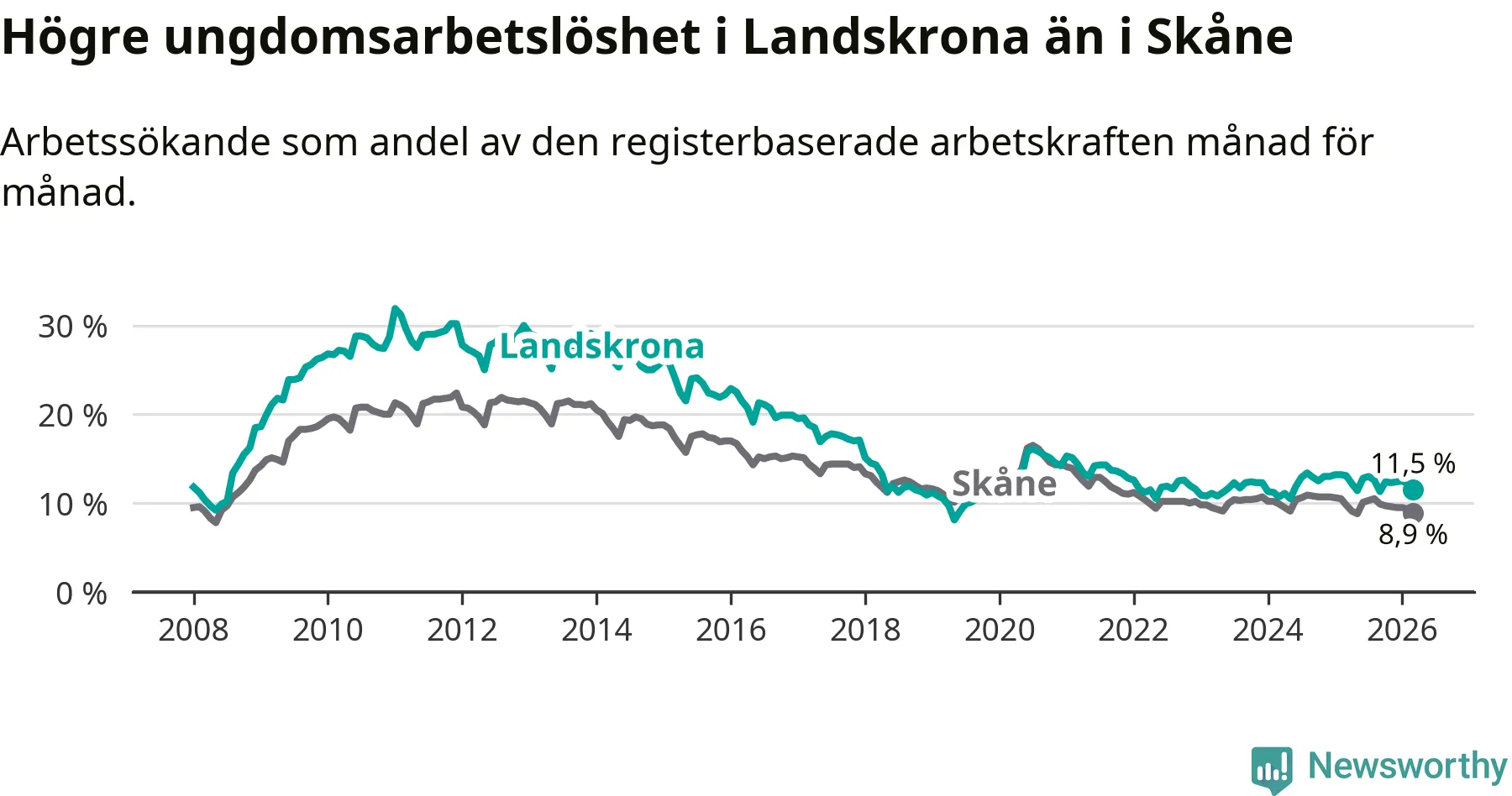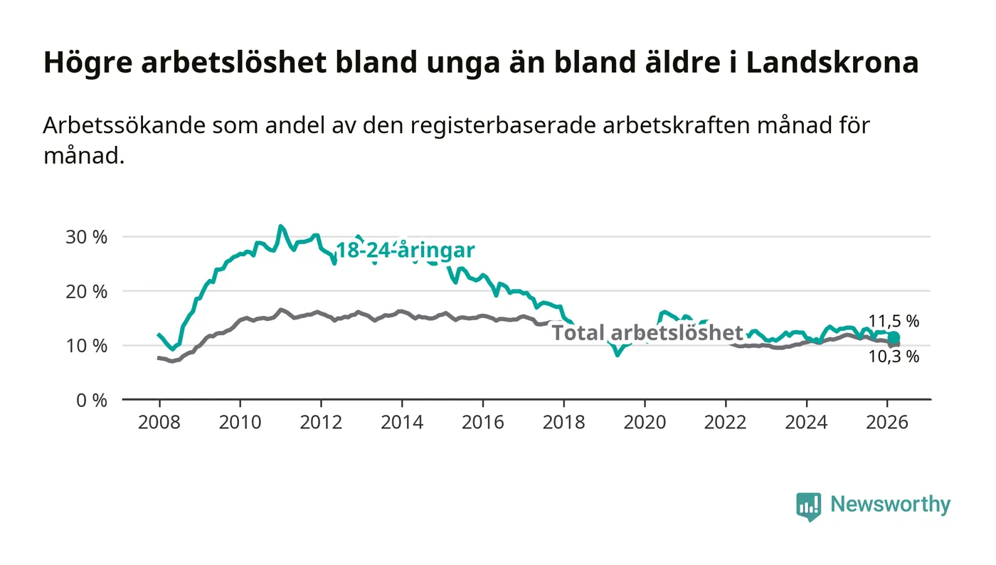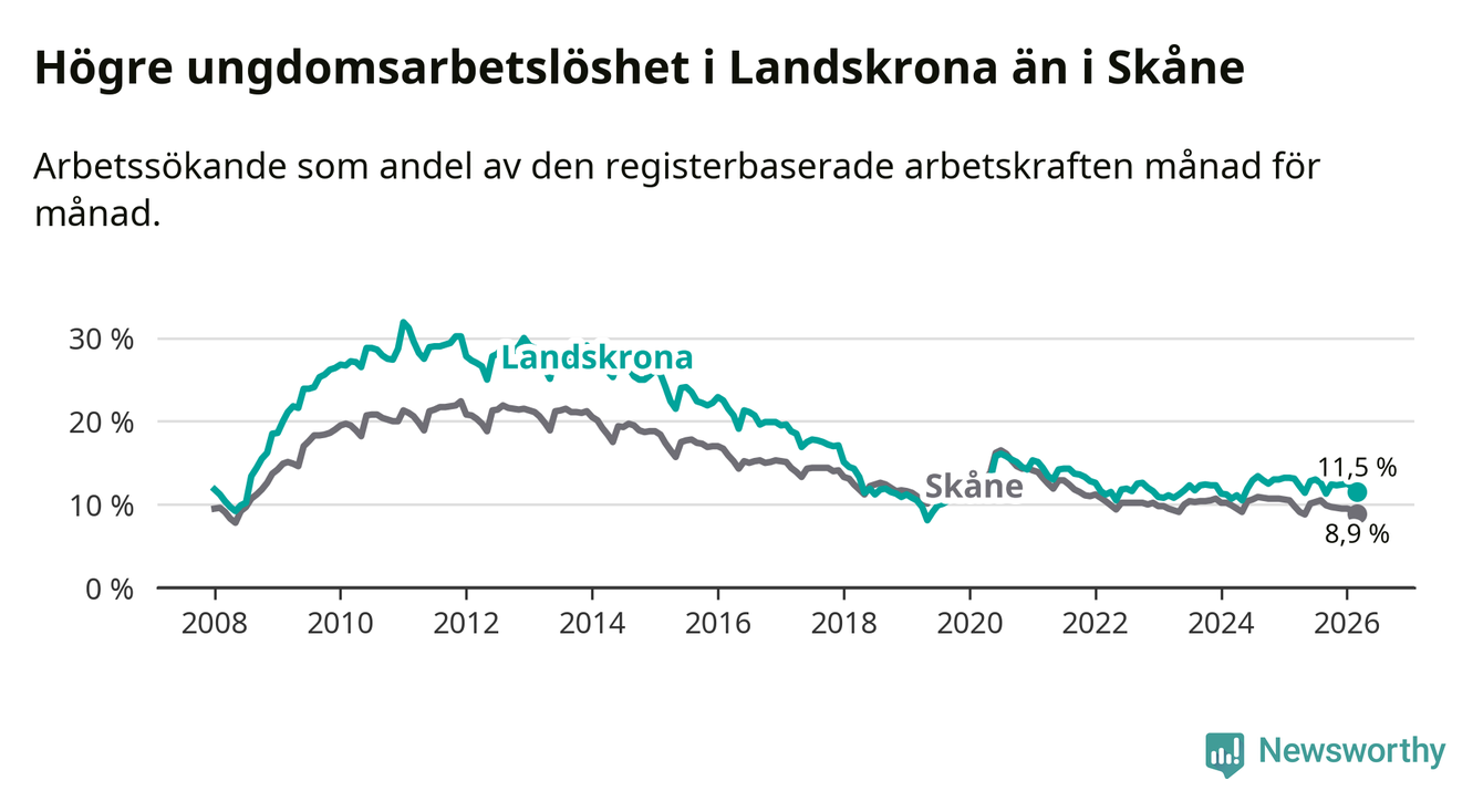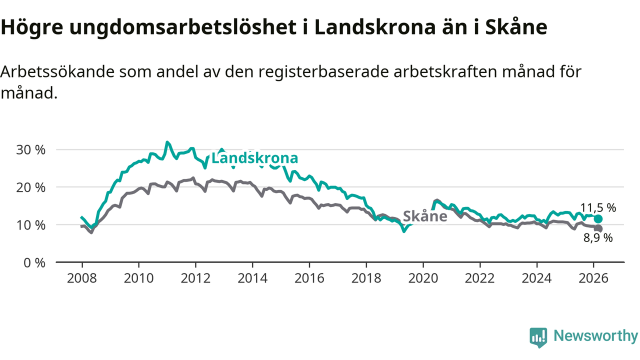Precis som den totala arbetslösheten ligger ungdomsarbetslösheten i Landskrona högre än i Skåne som helhet. Skillnaden mellan kommunen och länet är 2,6 procentenheter.