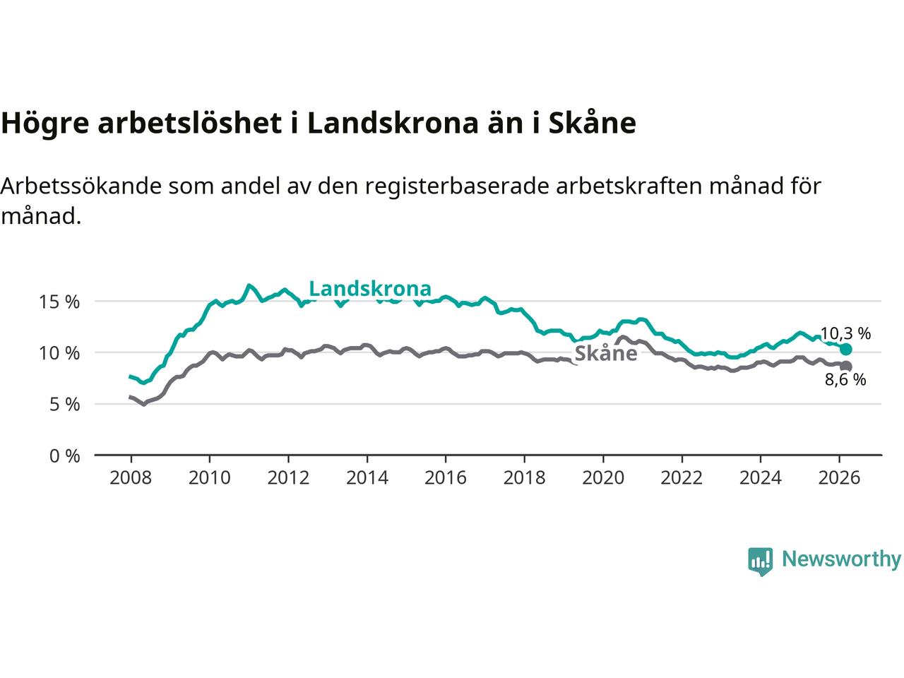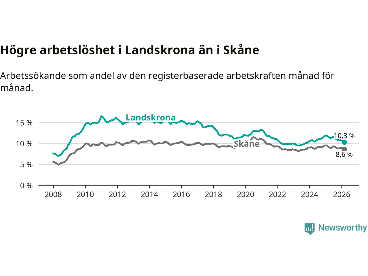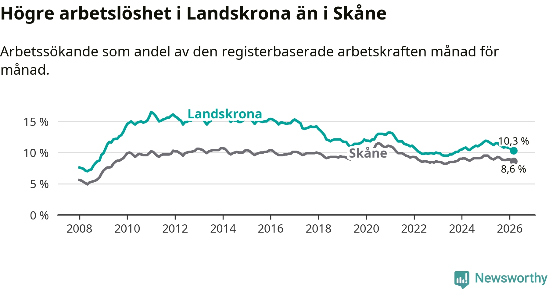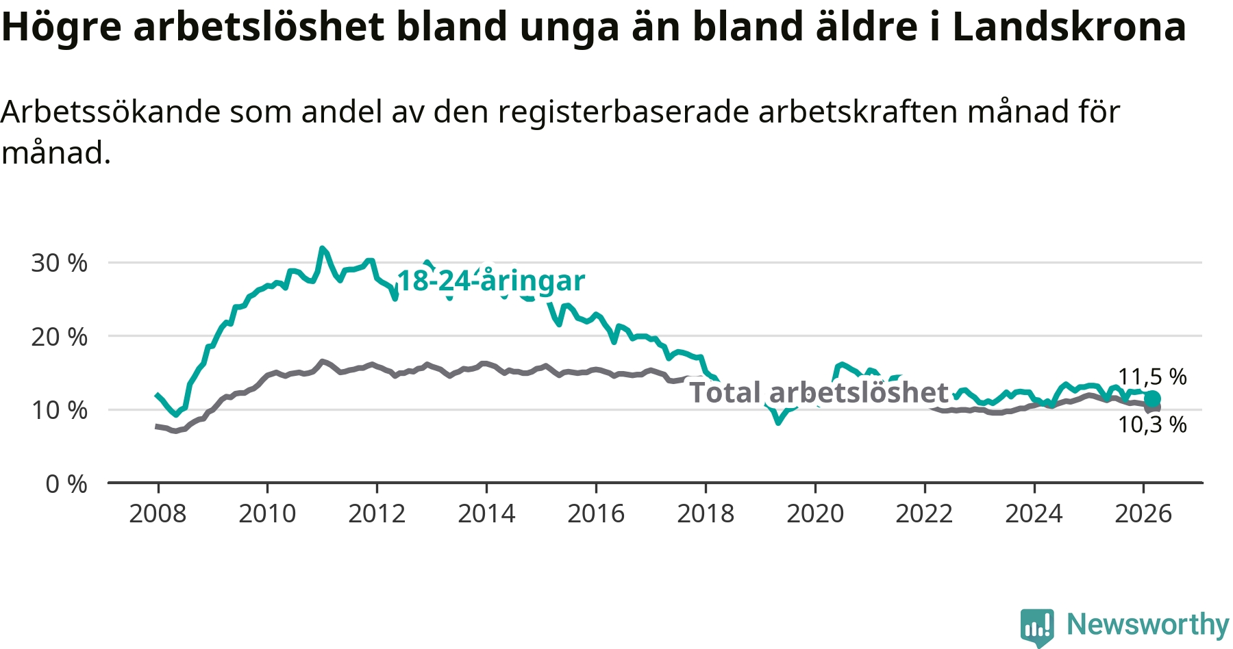 Precis som den totala arbetslösheten ligger ungdomsarbetslösheten i Landskrona högre än i Skåne som helhet. Skillnaden mellan kommunen och länet är 2,6 procentenheter.