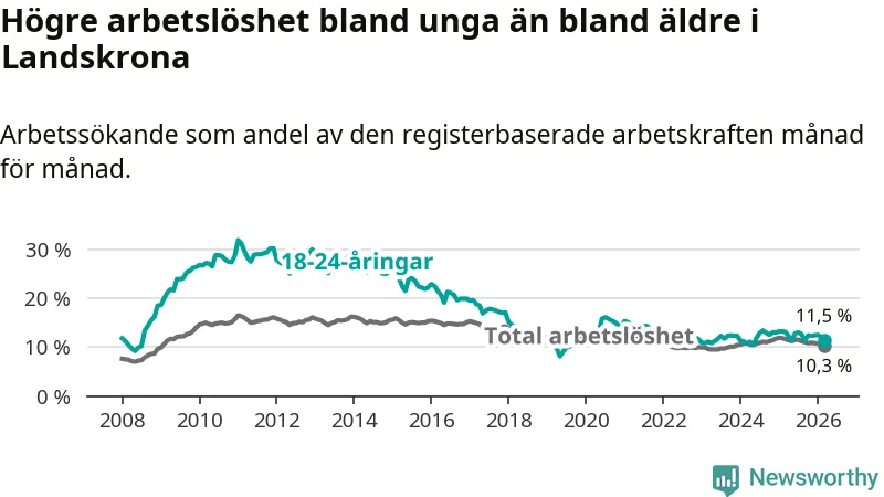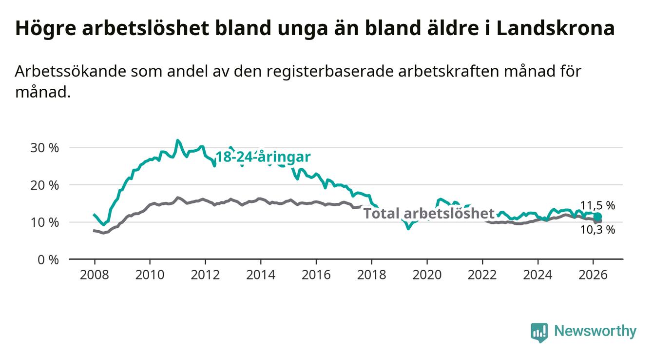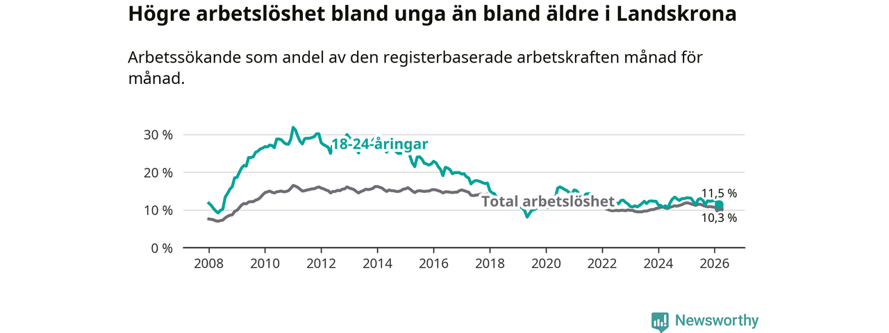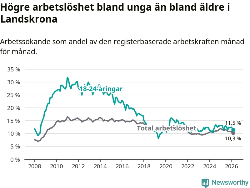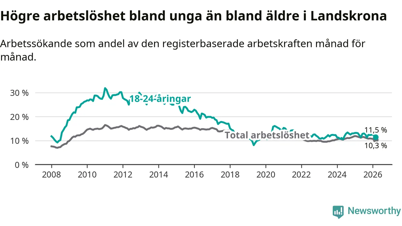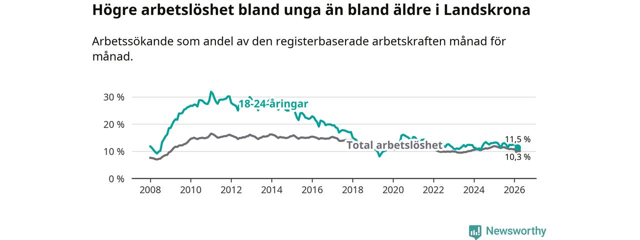 I och med den senaste månadens nedgång har de ungas arbetslöshet i Landskrona sjunkit åtta månader i följd (ner från 13,0 procent i juli 2025 till 11,5 procent nu).