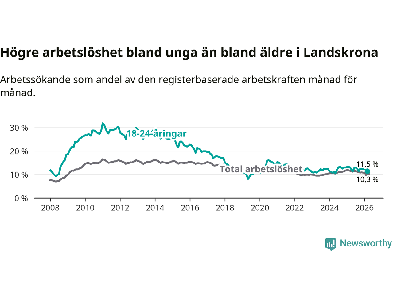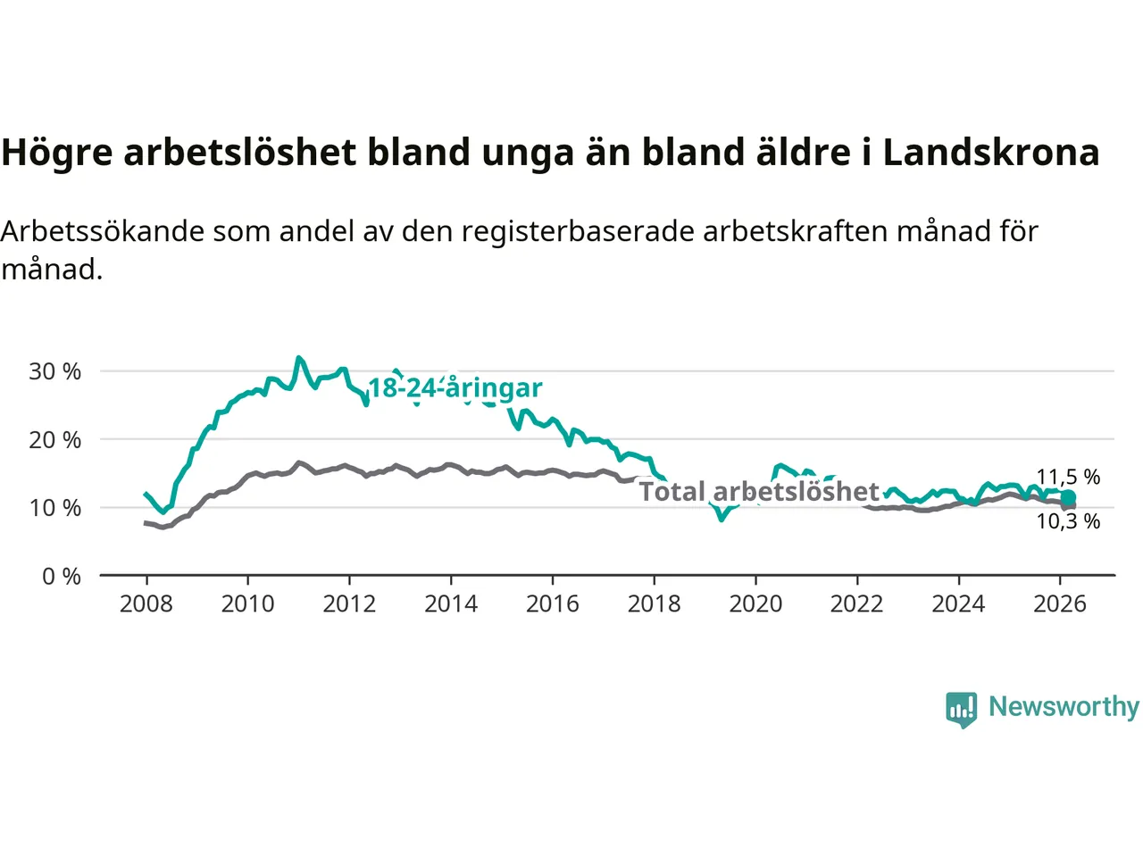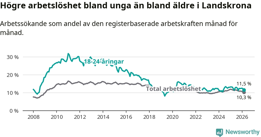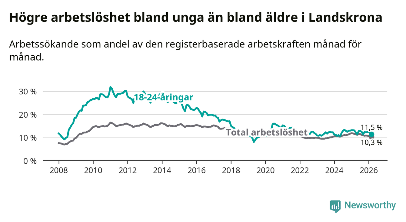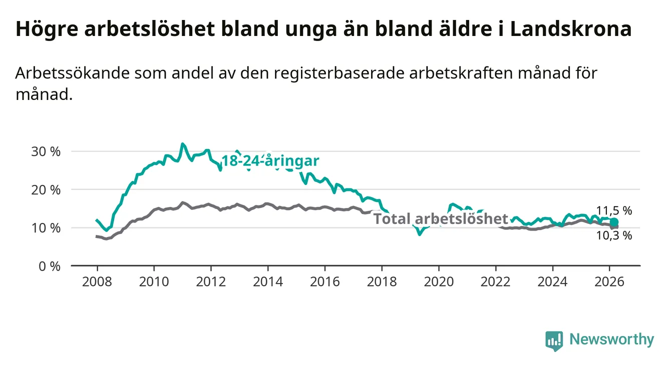 I och med den senaste månadens nedgång har de ungas arbetslöshet i Landskrona sjunkit åtta månader i följd (ner från 13,0 procent i juli 2025 till 11,5 procent nu).