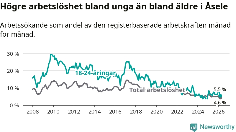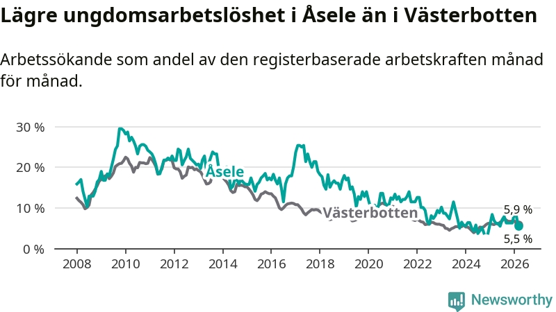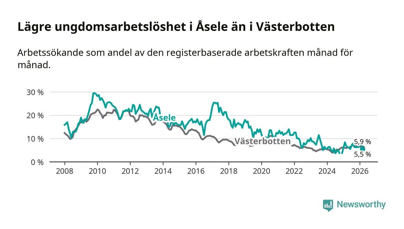 Medan Åsele har ungefär samma total arbetslöshet som Västerbotten, ligger ungdomsarbetslösheten 0,4 procentenheter lägre i Åsele.