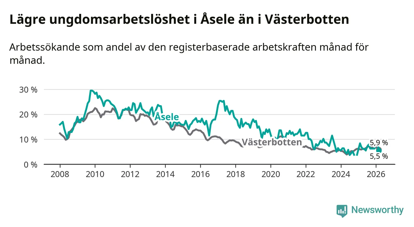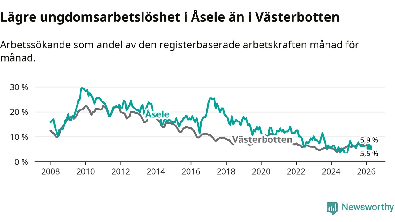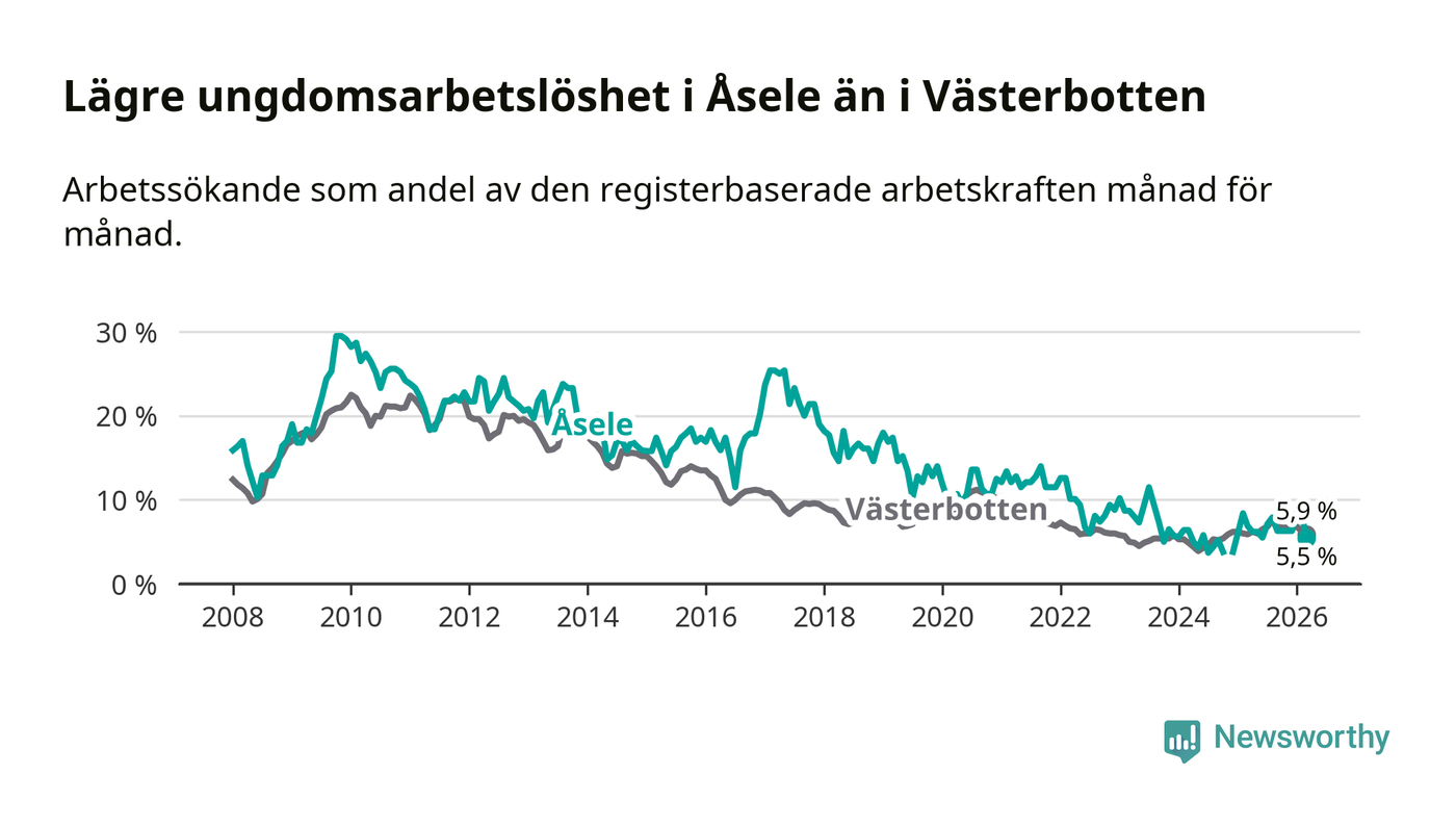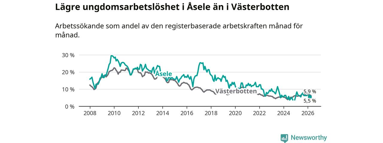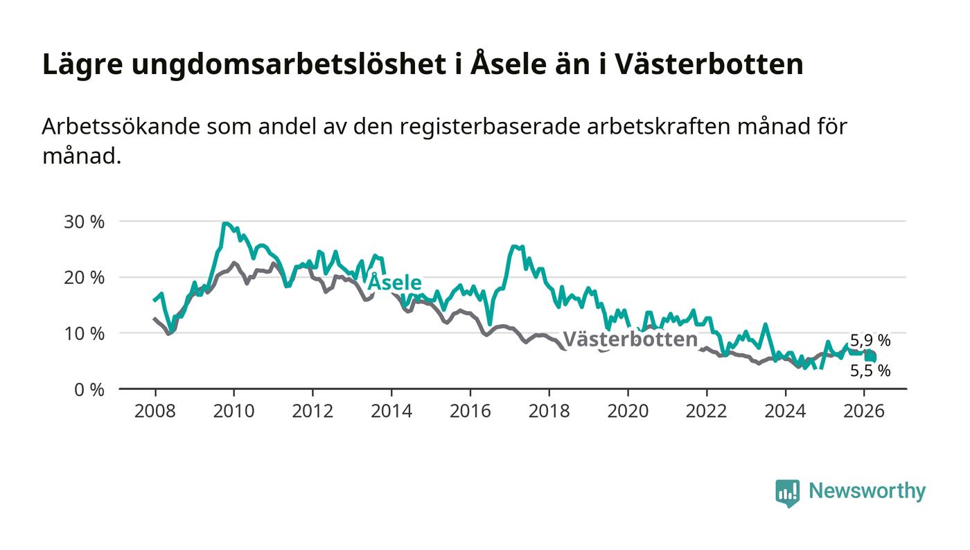 Graf: Arbetslöshet bland unga i Åsele kommun och Västerbottens län