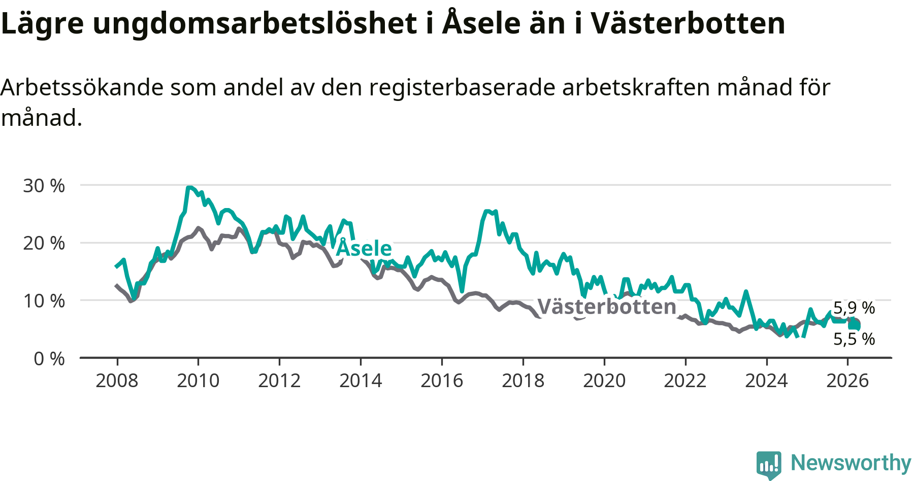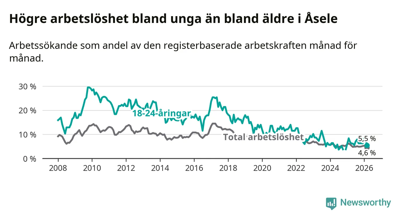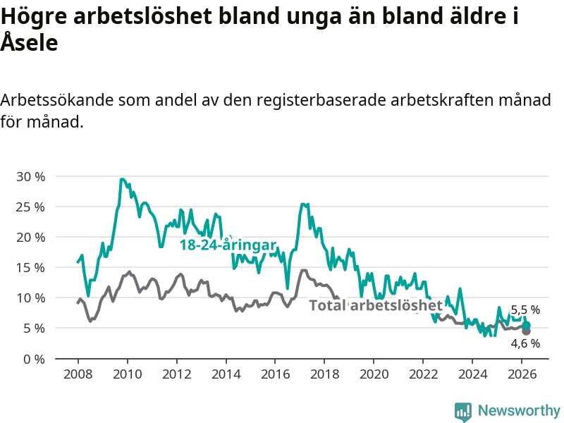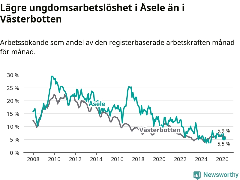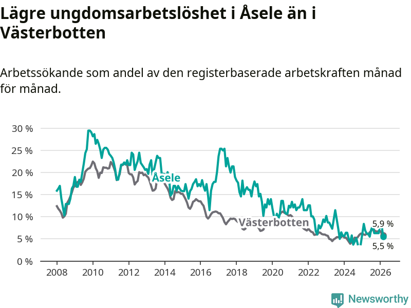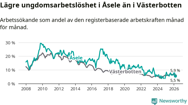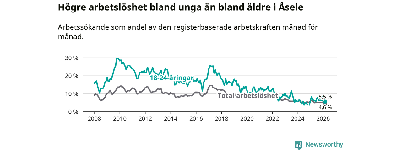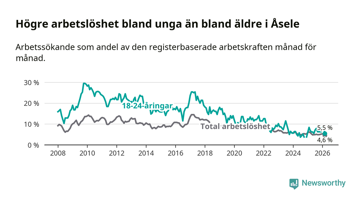 Graf: Arbetslöshet bland unga i Åsele kommun och Västerbottens län
