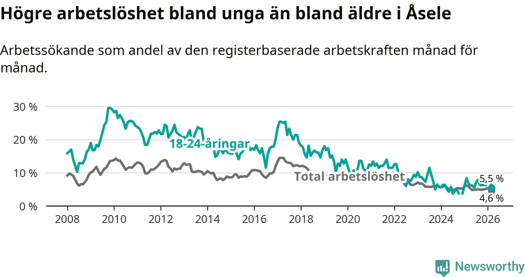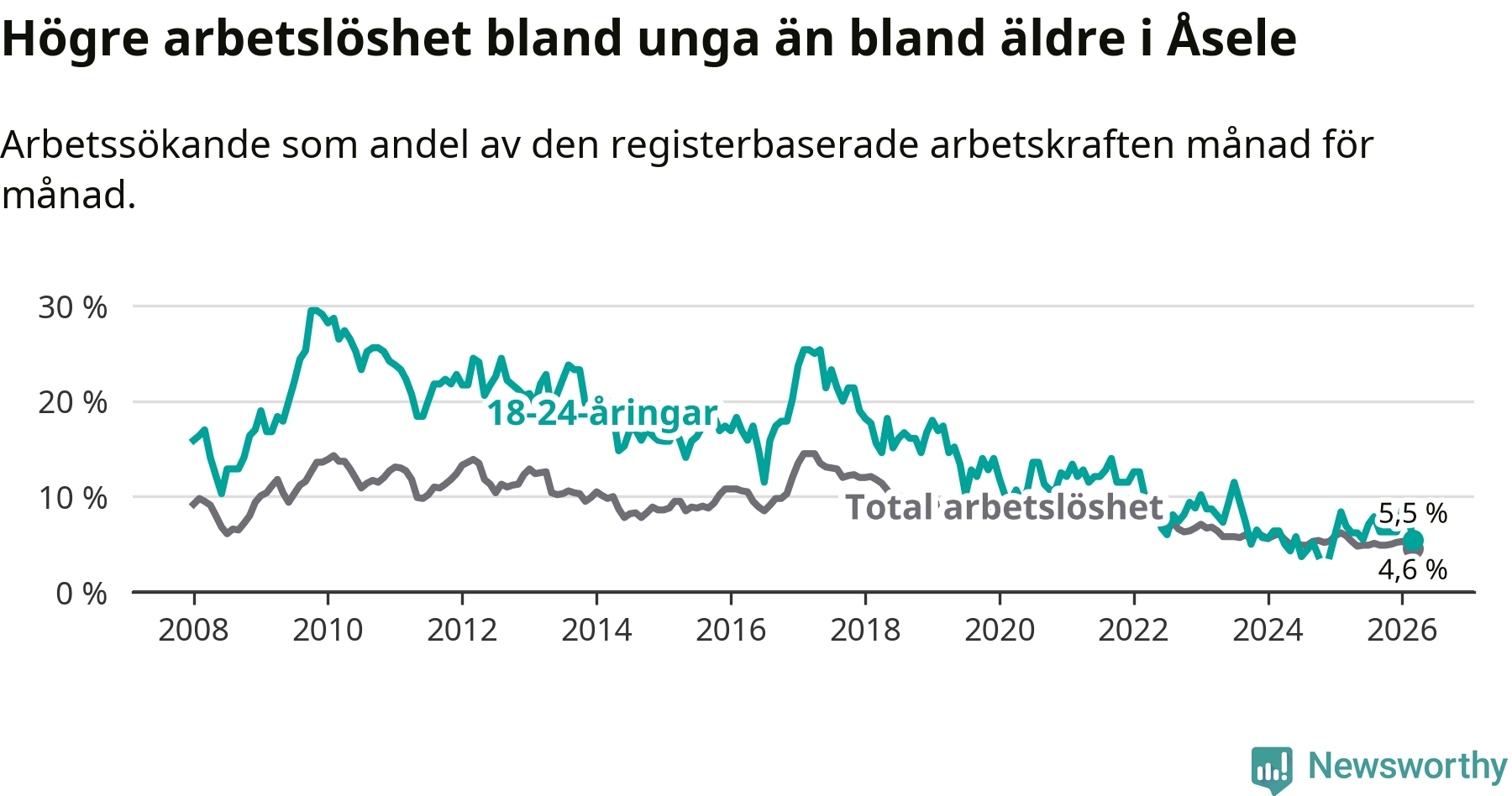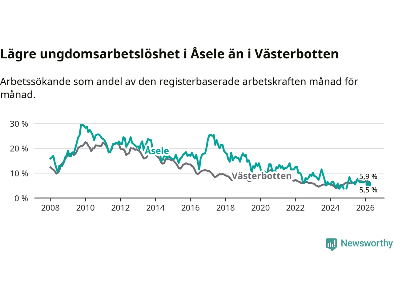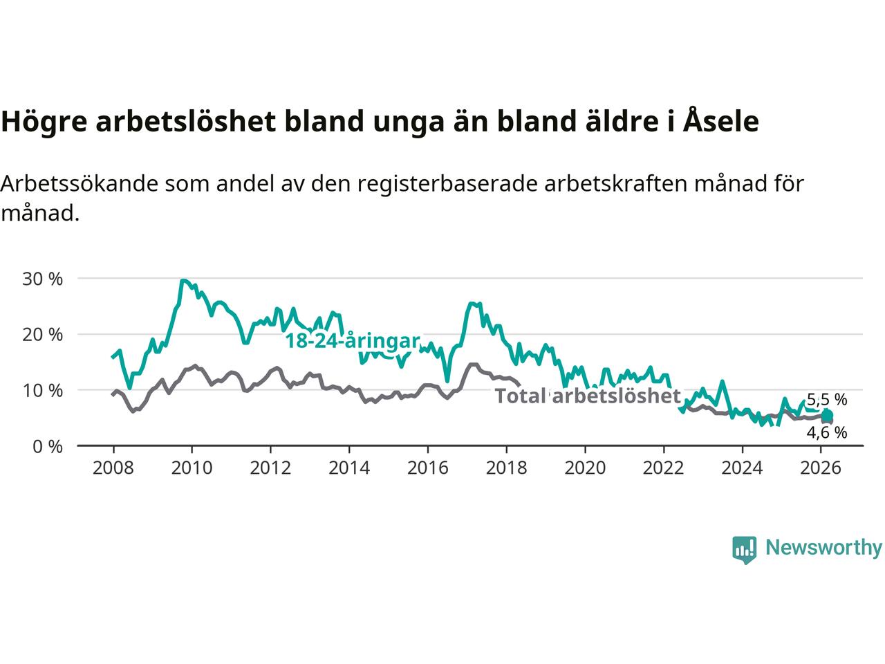Graf: Arbetslöshet bland unga i Åsele kommun och Västerbottens län