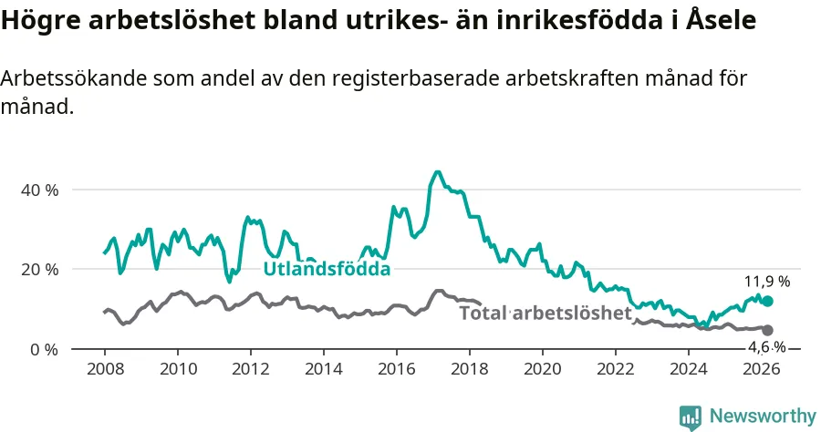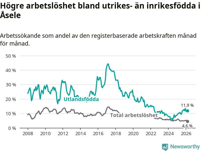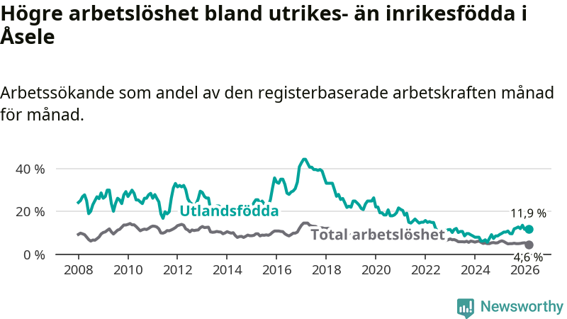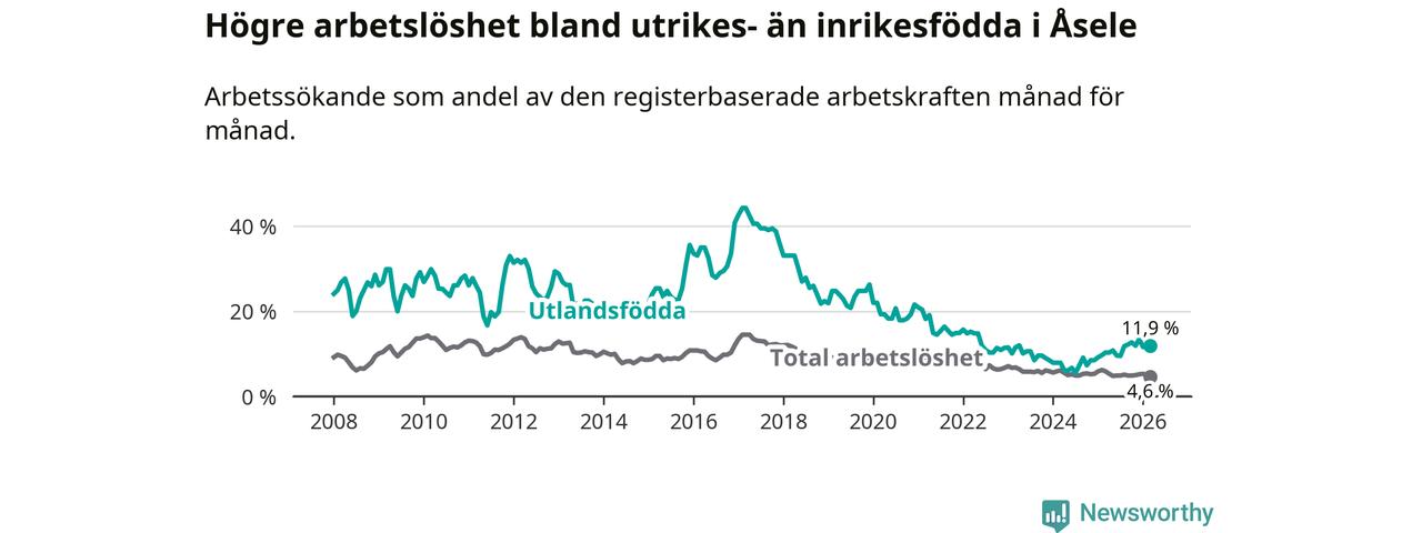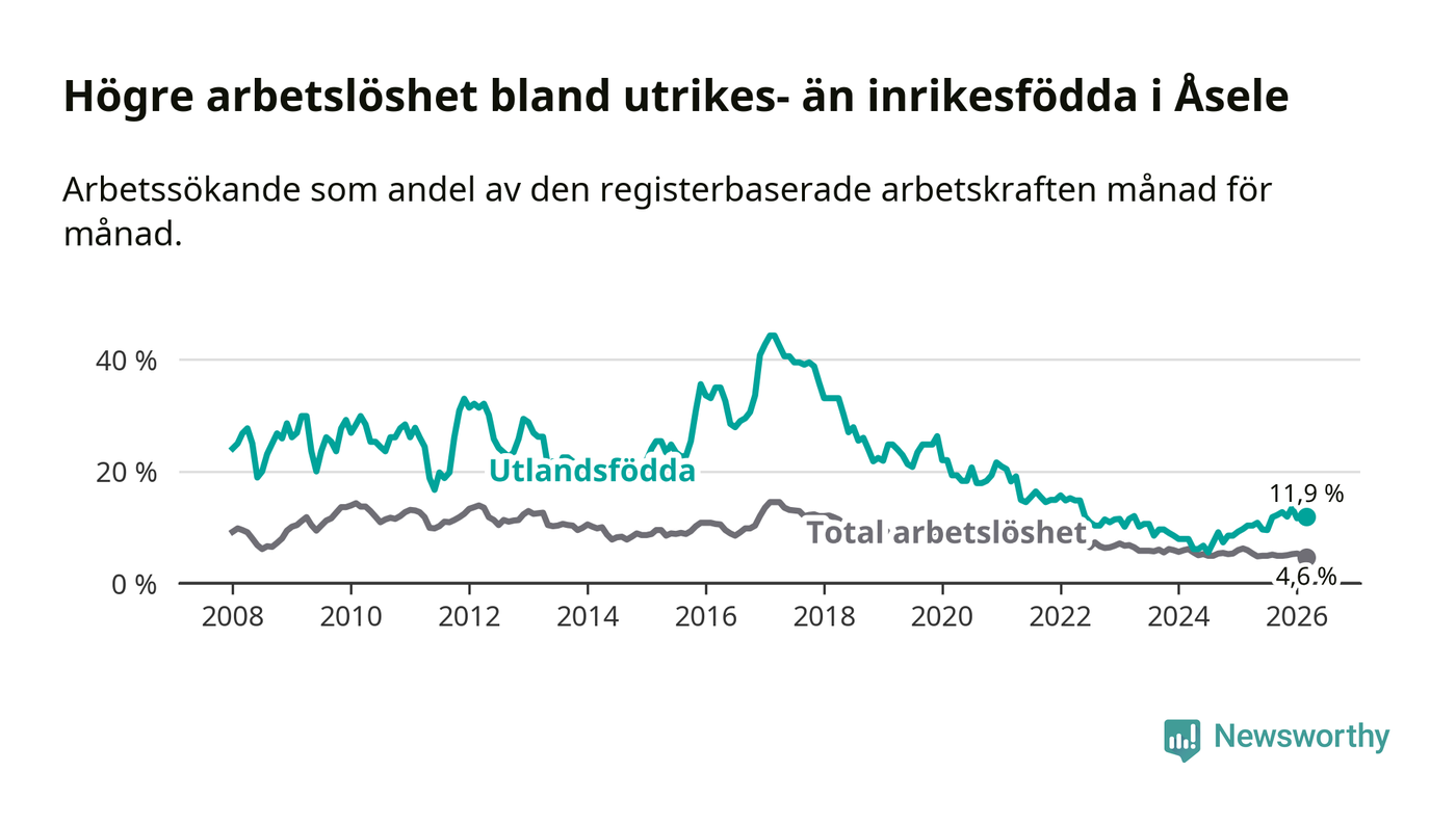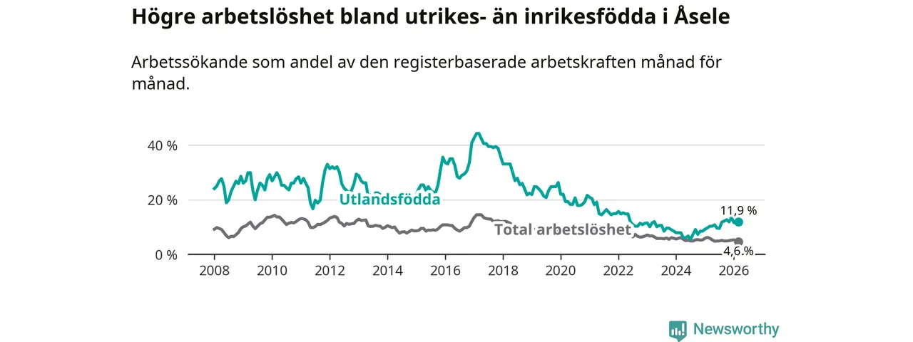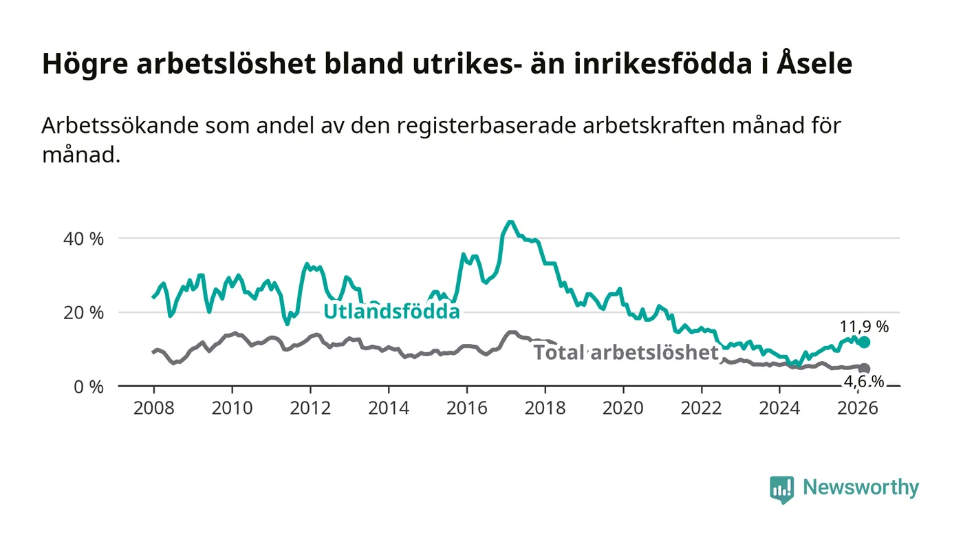 Arbetslösheten bland utlandsfödda var 11,9 procent i Åsele under mars månad, motsvarande 22 av 185 personer. Det är 1,6 procentenheter fler än vid samma tidpunkt i fjol (+5 om man räknar personer). Därmed är de utlandsföddas arbetslöshet högre än vid samma tidpunkt i fjol för 15:e månaden i följd. Sedan december 2024 har arbetslösheten bland utlandsfödda ökat från 8,5 till 11,9 procent.