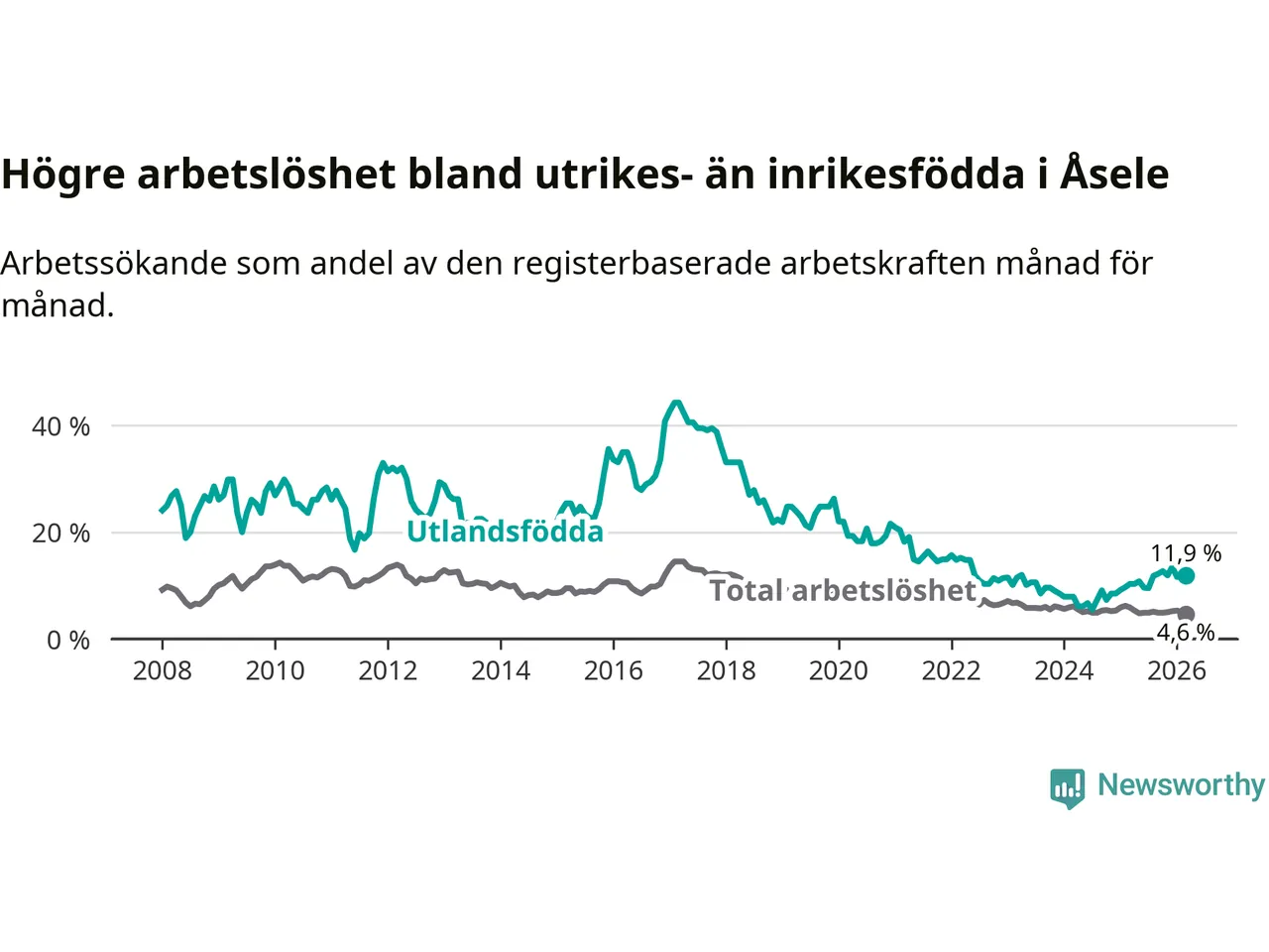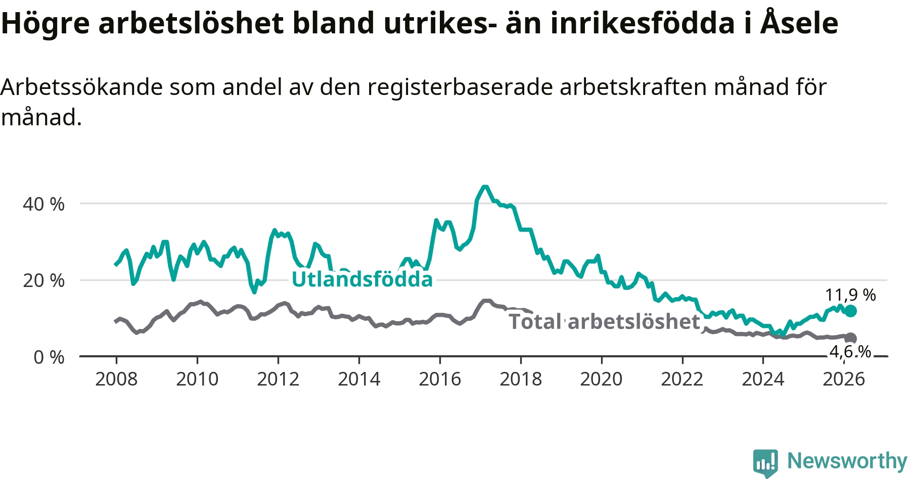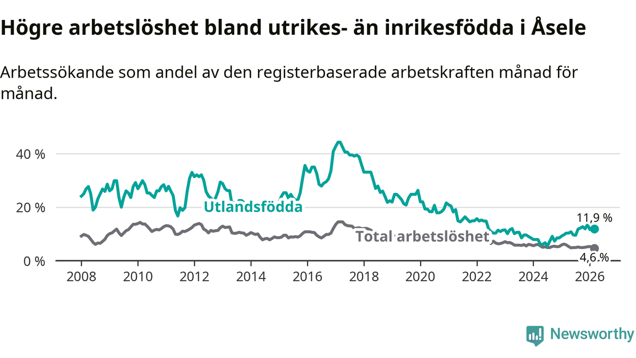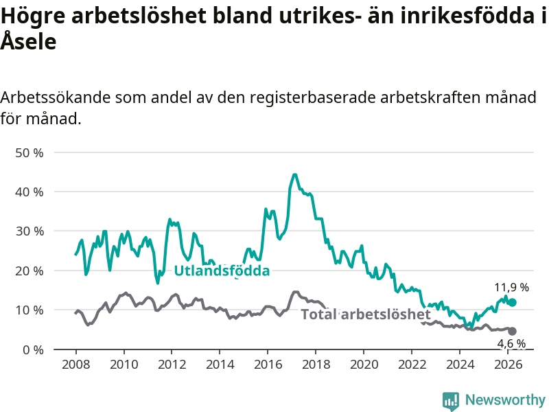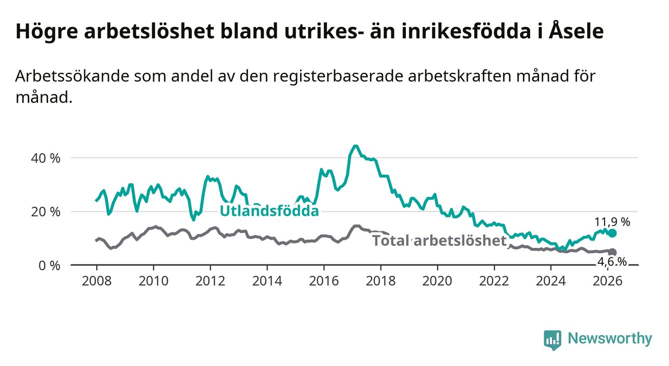 Arbetslösheten bland utlandsfödda var 11,9 procent i Åsele under mars månad, motsvarande 22 av 185 personer. Det är 1,6 procentenheter fler än vid samma tidpunkt i fjol (+5 om man räknar personer). Därmed är de utlandsföddas arbetslöshet högre än vid samma tidpunkt i fjol för 15:e månaden i följd. Sedan december 2024 har arbetslösheten bland utlandsfödda ökat från 8,5 till 11,9 procent.