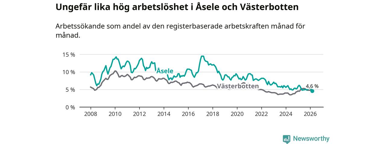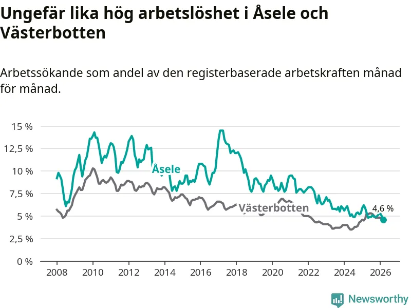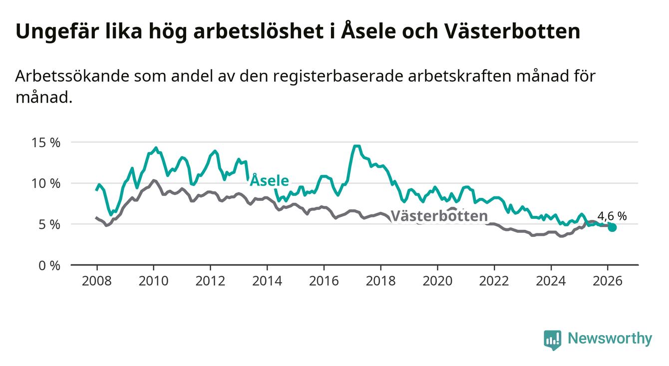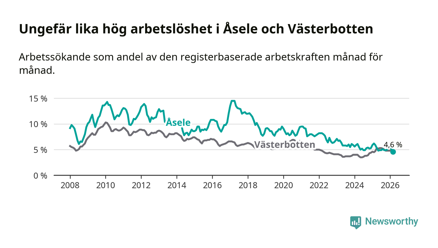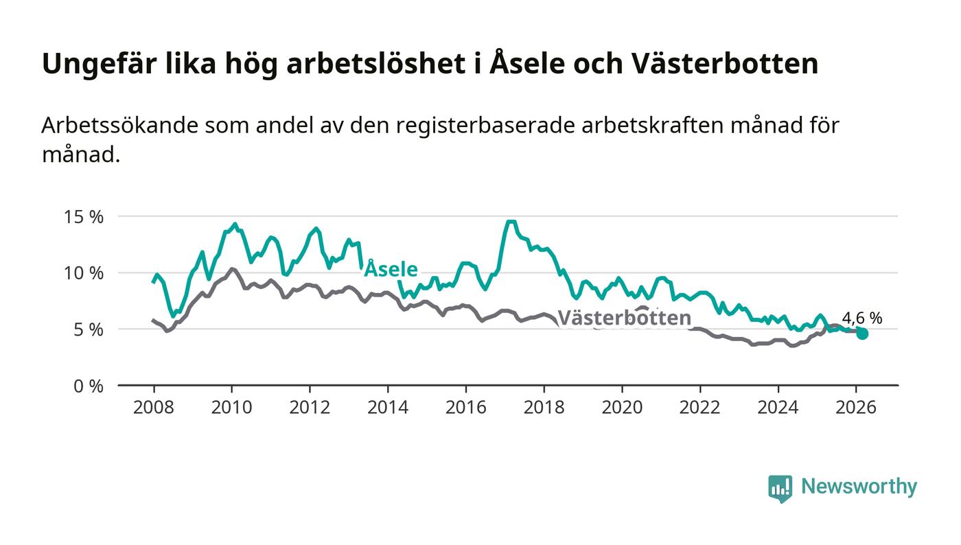 Under mars månad rapporterade Åsele kommun en total arbetslöshet på 4,6 procent. Det är en minskning jämfört med samma tidpunkt i fjol (−1,3 procentenheter). Även i Västerbottens län sjunker arbetslösheten något.