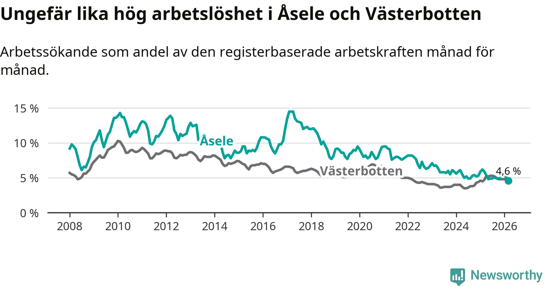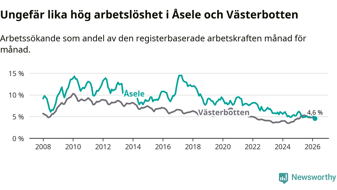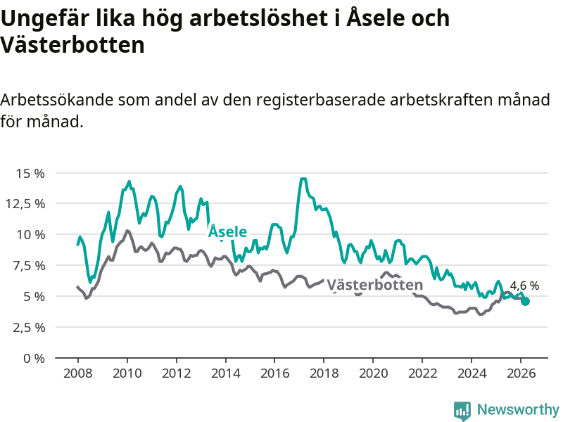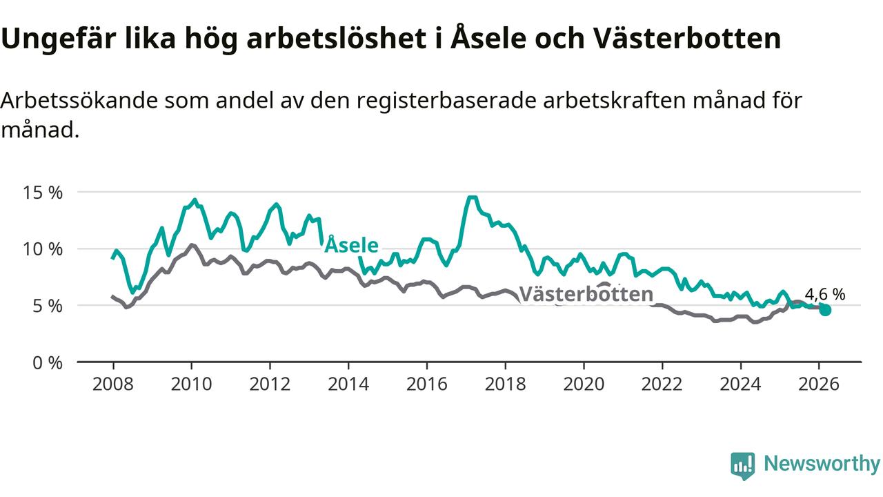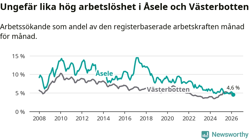 Under mars månad rapporterade Åsele kommun en total arbetslöshet på 4,6 procent. Det är en minskning jämfört med samma tidpunkt i fjol (−1,3 procentenheter). Även i Västerbottens län sjunker arbetslösheten något.