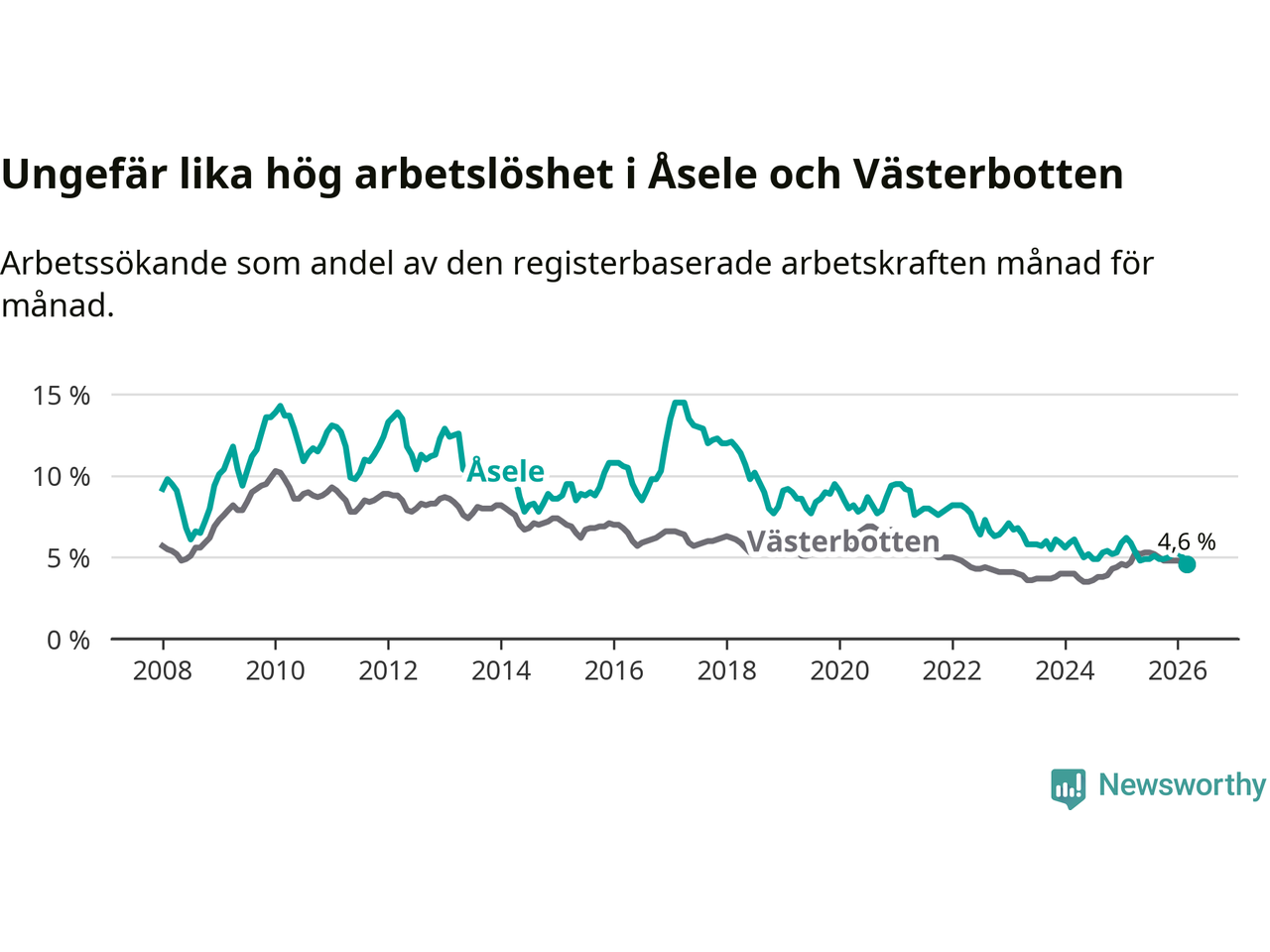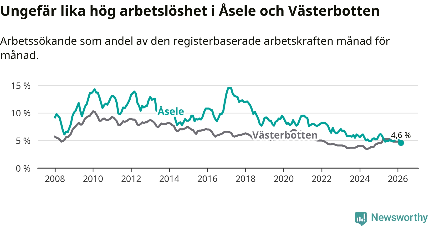 Graf: Arbetslöshet i Åsele kommun och Västerbottens län