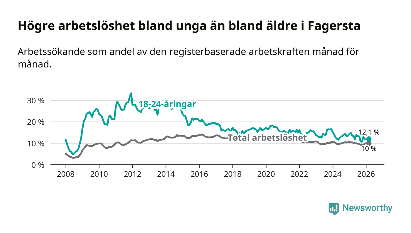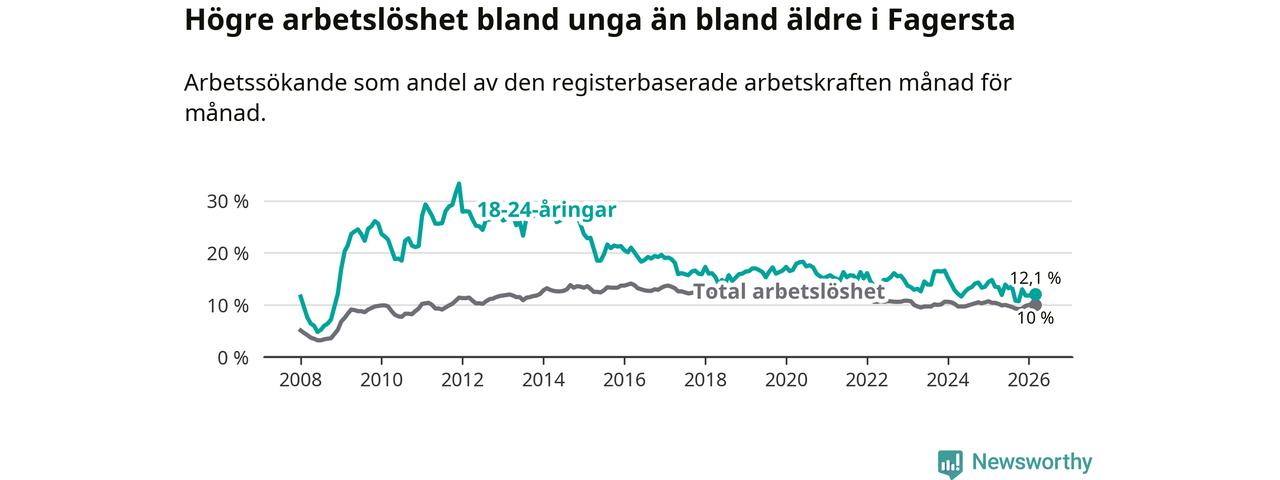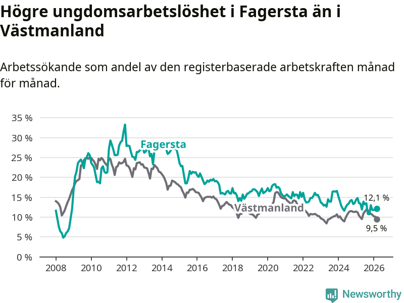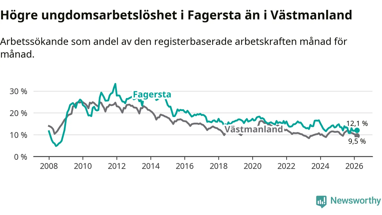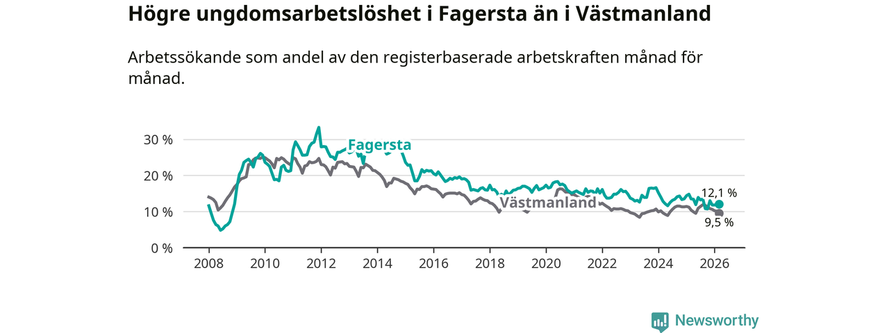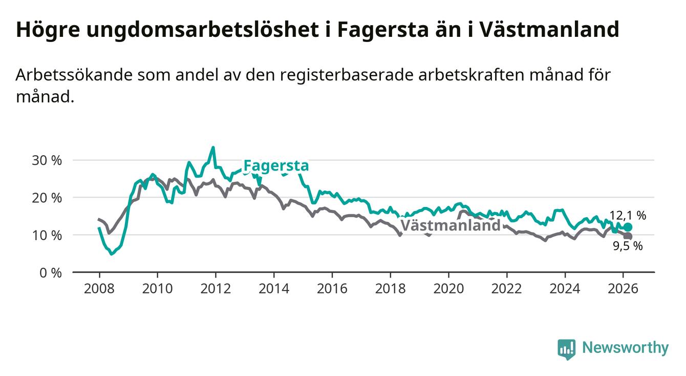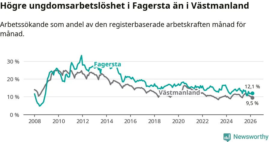 I och med den senaste månadens nedgång har de ungas arbetslöshet i Fagersta sjunkit sju månader i följd (ner från 13,5 procent i augusti 2025 till 12,1 procent nu).