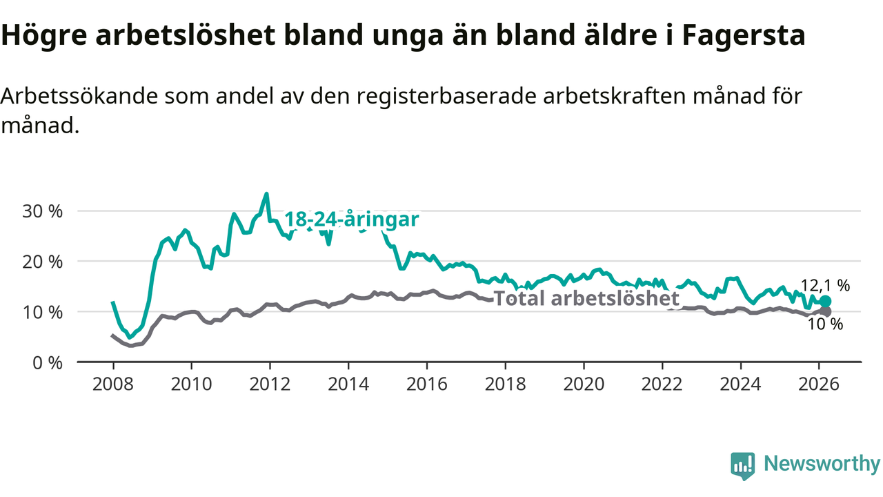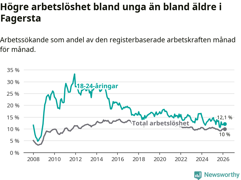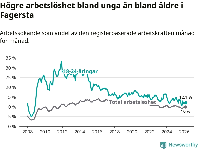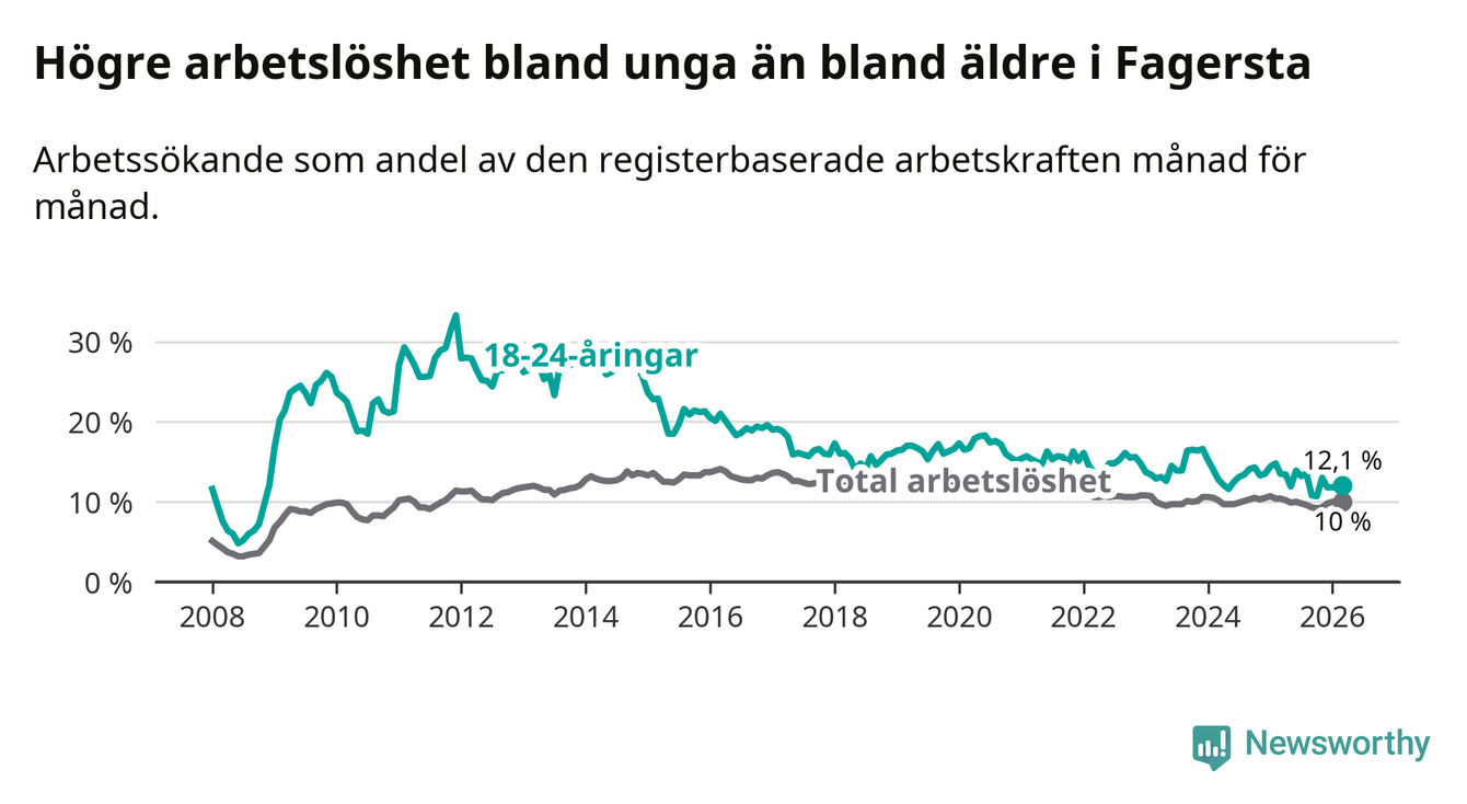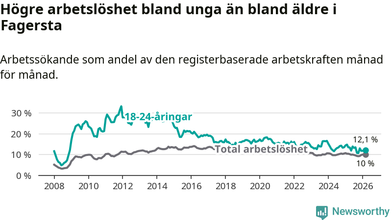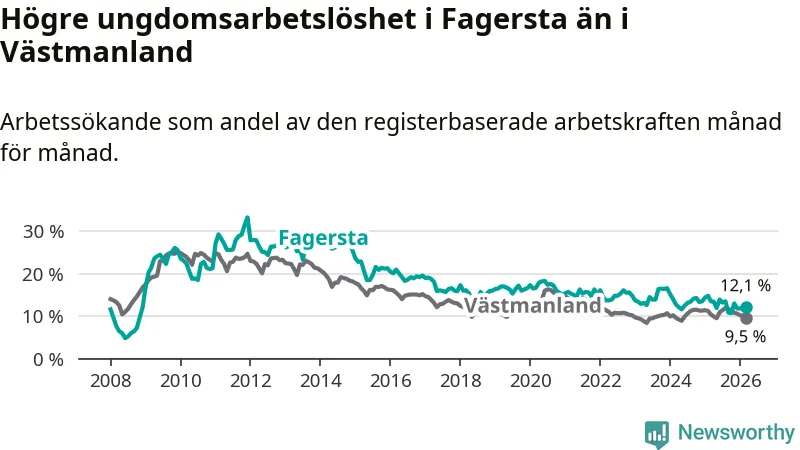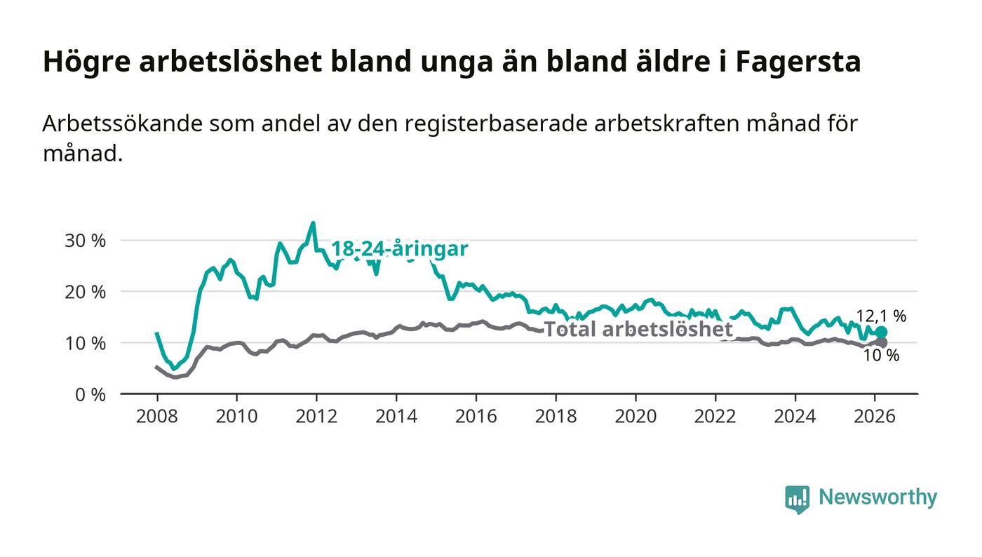 I och med den senaste månadens nedgång har de ungas arbetslöshet i Fagersta sjunkit sju månader i följd (ner från 13,5 procent i augusti 2025 till 12,1 procent nu).
