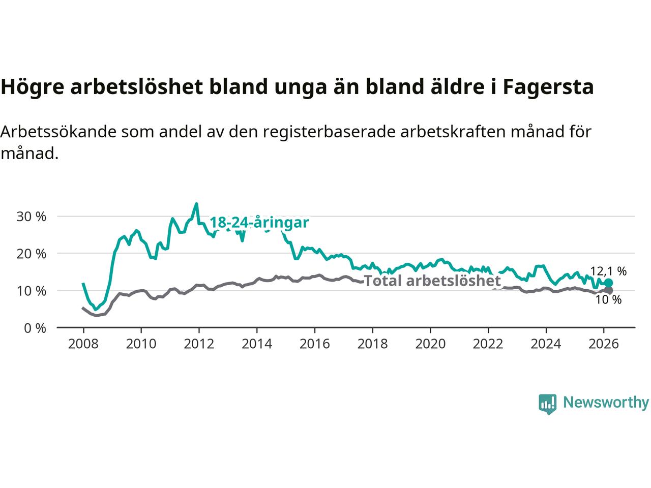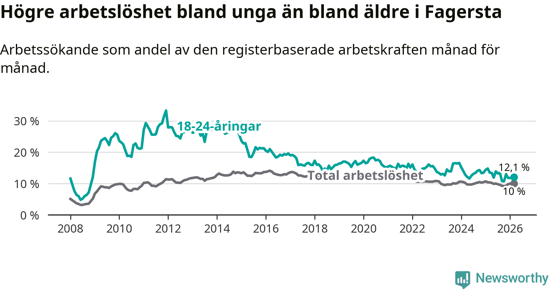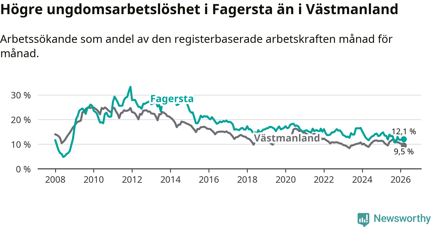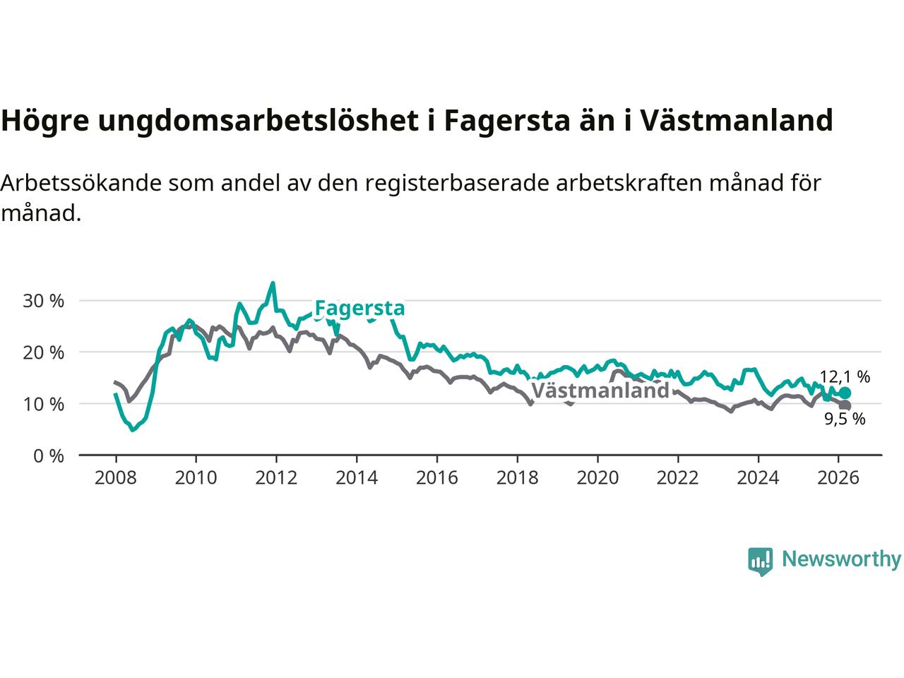 I och med den senaste månadens nedgång har de ungas arbetslöshet i Fagersta sjunkit sju månader i följd (ner från 13,5 procent i augusti 2025 till 12,1 procent nu).