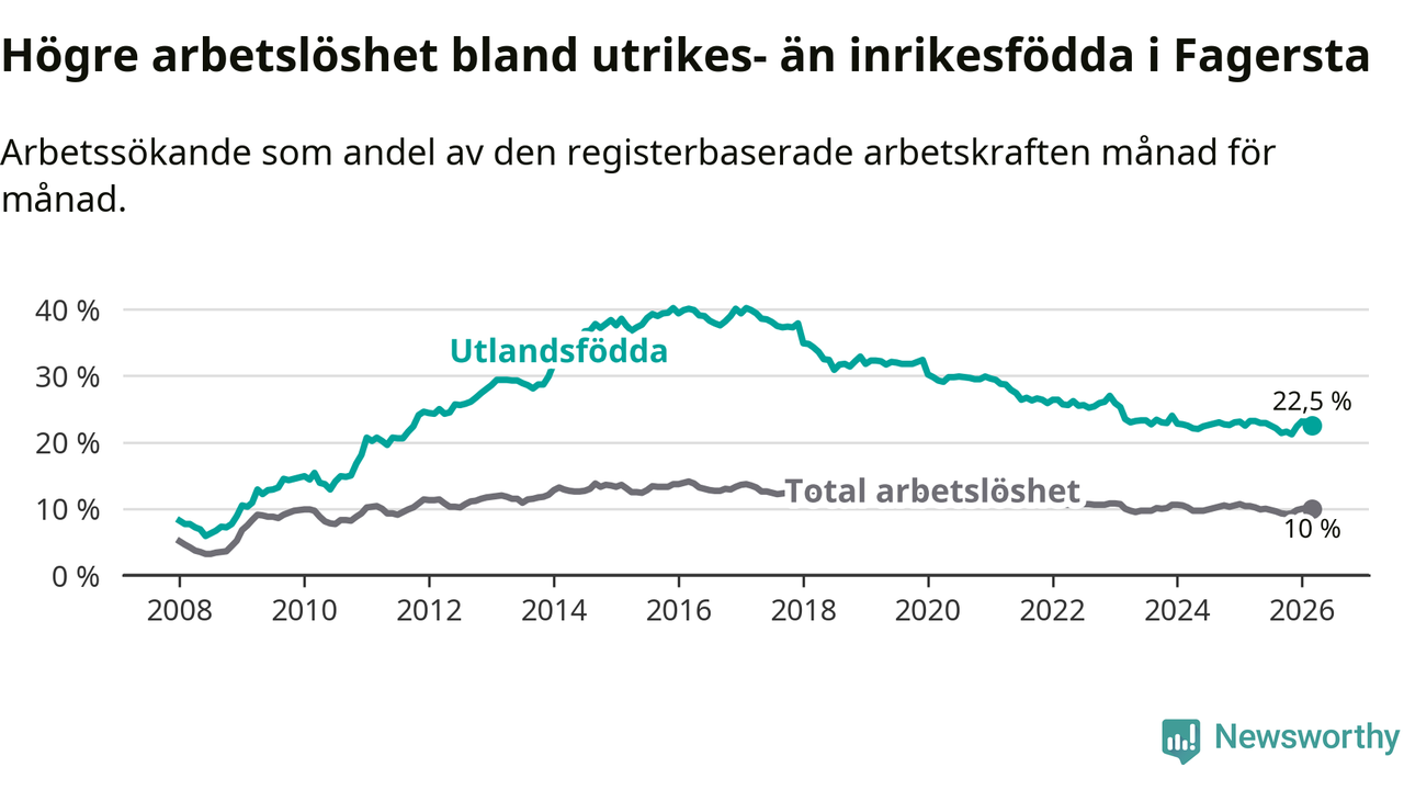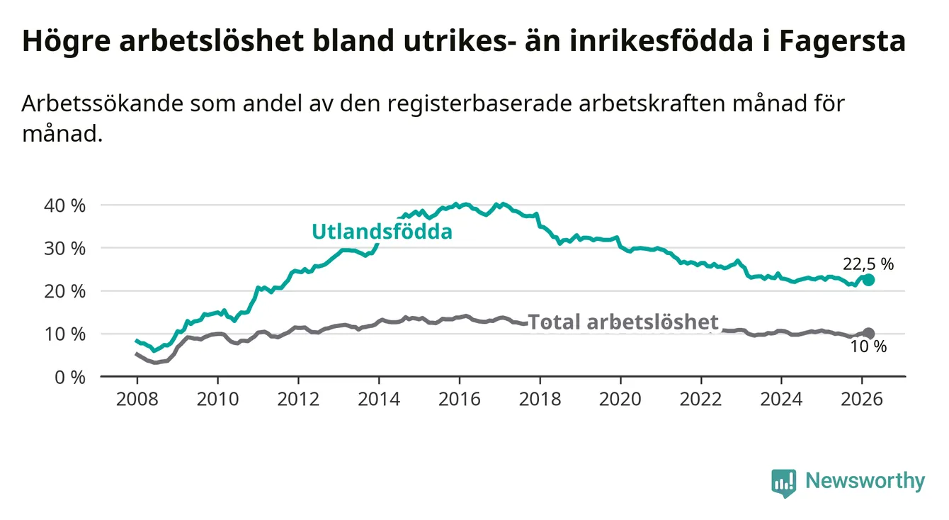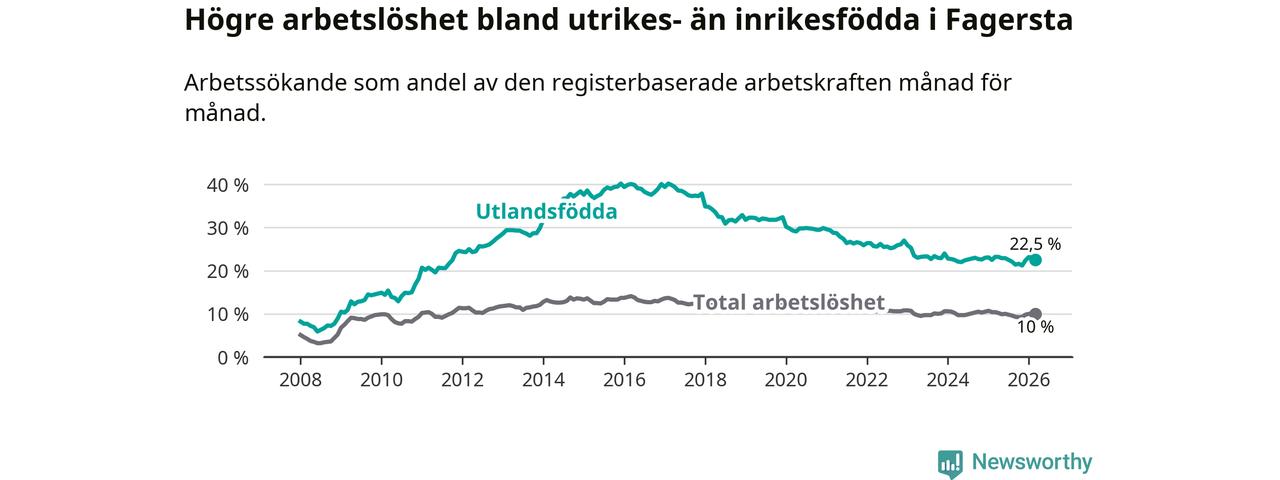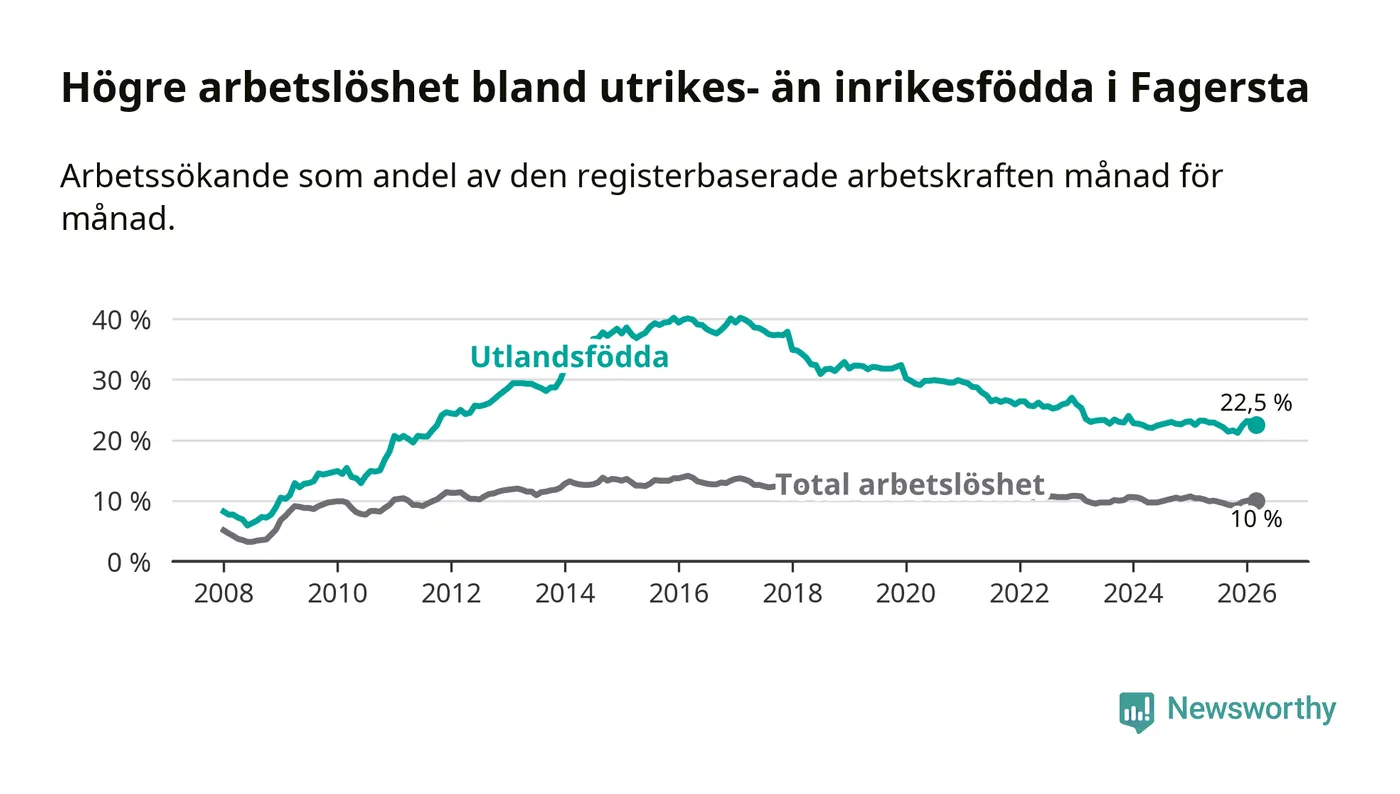 Arbetslösheten bland utlandsfödda var 22,5 procent i Fagersta under mars månad, motsvarande 408 av 1 813 personer. Det är 0,7 procentenheter färre än vid samma tidpunkt i fjol (−14 om man räknar personer). Den senaste månadens nedgång innebär ett trendbrott. Under de två föregående månaderna hade arbetslösheten bland utlandsfödda varit högre än motsvarande tidpunkt året innan.