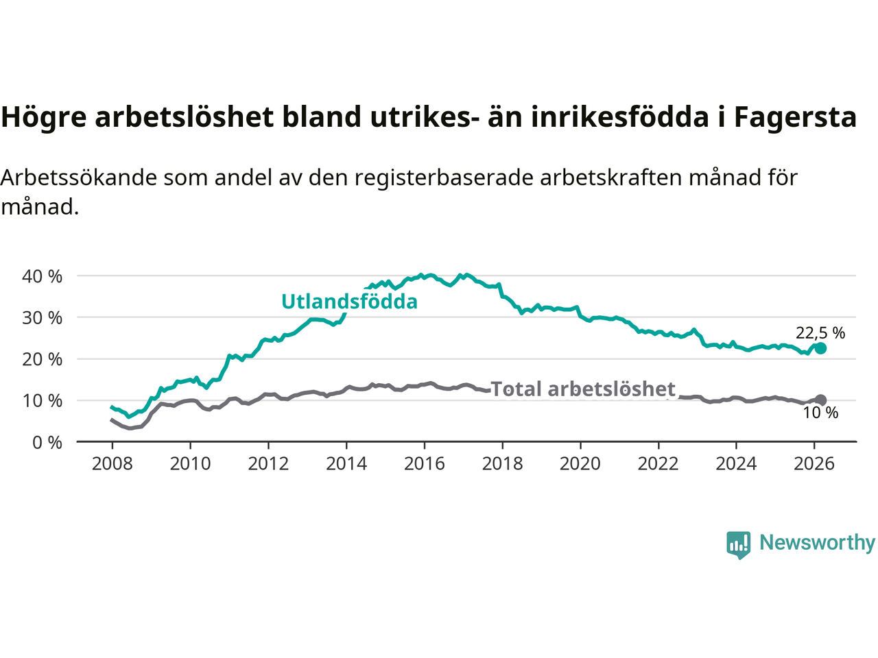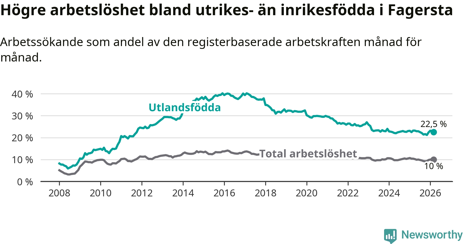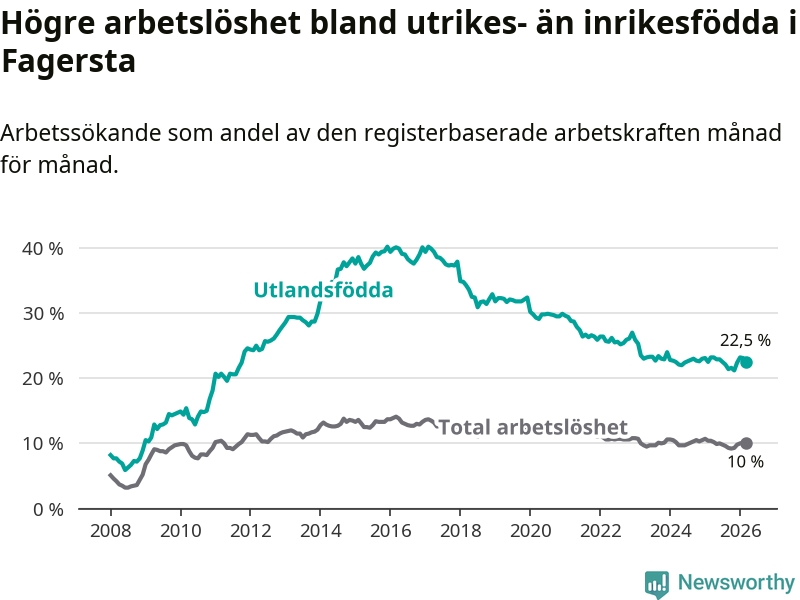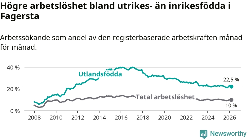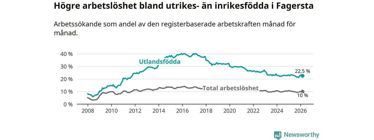 Arbetslösheten bland utlandsfödda var 22,5 procent i Fagersta under mars månad, motsvarande 408 av 1 813 personer. Det är 0,7 procentenheter färre än vid samma tidpunkt i fjol (−14 om man räknar personer). Den senaste månadens nedgång innebär ett trendbrott. Under de två föregående månaderna hade arbetslösheten bland utlandsfödda varit högre än motsvarande tidpunkt året innan.
