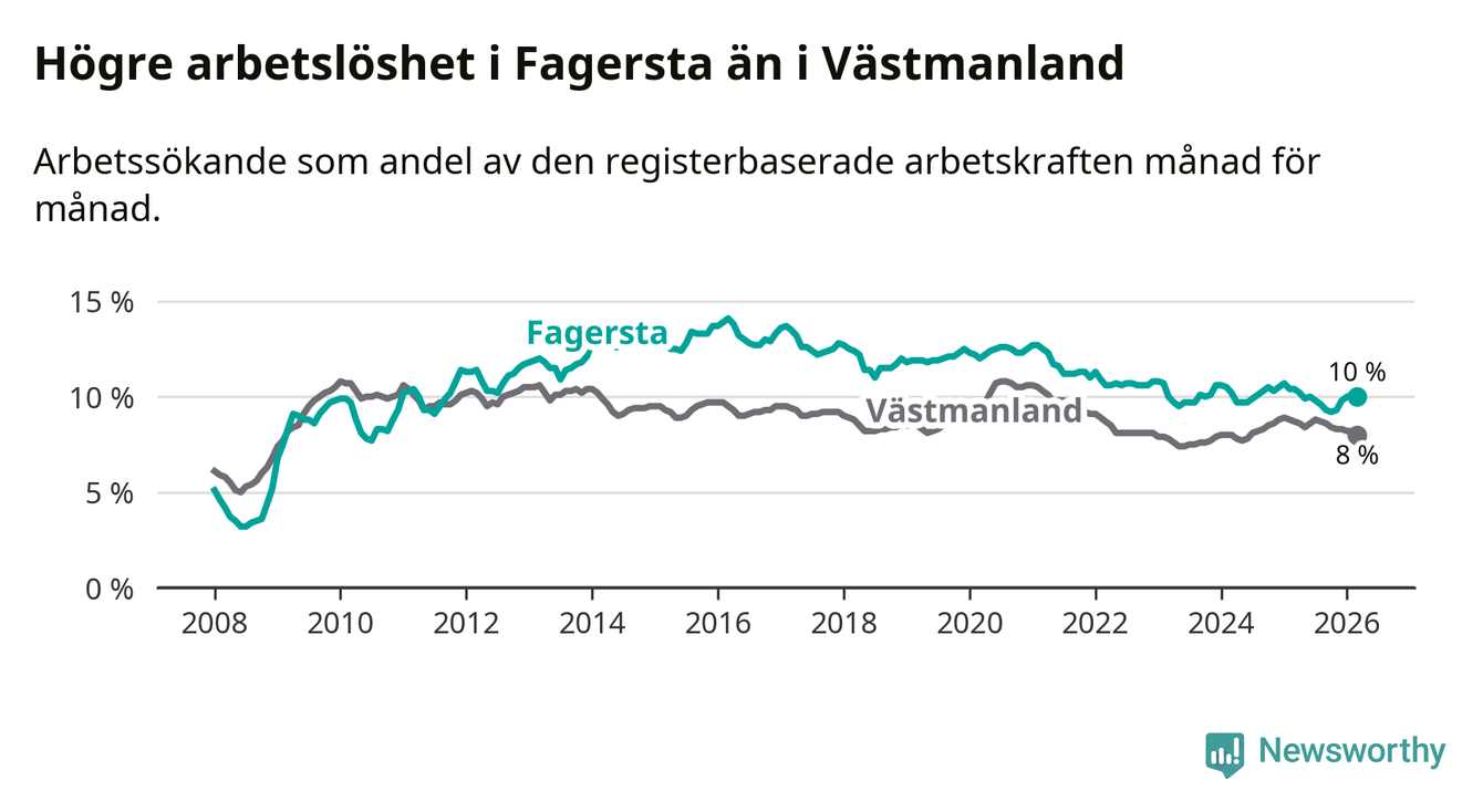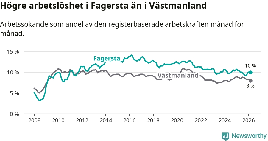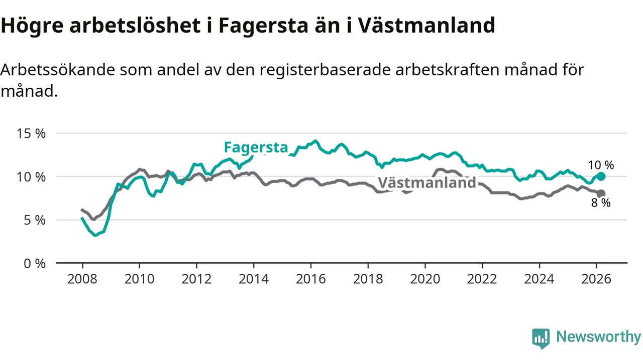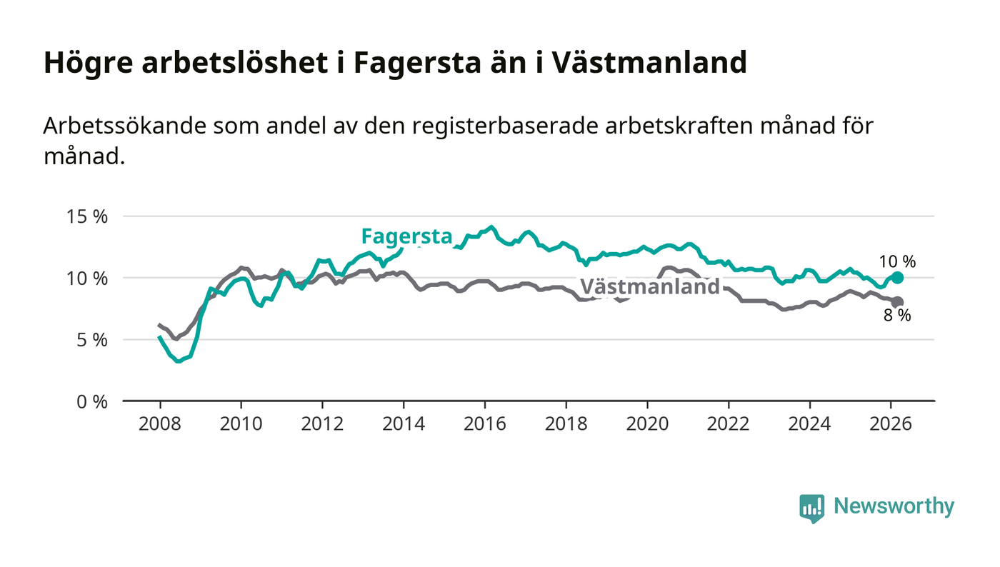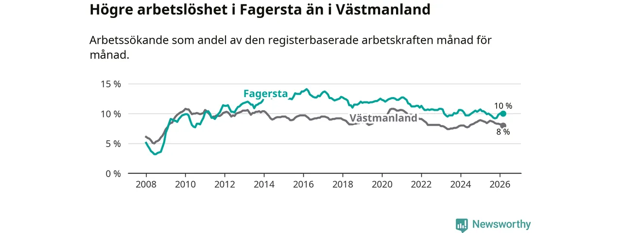 Under mars månad rapporterade Fagersta kommun en total arbetslöshet på 10,0 procent. Det är en minskning jämfört med samma tidpunkt i fjol (−0,4 procentenheter). Även i Västmanlands län sjunker arbetslösheten .