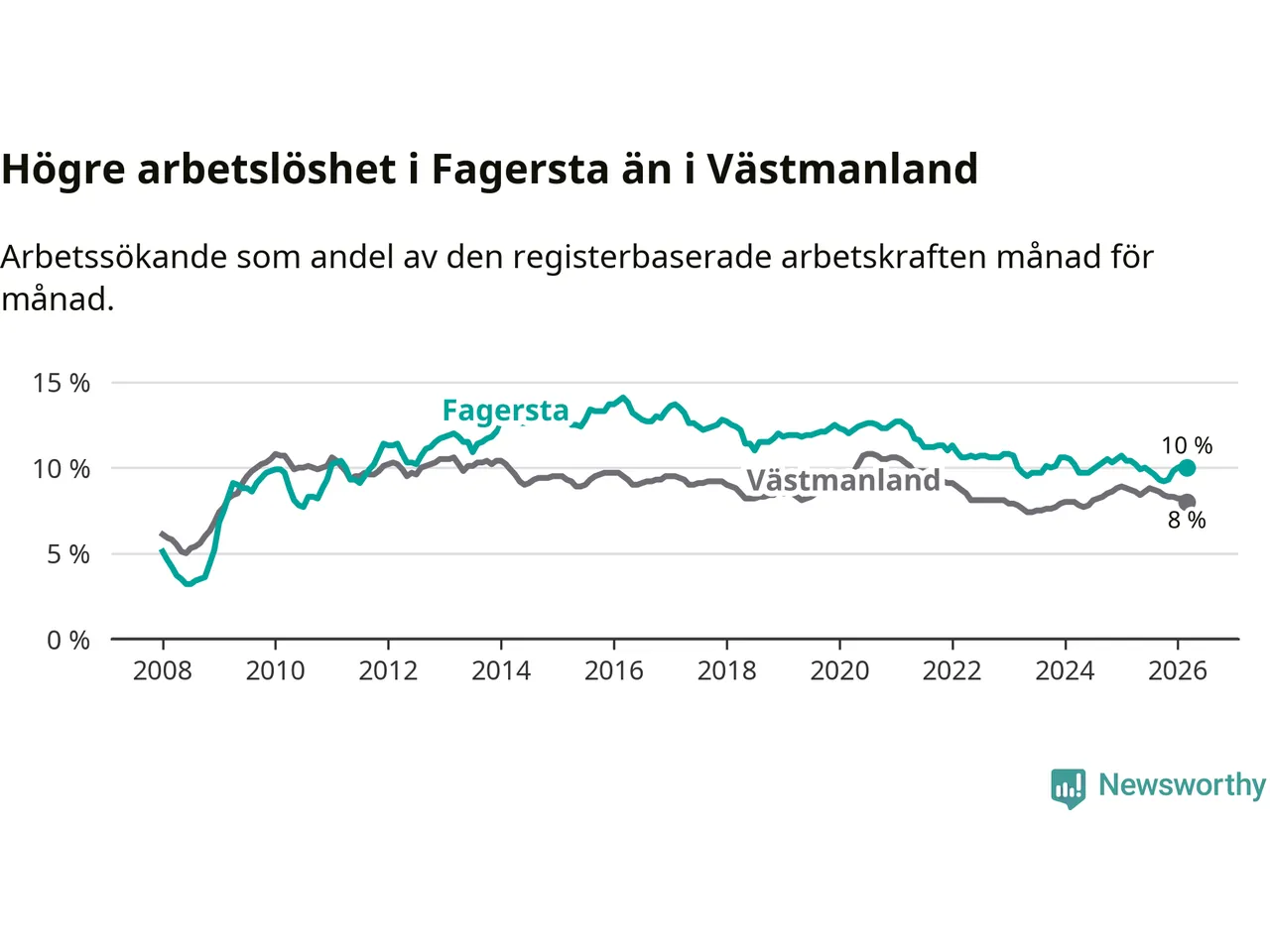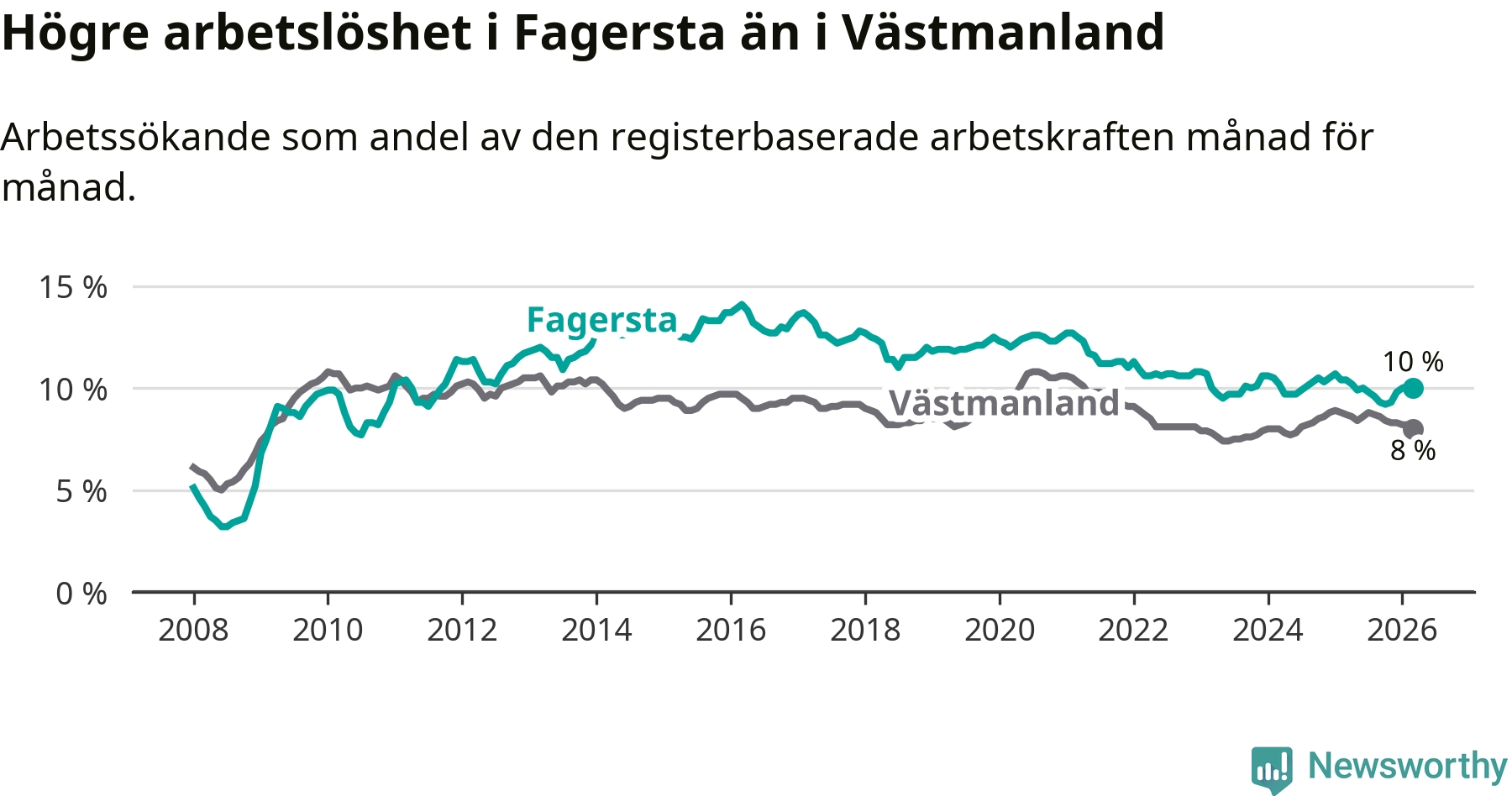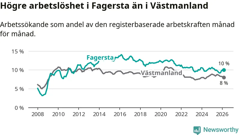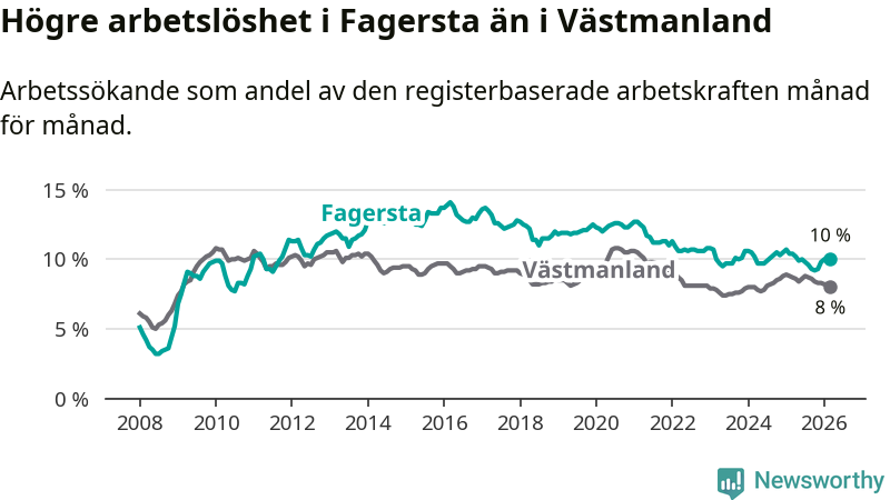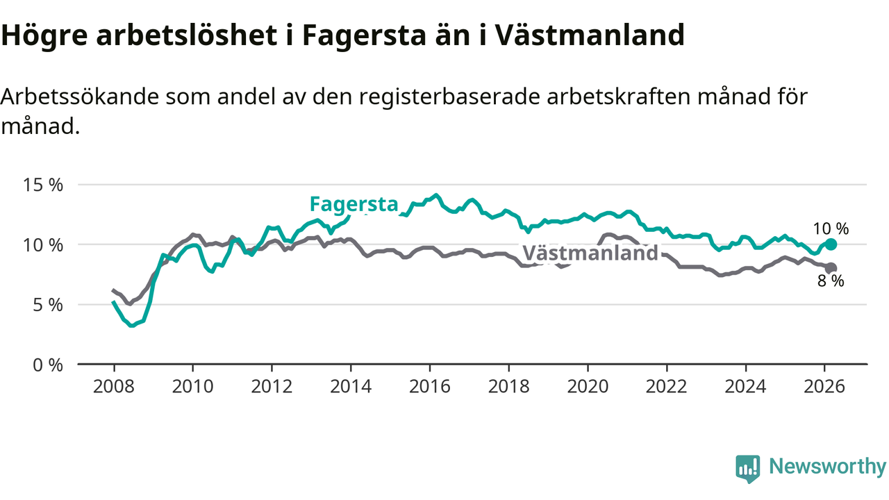 Under mars månad rapporterade Fagersta kommun en total arbetslöshet på 10,0 procent. Det är en minskning jämfört med samma tidpunkt i fjol (−0,4 procentenheter). Även i Västmanlands län sjunker arbetslösheten .