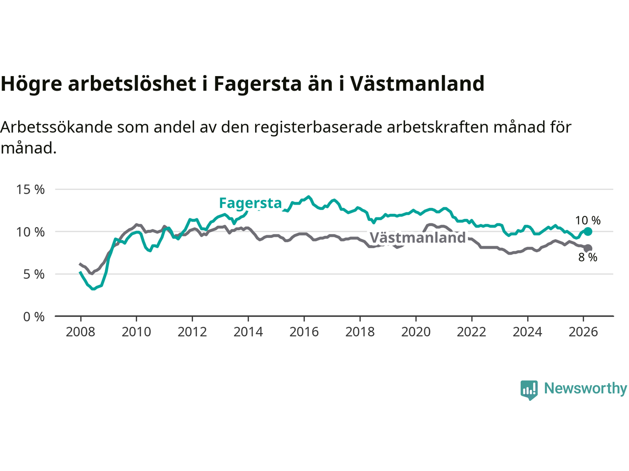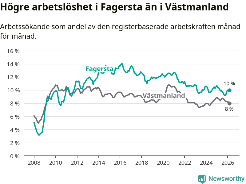 Även om arbetslösheten i Fagersta alltså minskar, så ligger den fortfarande över snittet i hela Västmanlands län (10,0 procent i kommunen, jämfört med 8,0 procent i hela länet). Fagersta har därmed även den högsta arbetslöshetsnivån i länet. Skinnskatteberg har den lägsta (6,2 procent). För att Fagersta skulle komma ner i samma arbetslöshetsnivå som Skinnskatteberg skulle 223 personer behöva sysselsättas.