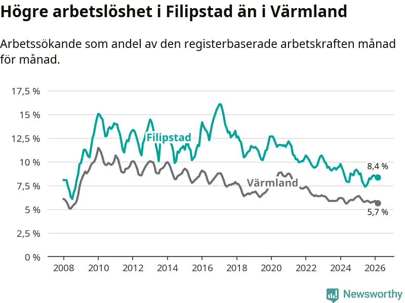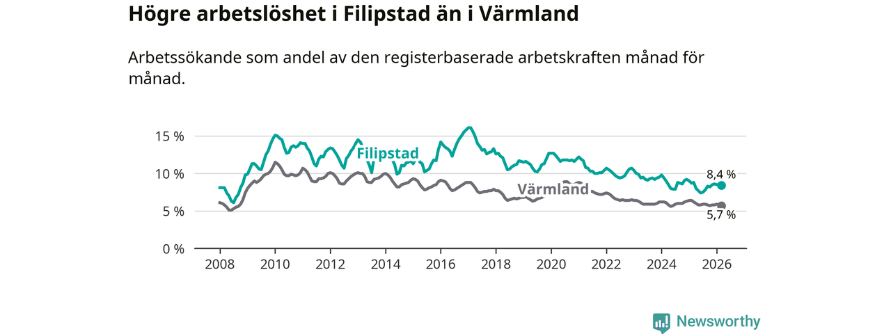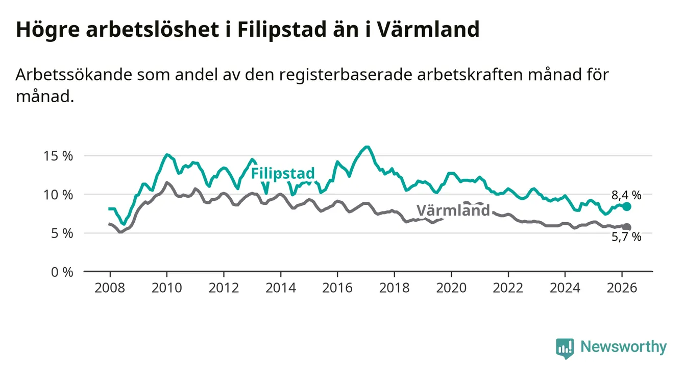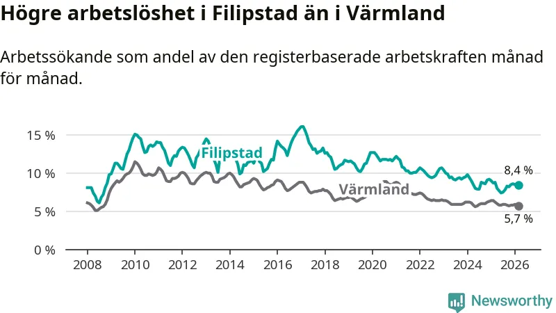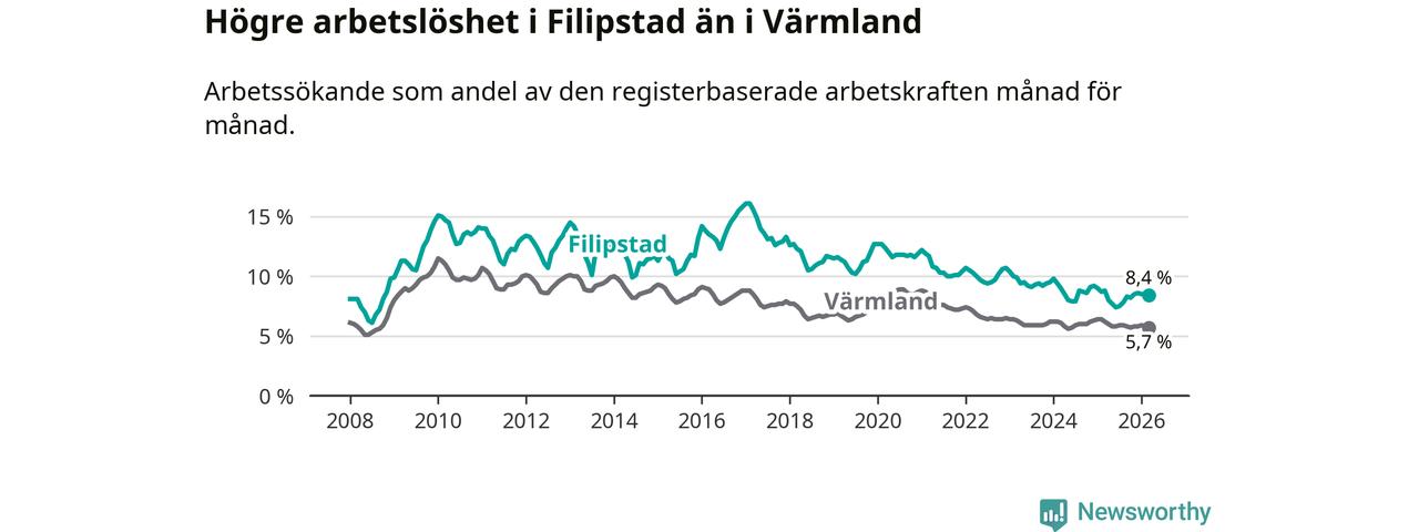 Det är 39:e månaden i följd som arbetslösheten i Filipstad är lägre än den var under samma tidpunkt året innan. Sedan december 2022 har arbetslösheten gått ner från 10,7 till 8,4 procent.