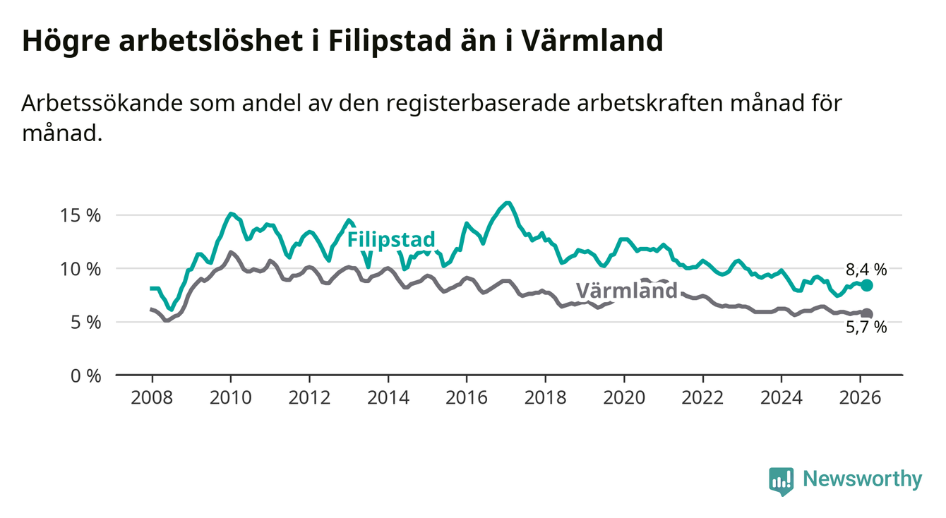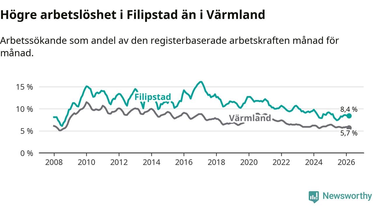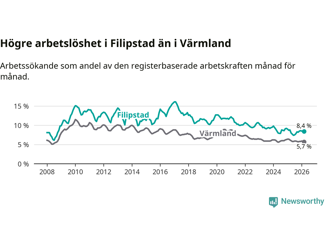 Under mars månad rapporterade Filipstads kommun en total arbetslöshet på 8,4 procent. Det är en minskning jämfört med samma tidpunkt i fjol (−0,4 procentenheter). Även i Värmlands län sjunker arbetslösheten .