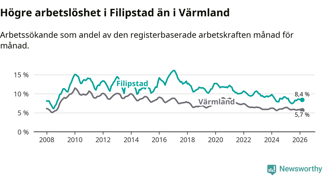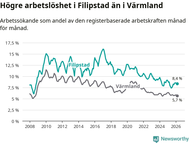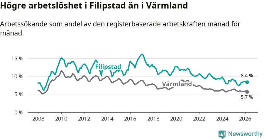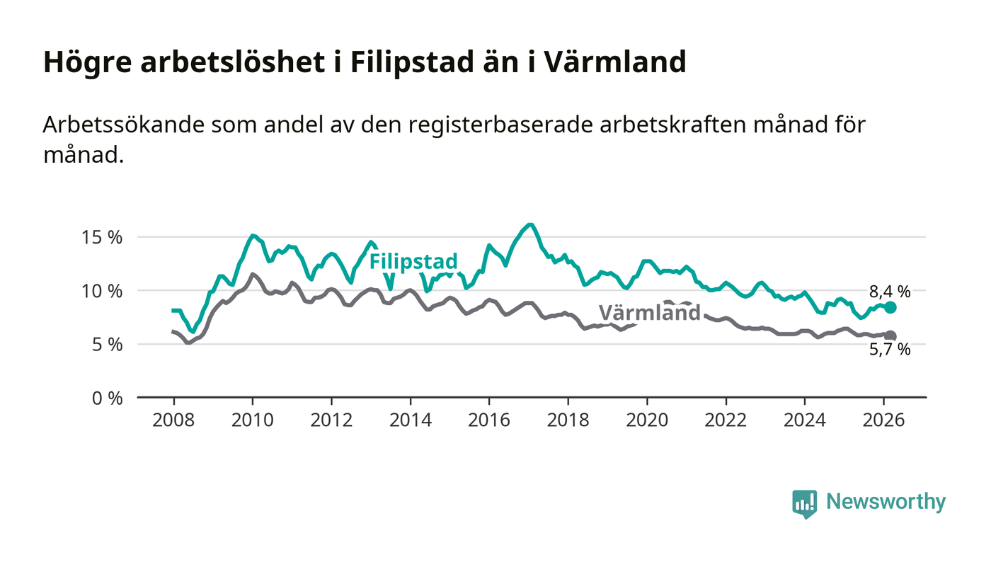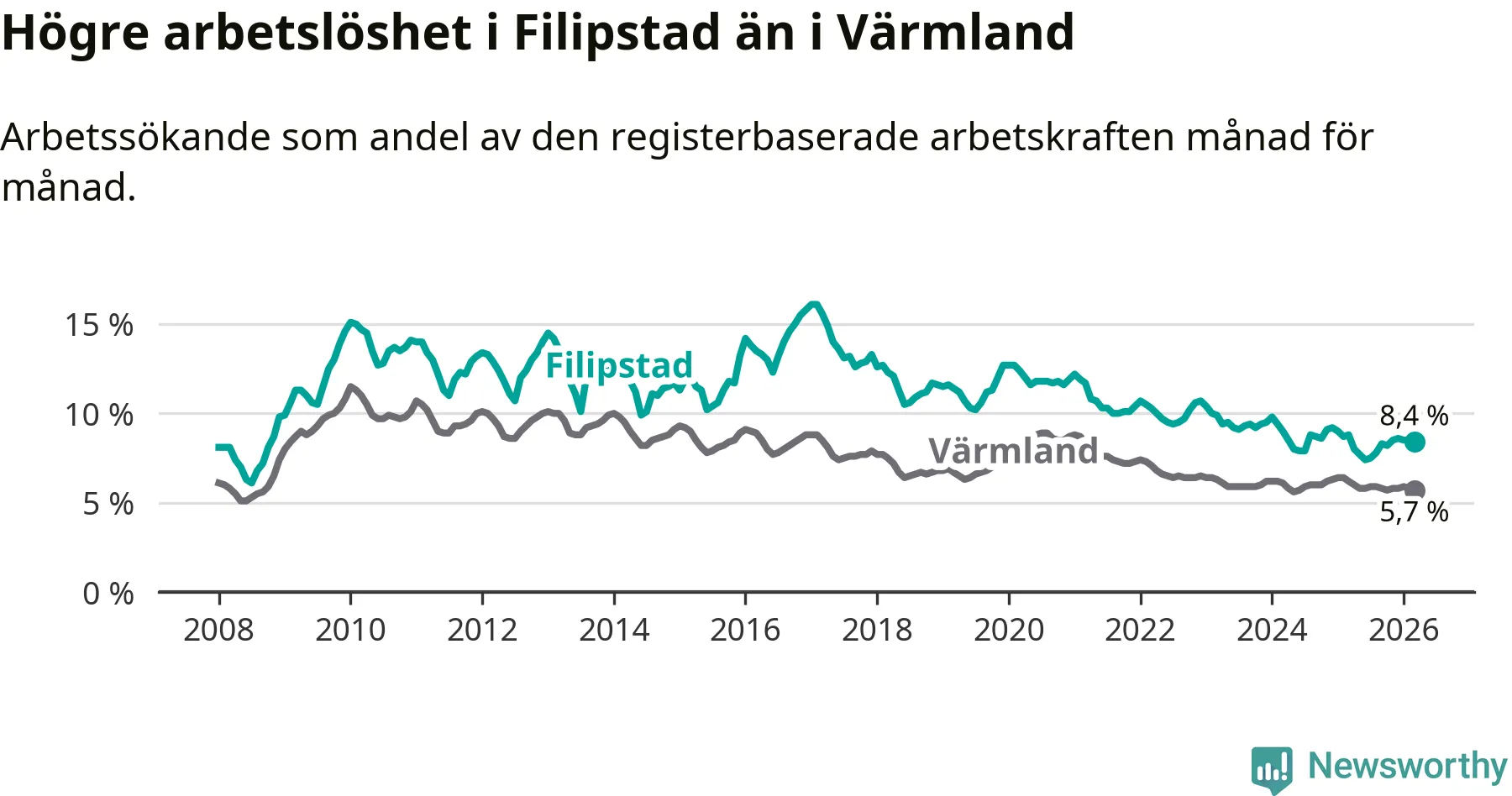 Under mars månad rapporterade Filipstads kommun en total arbetslöshet på 8,4 procent. Det är en minskning jämfört med samma tidpunkt i fjol (−0,4 procentenheter). Även i Värmlands län sjunker arbetslösheten .