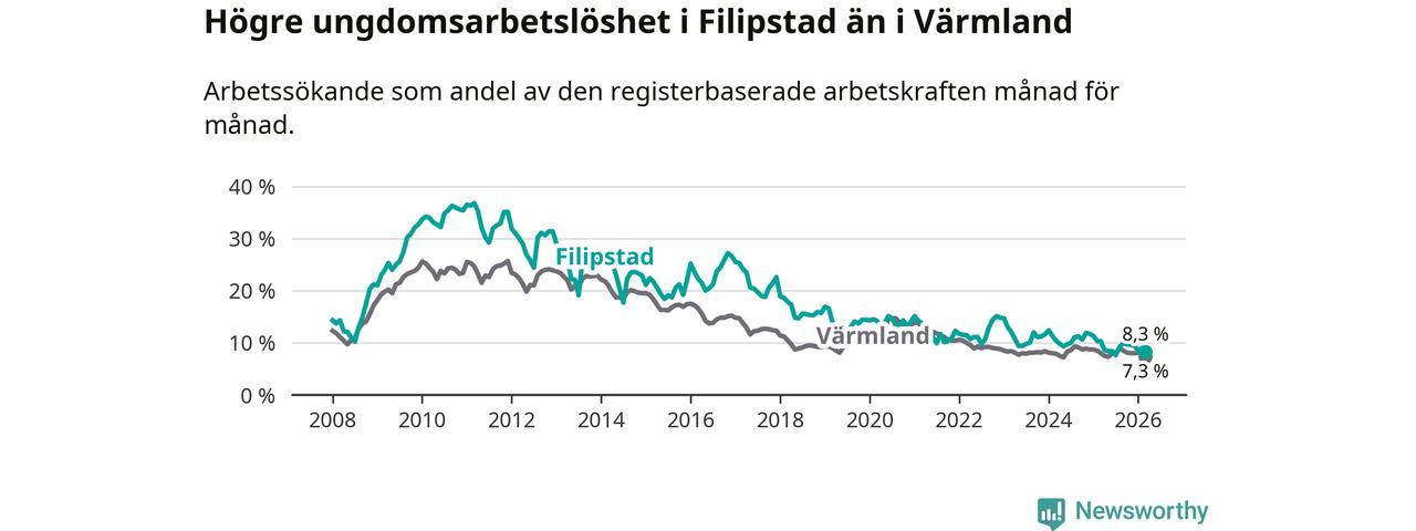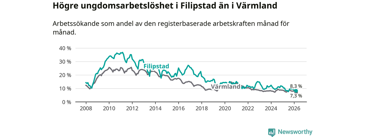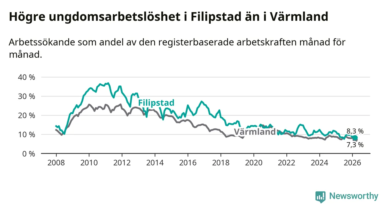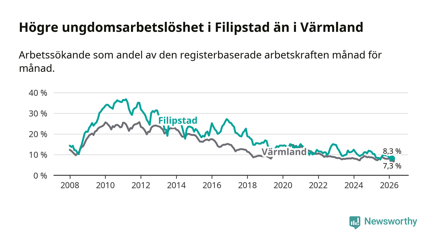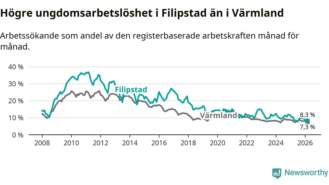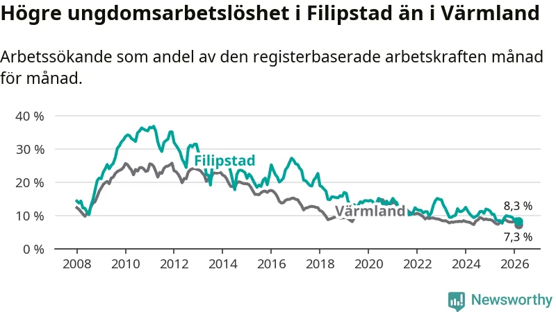 Precis som den totala arbetslösheten ligger ungdomsarbetslösheten i Filipstad högre än i Värmland som helhet. Skillnaden mellan kommunen och länet är 1,0 procentenheter.