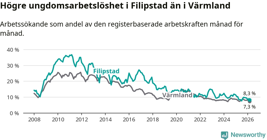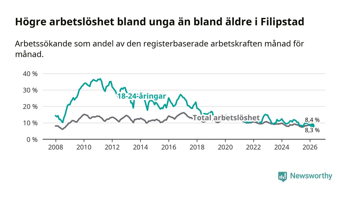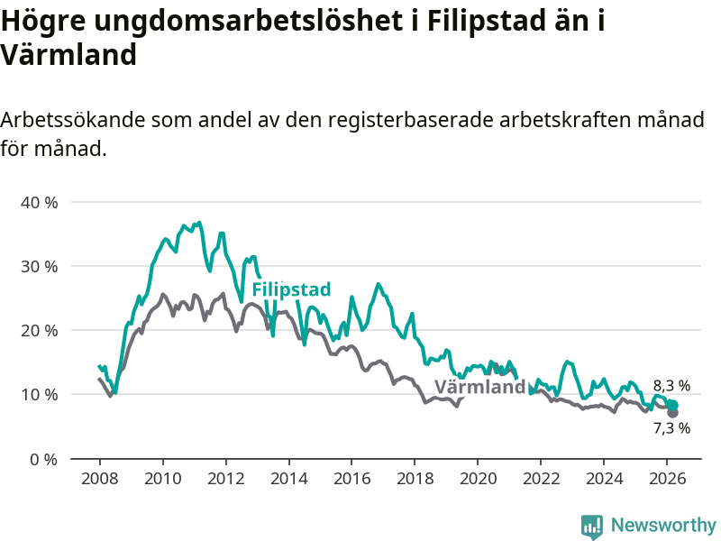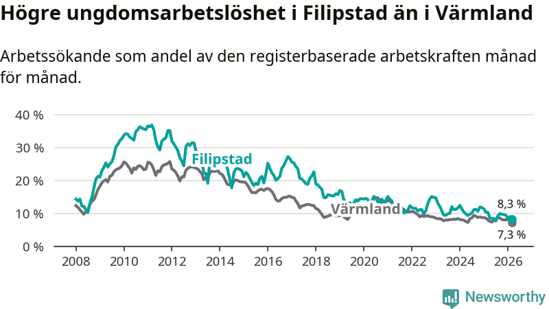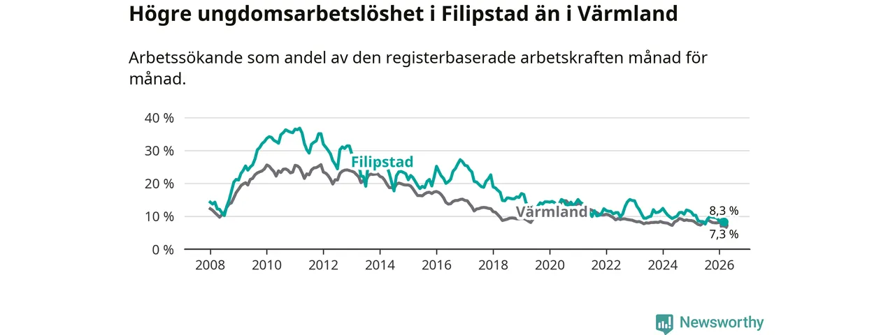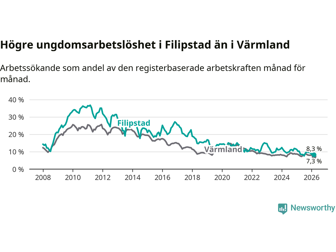 Precis som den totala arbetslösheten ligger ungdomsarbetslösheten i Filipstad högre än i Värmland som helhet. Skillnaden mellan kommunen och länet är 1,0 procentenheter.