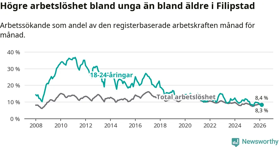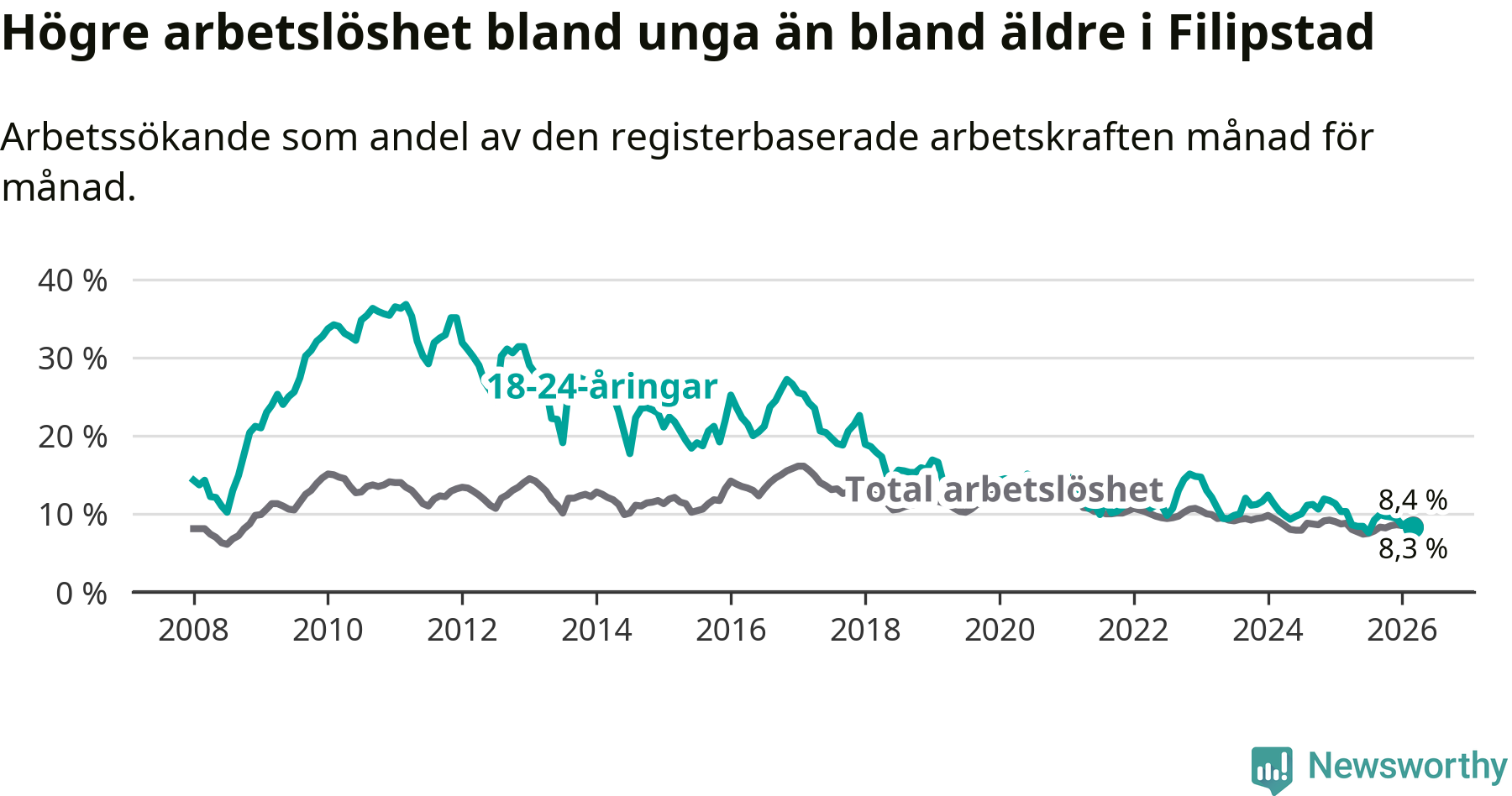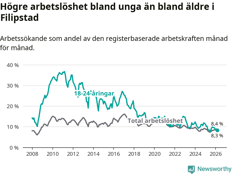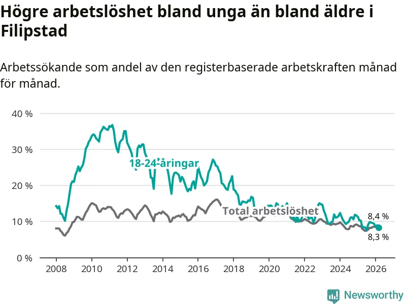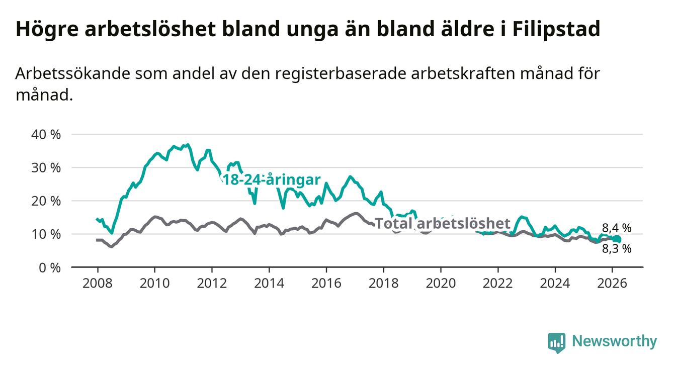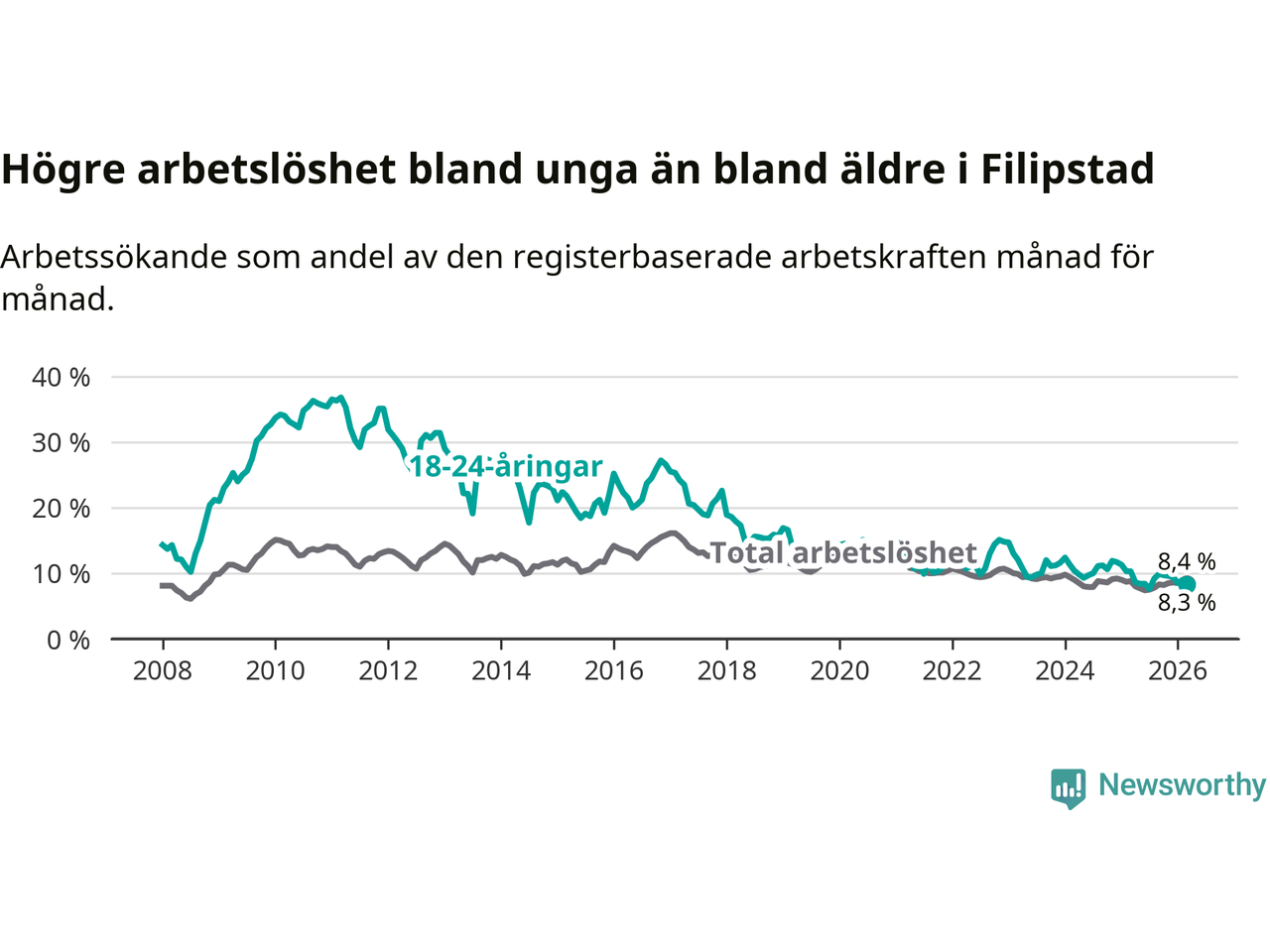 Precis som den totala arbetslösheten ligger ungdomsarbetslösheten i Filipstad högre än i Värmland som helhet. Skillnaden mellan kommunen och länet är 1,0 procentenheter.