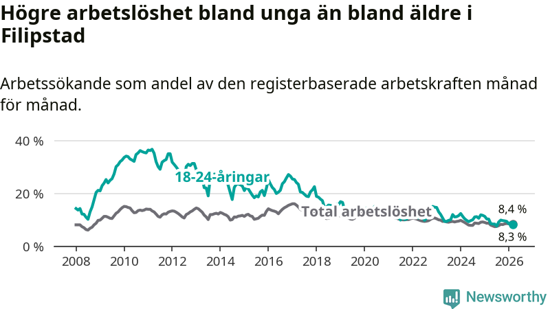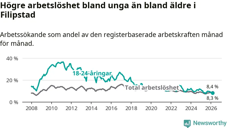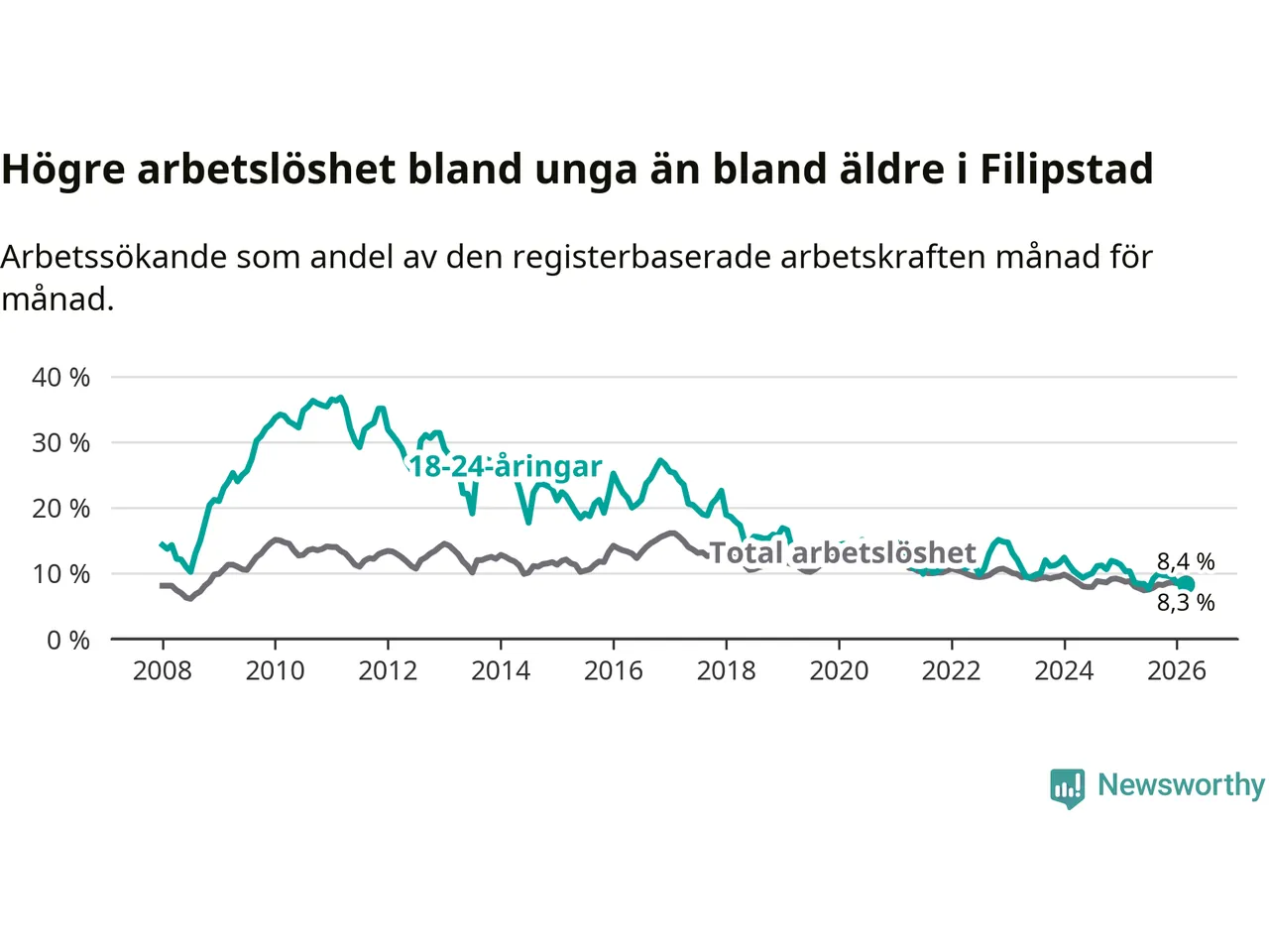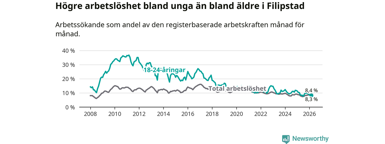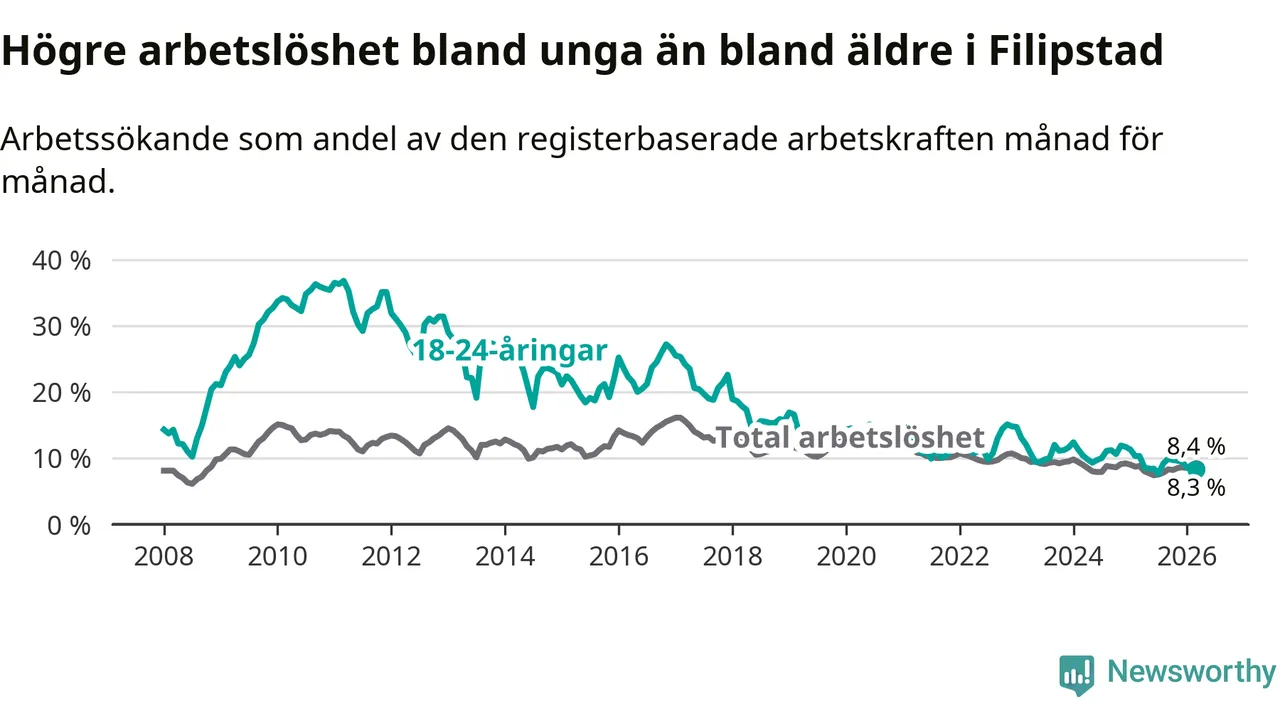 I och med den senaste månadens nedgång har de ungas arbetslöshet i Filipstad sjunkit 15 månader i följd (ner från 11,7 procent i december 2024 till 8,3 procent nu).