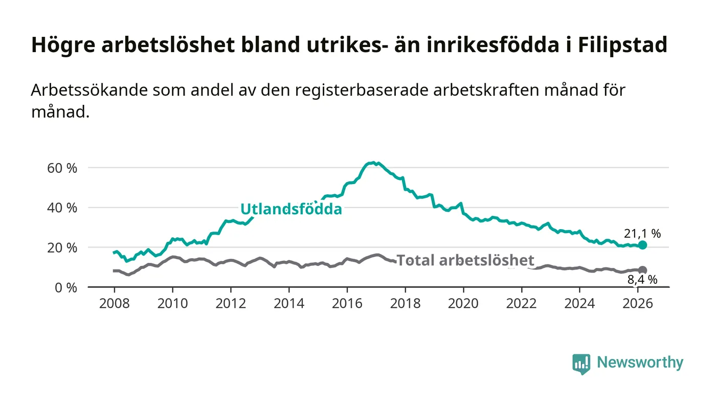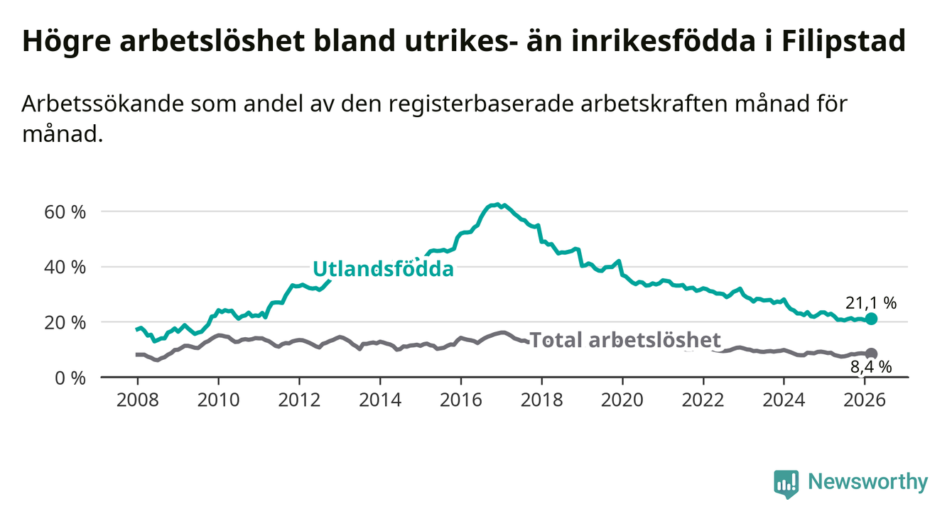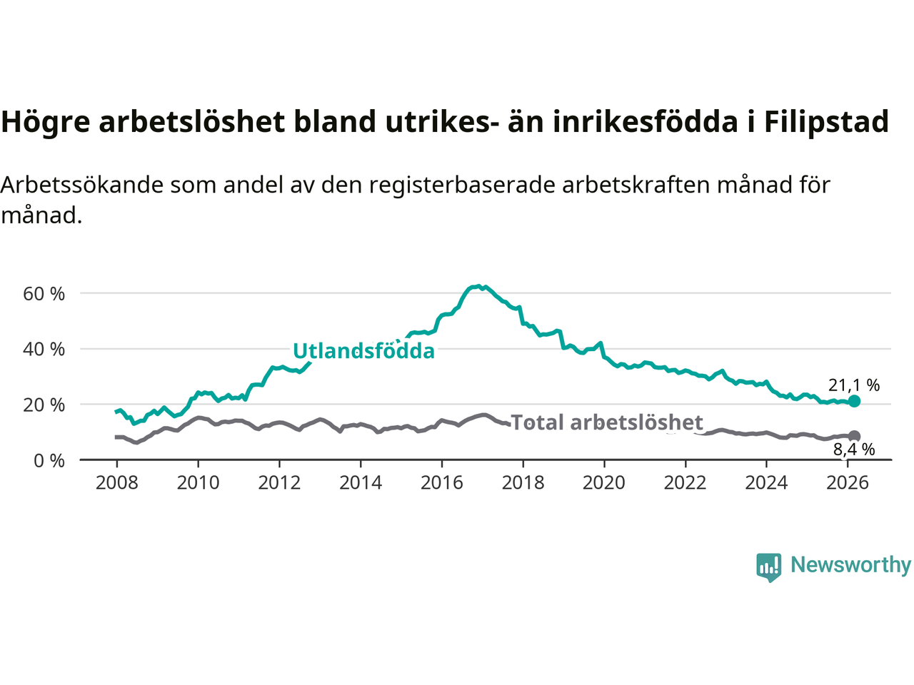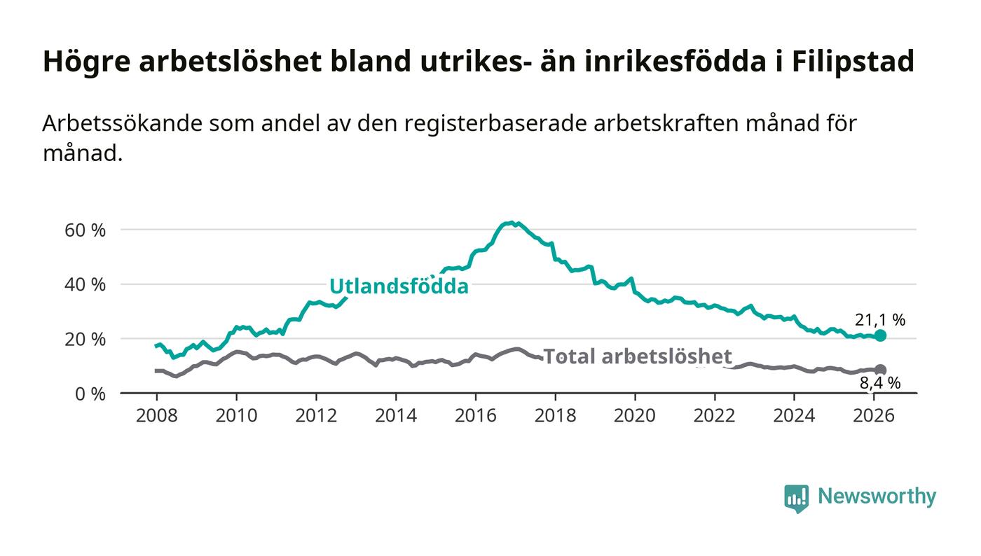 Arbetslösheten bland utlandsfödda var 21,1 procent i Filipstad under mars månad, motsvarande 158 av 749 personer. Det är 1,8 procentenheter färre än vid samma tidpunkt i fjol (−17 om man räknar personer). Därmed har de utlandsföddas arbetslöshet varit lägre än vid samma tidpunkt i fjol i över tre år i sträck. Sedan december 2022 har arbetslösheten bland utlandsfödda minskat från 32,0 till 21,1 procent.