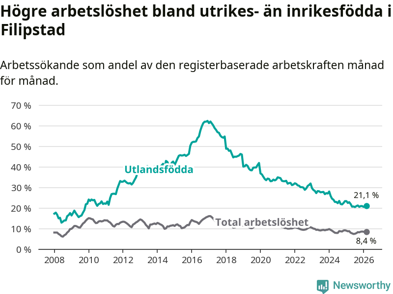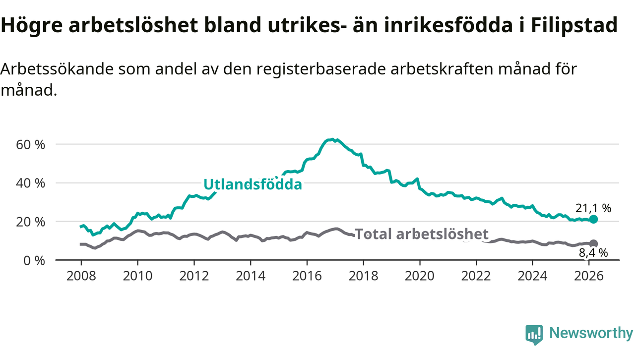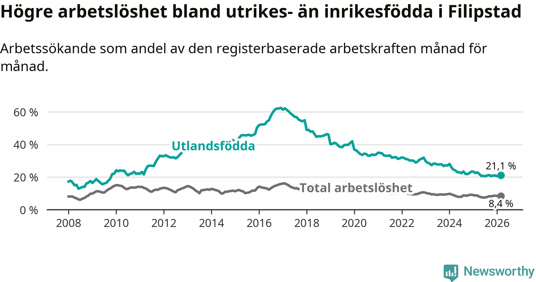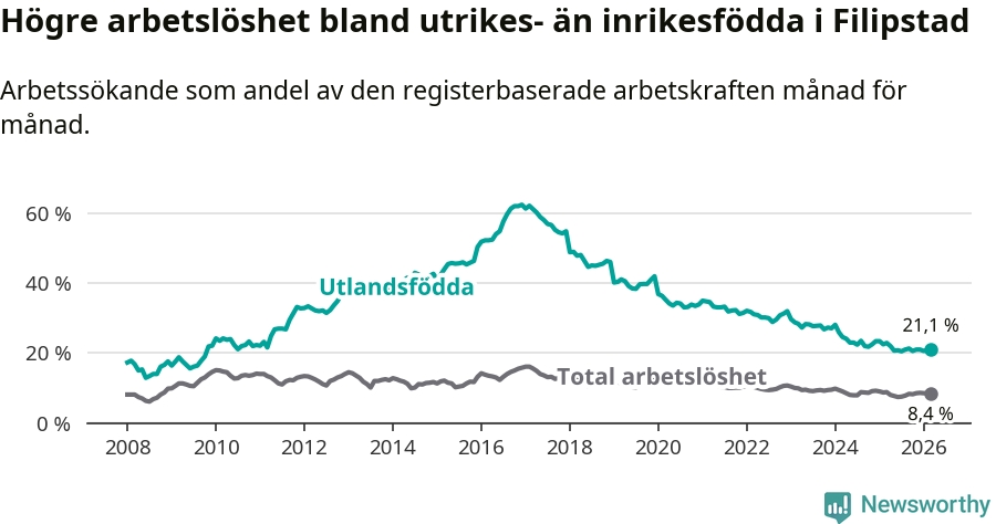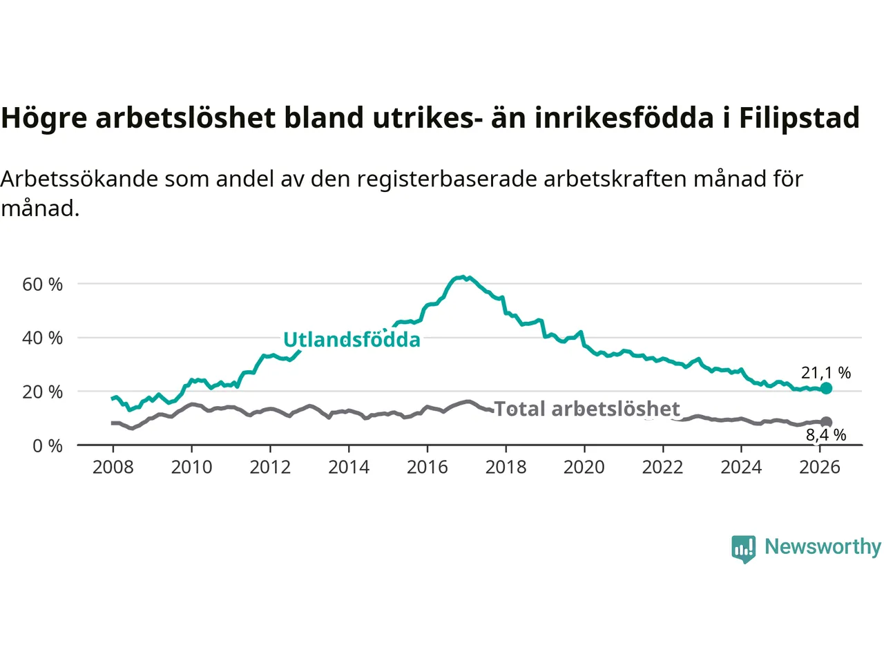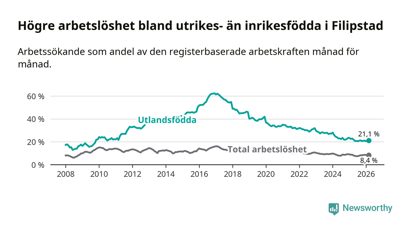 Arbetslösheten bland utlandsfödda var 21,1 procent i Filipstad under mars månad, motsvarande 158 av 749 personer. Det är 1,8 procentenheter färre än vid samma tidpunkt i fjol (−17 om man räknar personer). Därmed har de utlandsföddas arbetslöshet varit lägre än vid samma tidpunkt i fjol i över tre år i sträck. Sedan december 2022 har arbetslösheten bland utlandsfödda minskat från 32,0 till 21,1 procent.