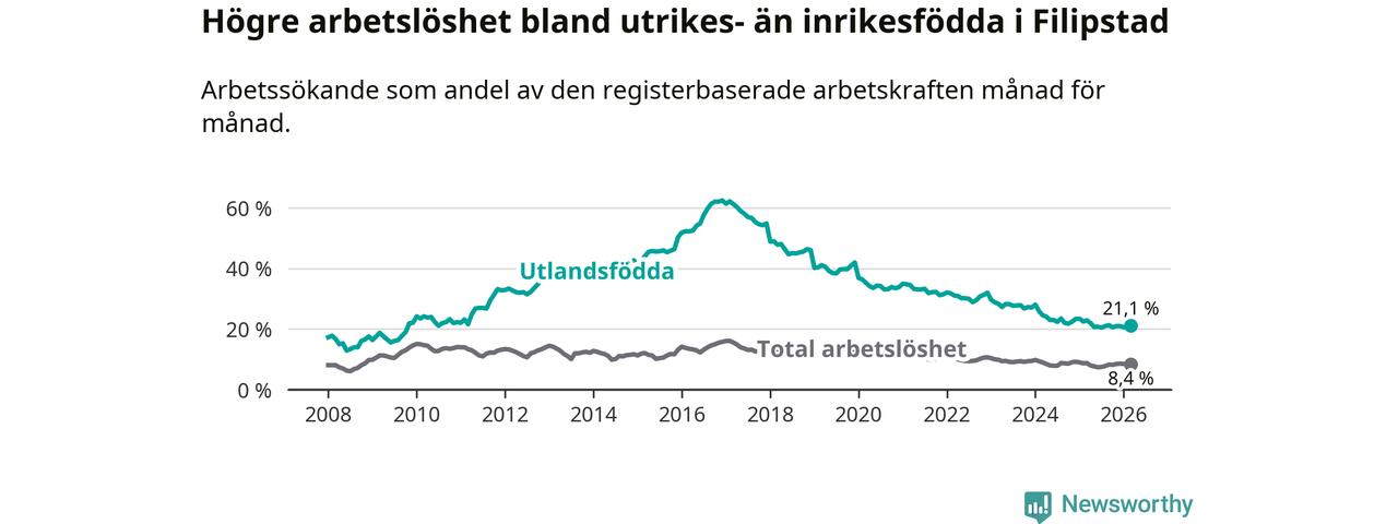 Skillnaden i arbetslöshet mellan utrikesfödda och hela befolkningen är 12,7 procentenheter i Filipstad. Det är en mindre skillnad än för ett år sedan (−1,4 procentenheter).