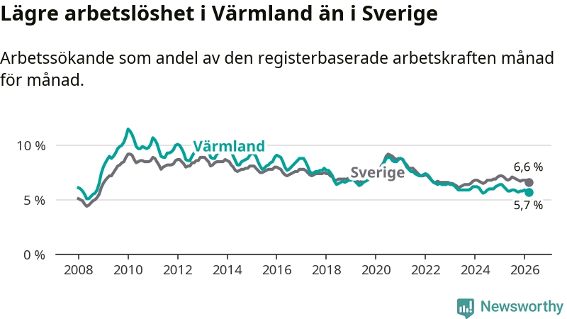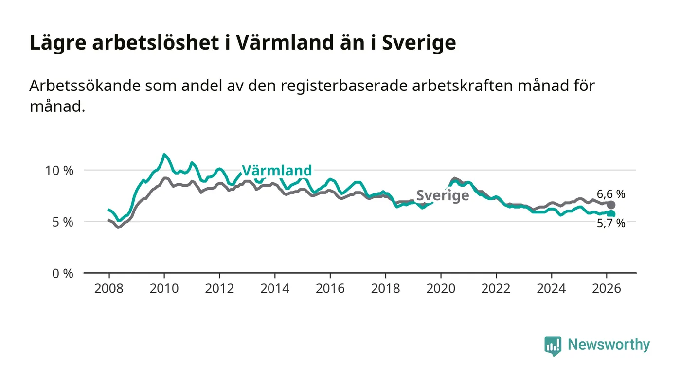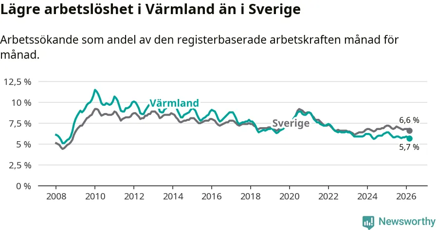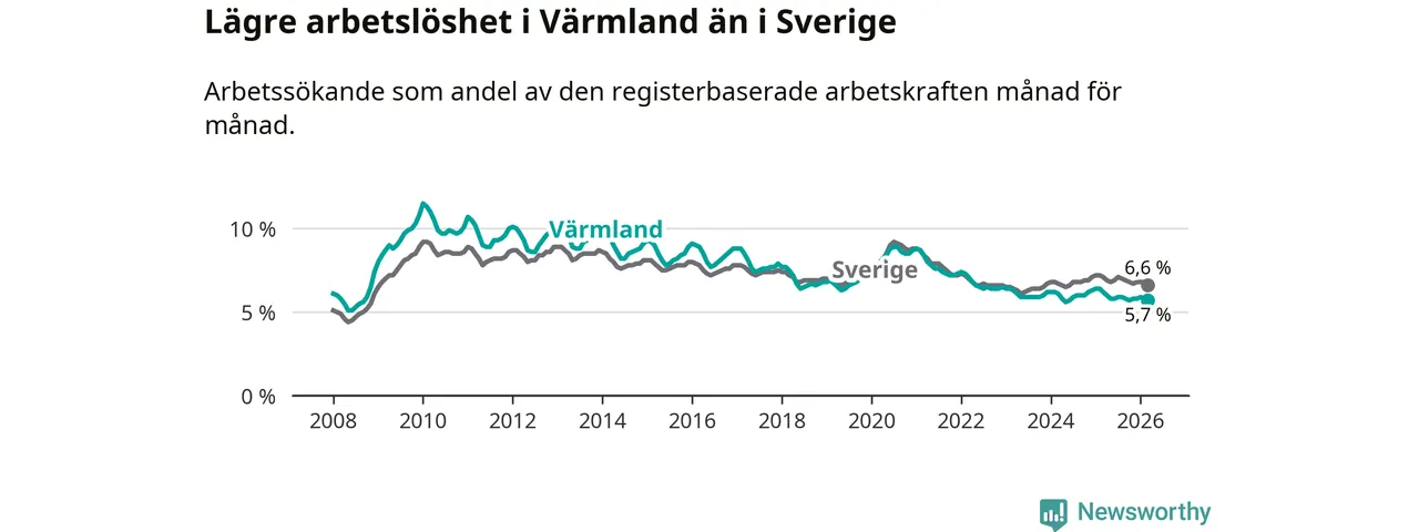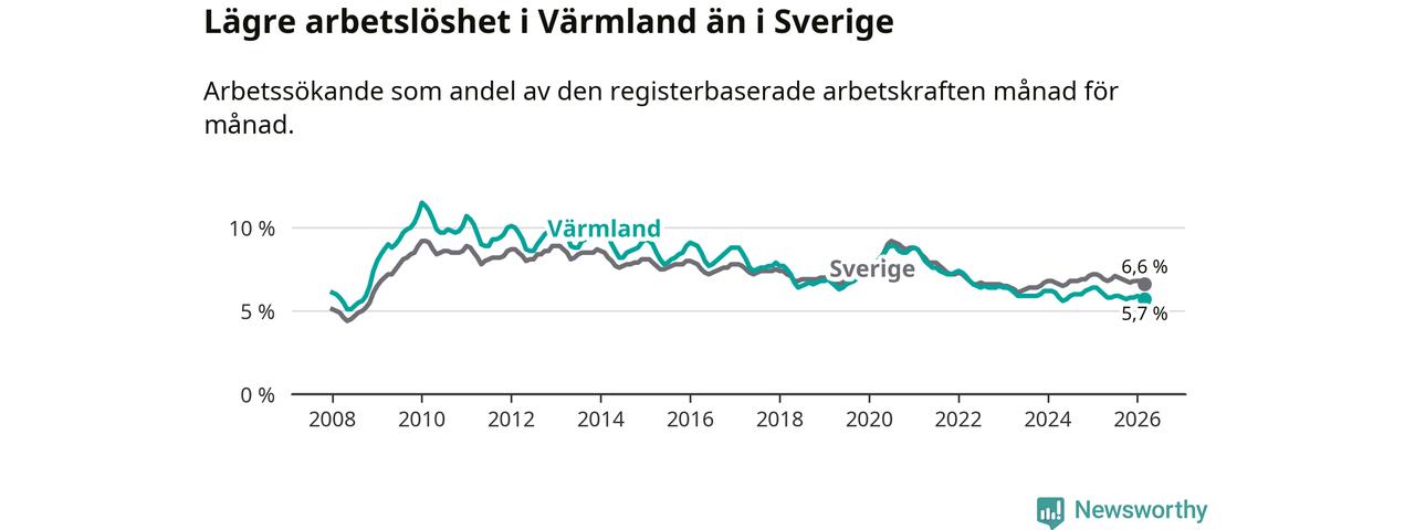 Under mars månad rapporterade Värmlands län en total arbetslöshet på 5,7 procent. Det är en minskning jämfört med samma tidpunkt i fjol (−0,5 procentenheter). Även i Sverige sjunker arbetslösheten .