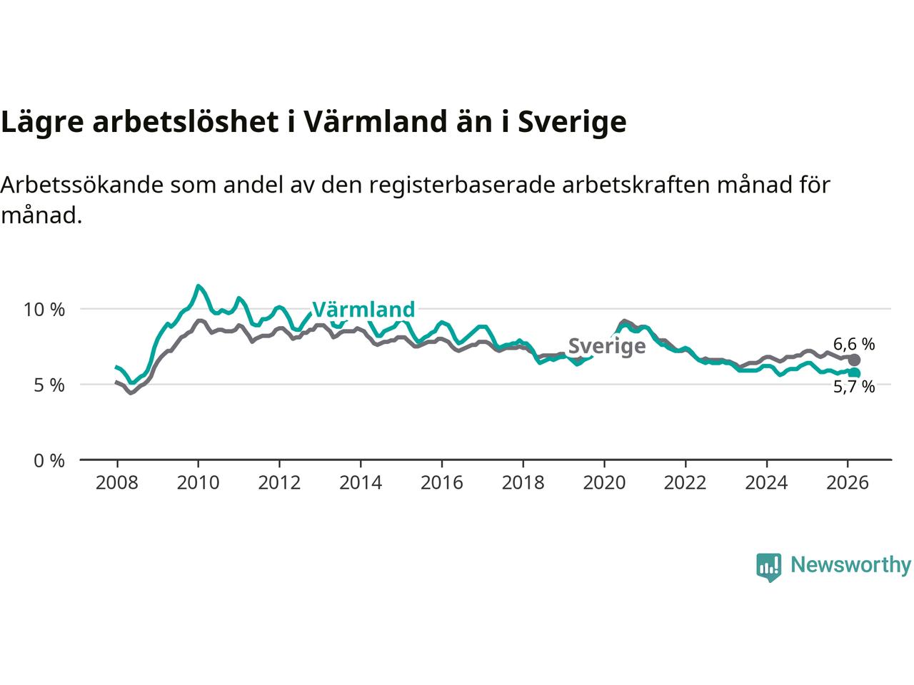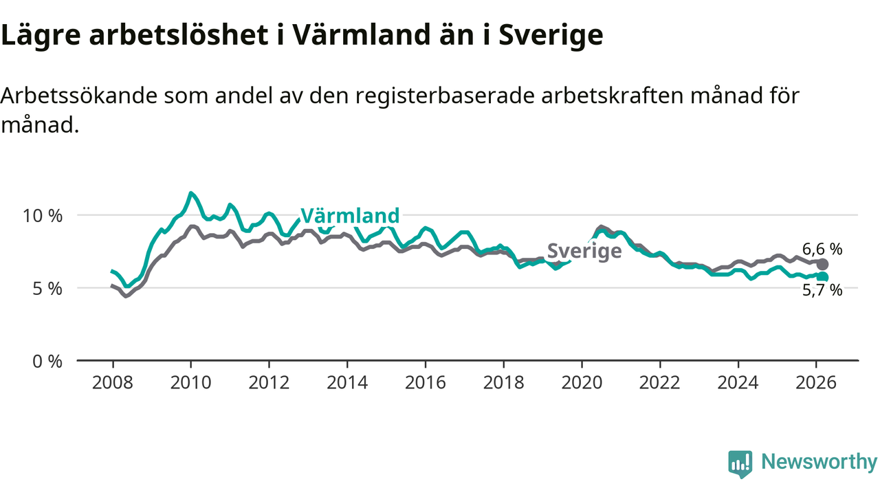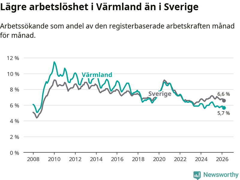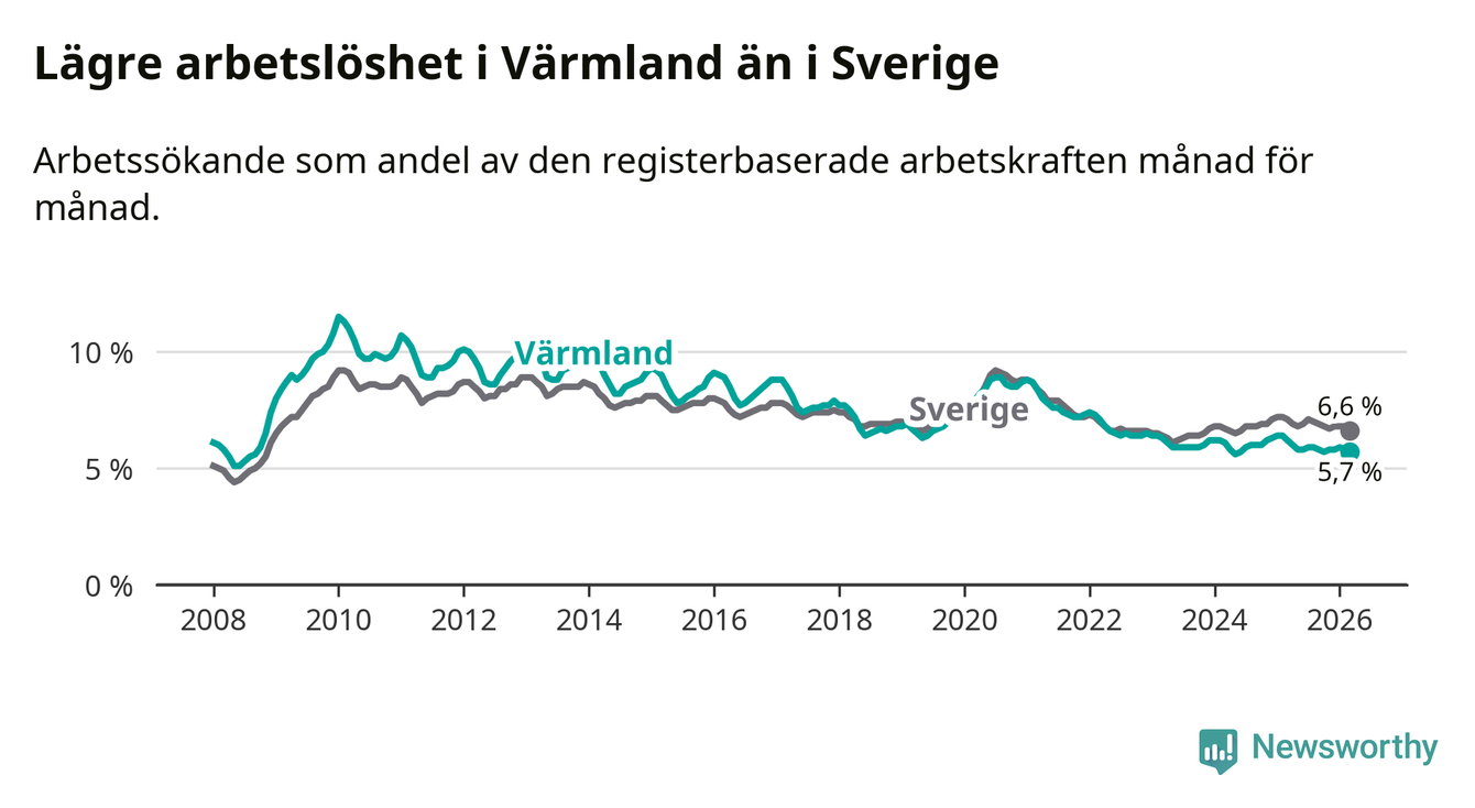 Under mars månad rapporterade Värmlands län en total arbetslöshet på 5,7 procent. Det är en minskning jämfört med samma tidpunkt i fjol (−0,5 procentenheter). Även i Sverige sjunker arbetslösheten .