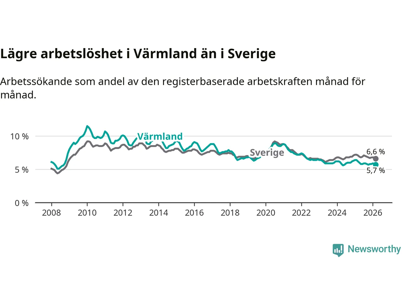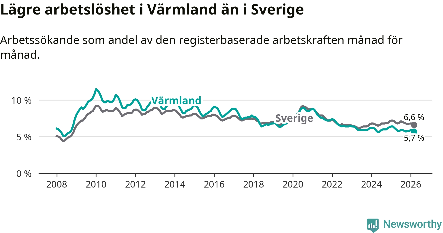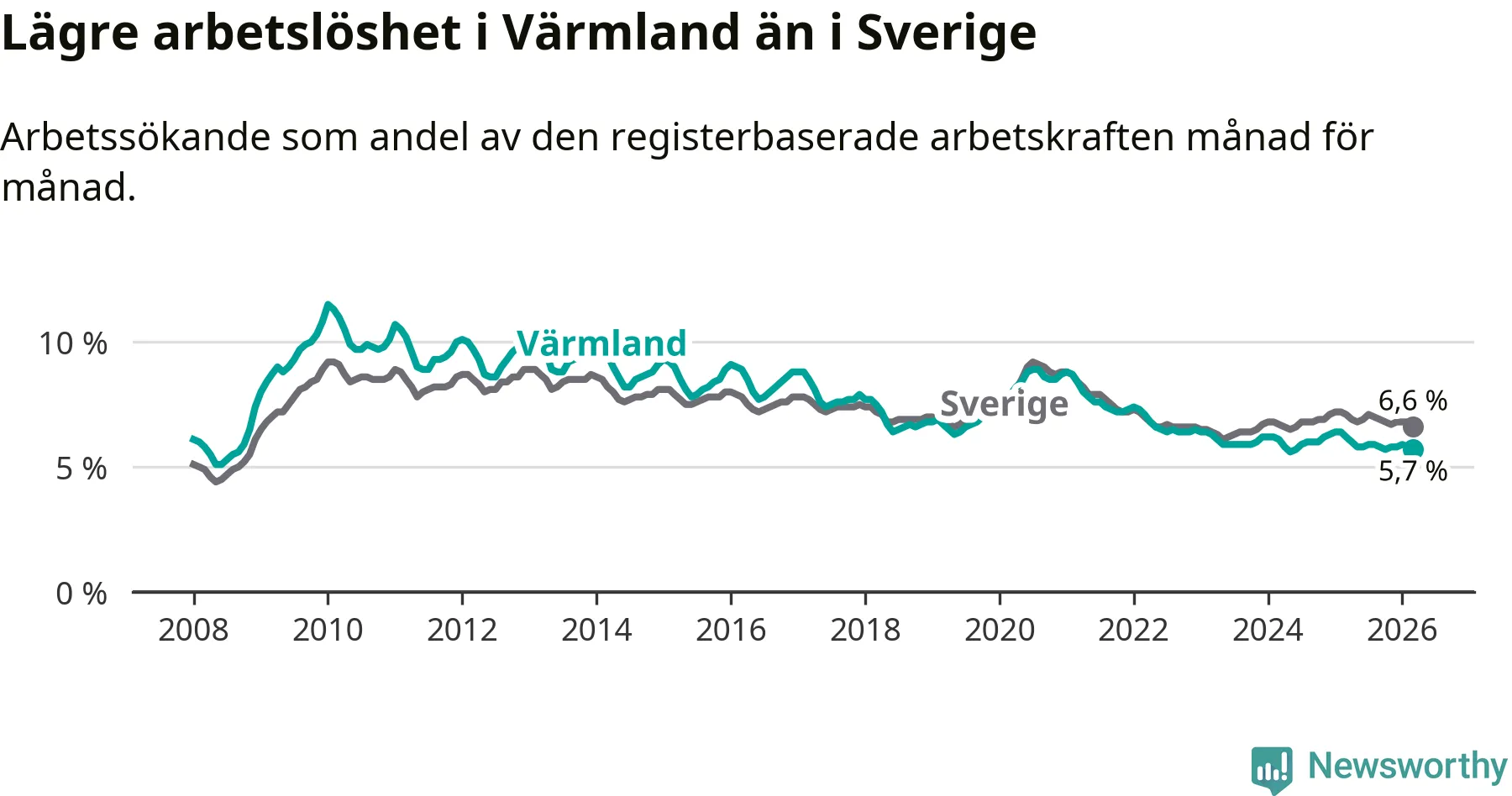 Värmland hade redan tidigare lägre arbetslöshet än snittet i hela Sverige och nu växer klyftan (5,7 procent i länet, jämfört med 6,6 procent i hela riket). Norrbotten har den lägsta arbetslösheten i riket (3,8 procent), medan Skåne har den högsta (8,6 procent). För att Värmland skulle komma ner i samma arbetslöshetsnivå som Norrbotten skulle 2 558 personer behöva sysselsättas.
