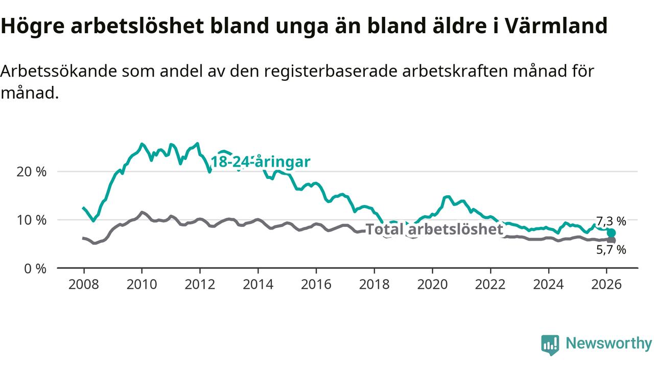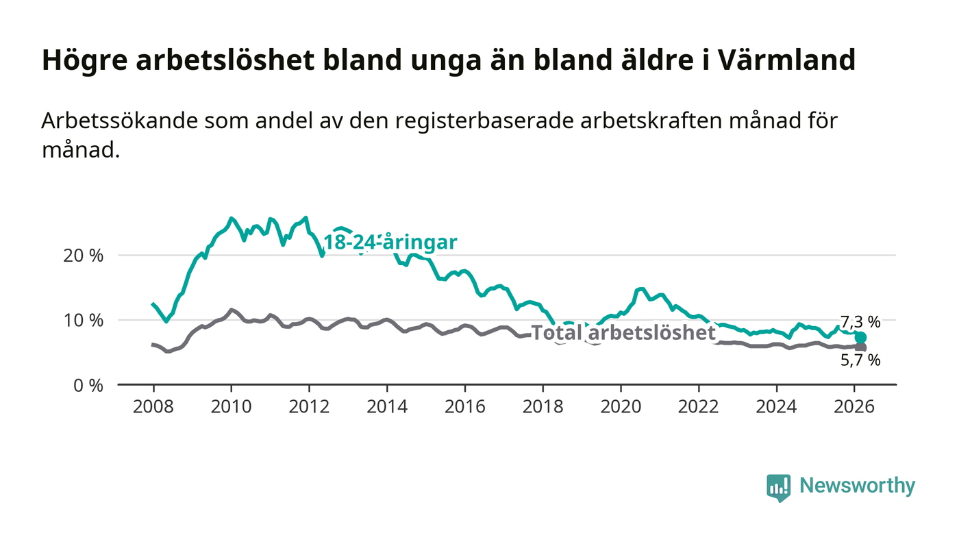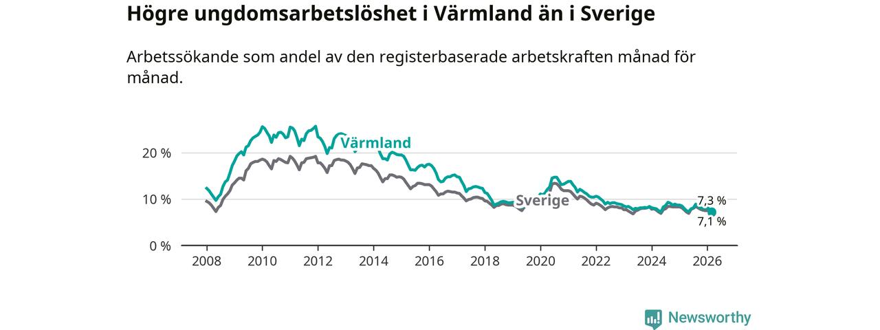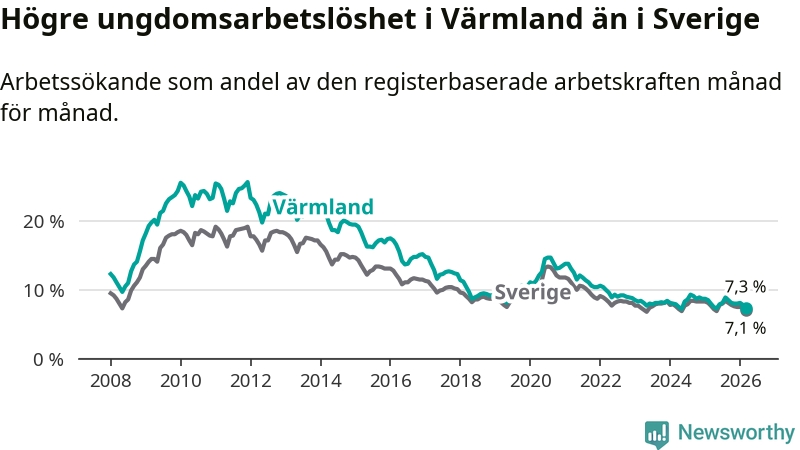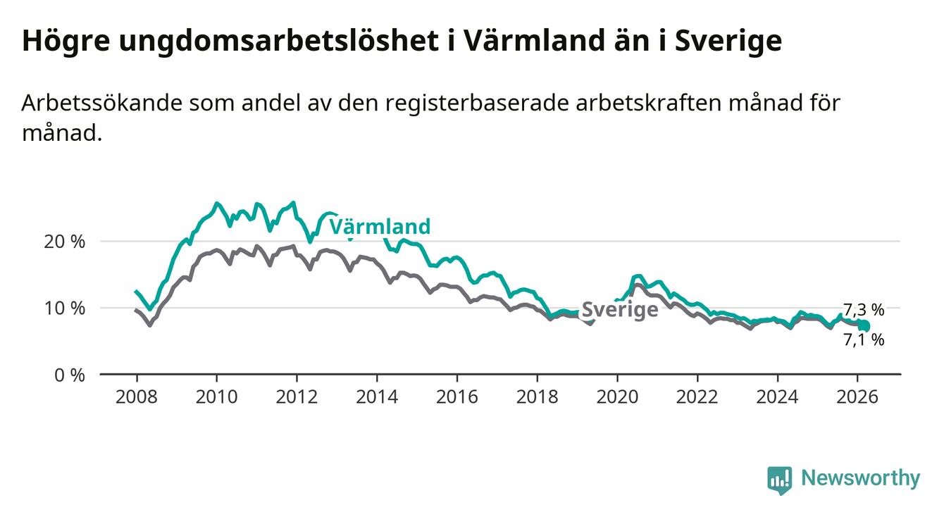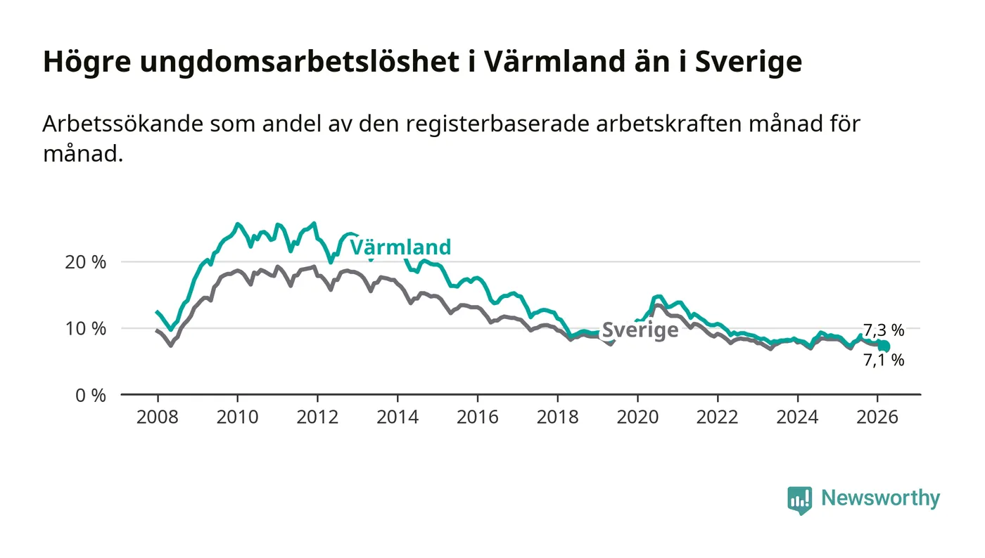 I och med den senaste månadens nedgång har de ungas arbetslöshet i Värmland sjunkit tio månader i följd (ner från 7,3 procent i maj 2025 till 7,3 procent nu).