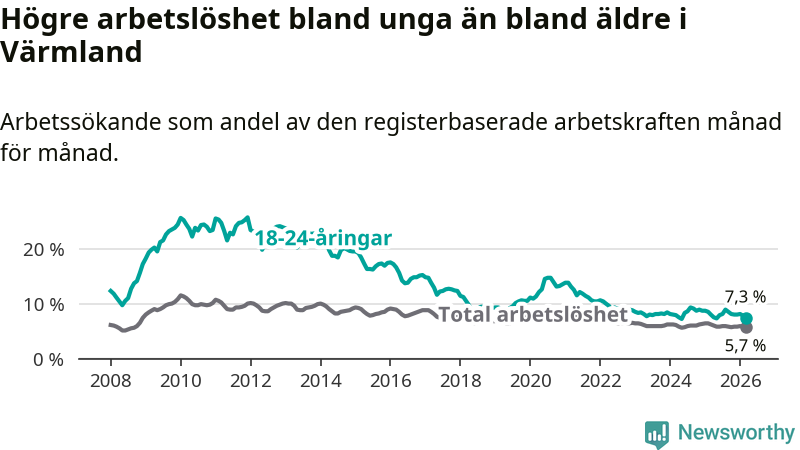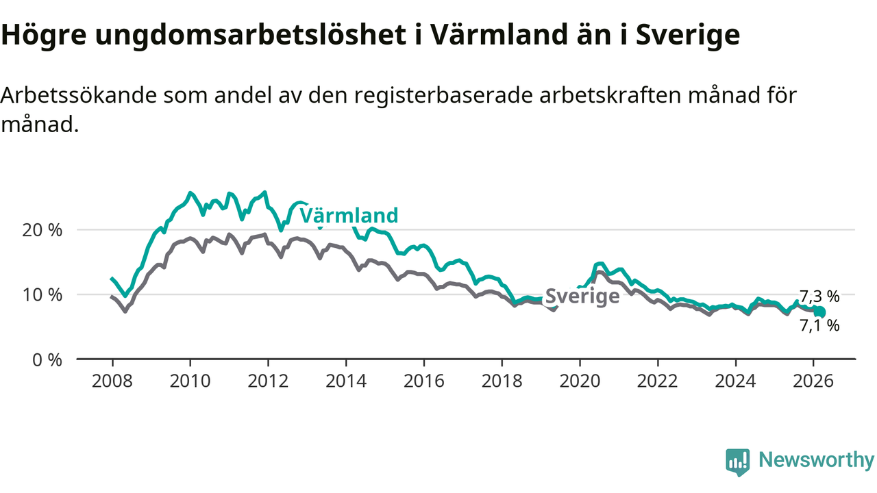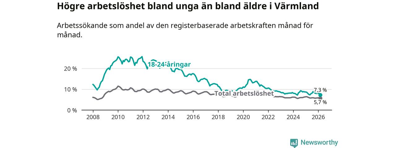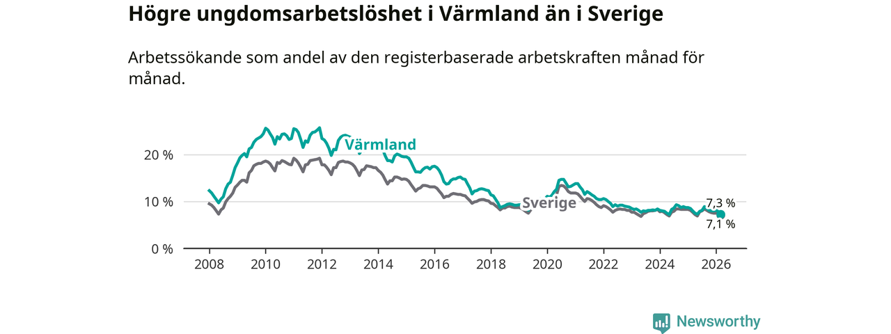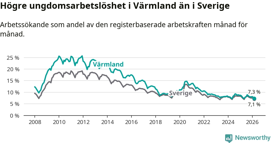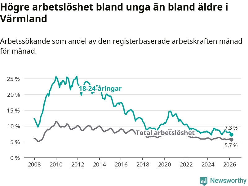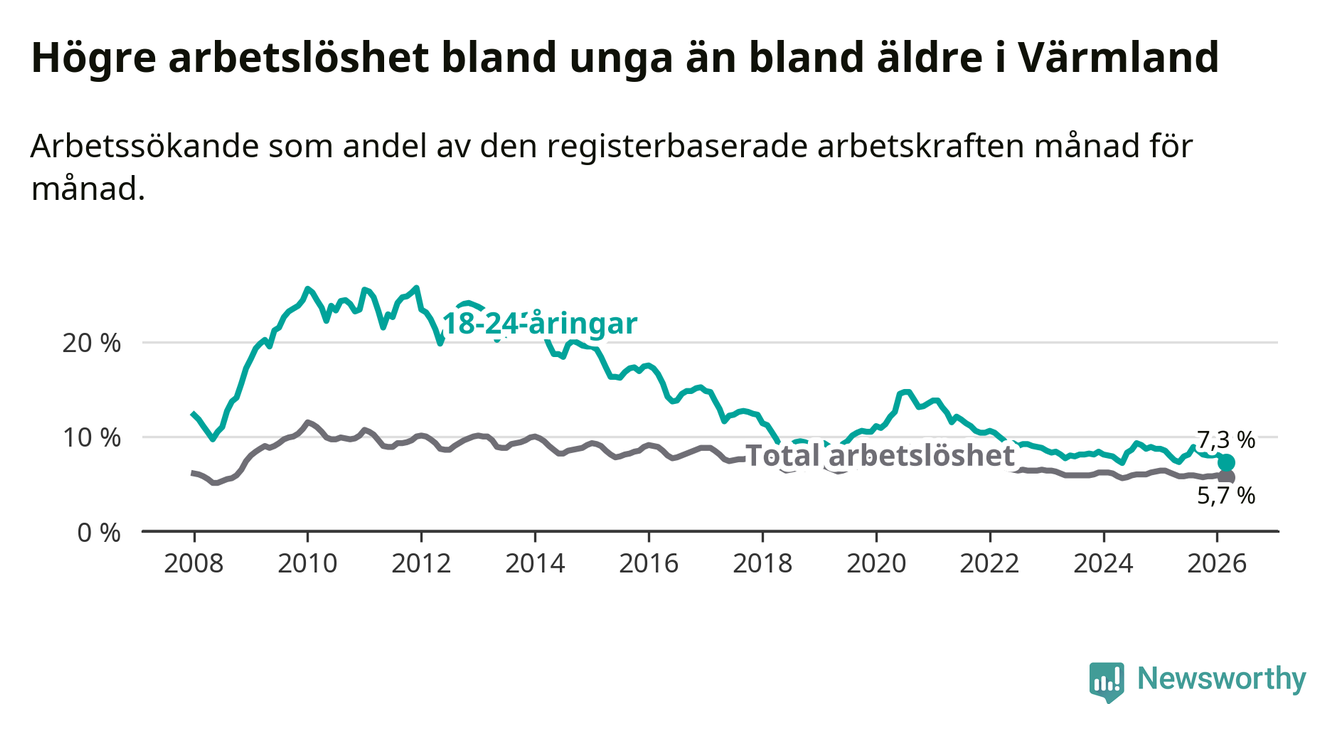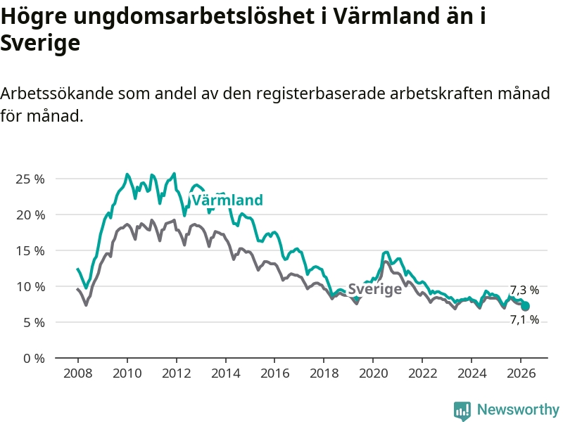 I och med den senaste månadens nedgång har de ungas arbetslöshet i Värmland sjunkit tio månader i följd (ner från 7,3 procent i maj 2025 till 7,3 procent nu).