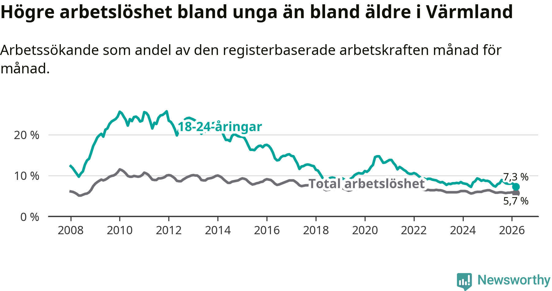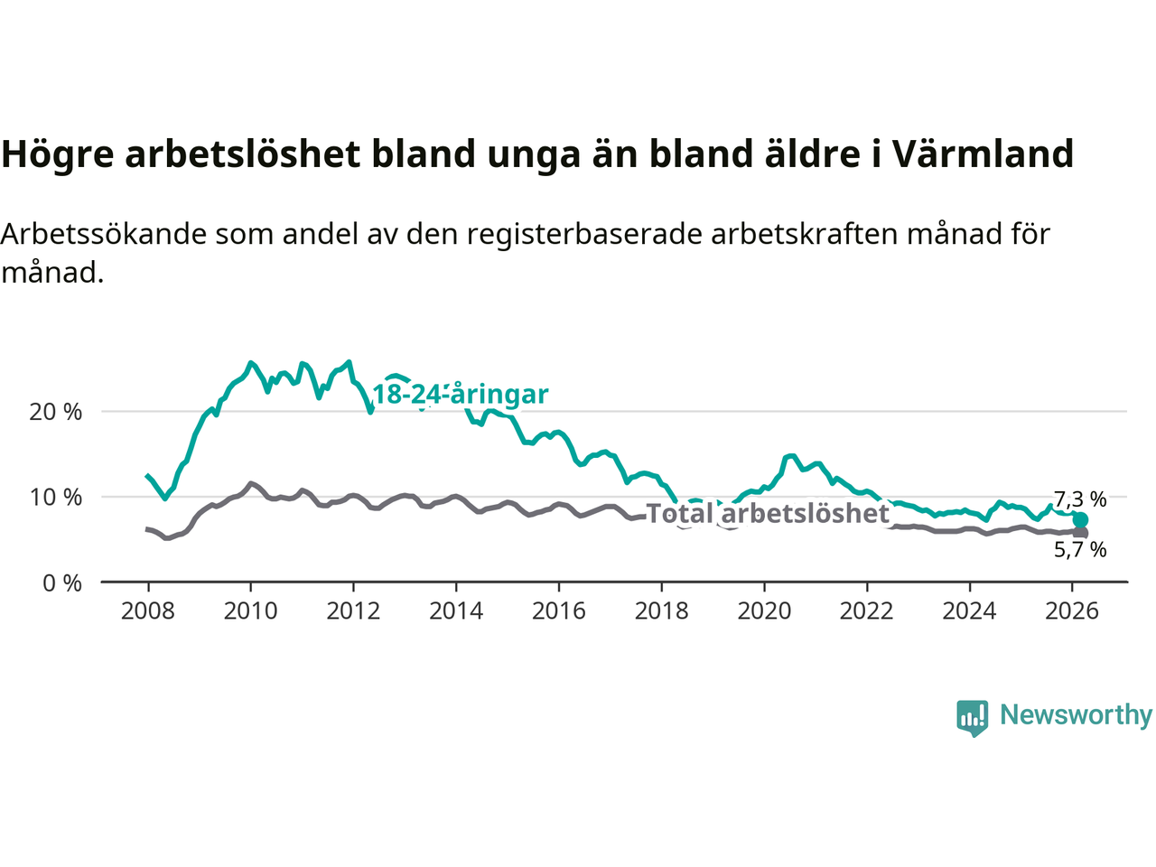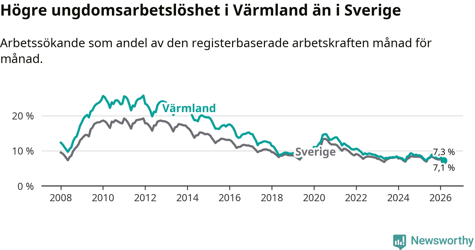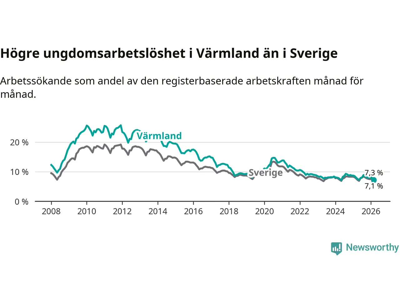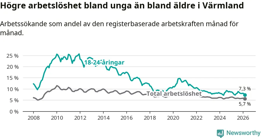 I och med den senaste månadens nedgång har de ungas arbetslöshet i Värmland sjunkit tio månader i följd (ner från 7,3 procent i maj 2025 till 7,3 procent nu).